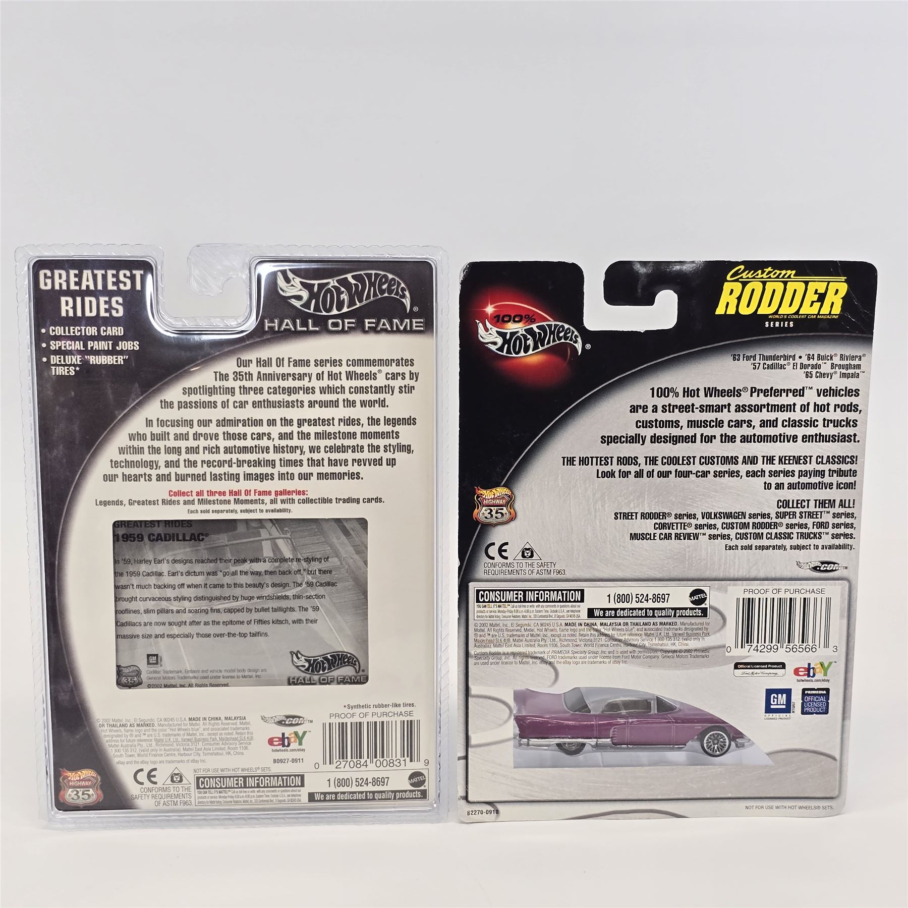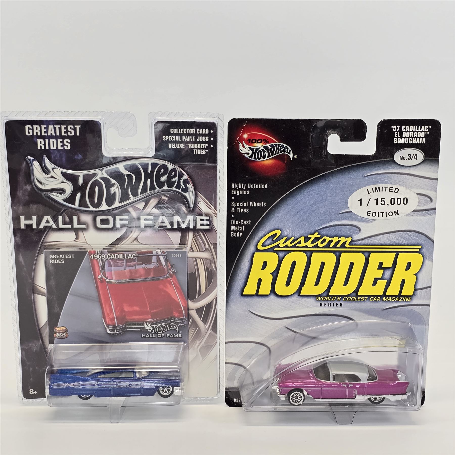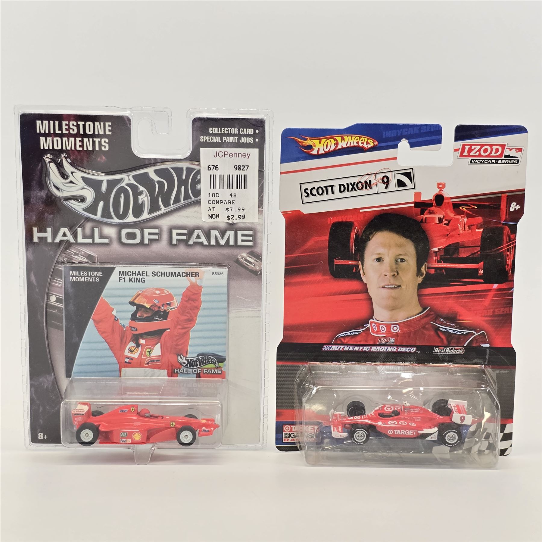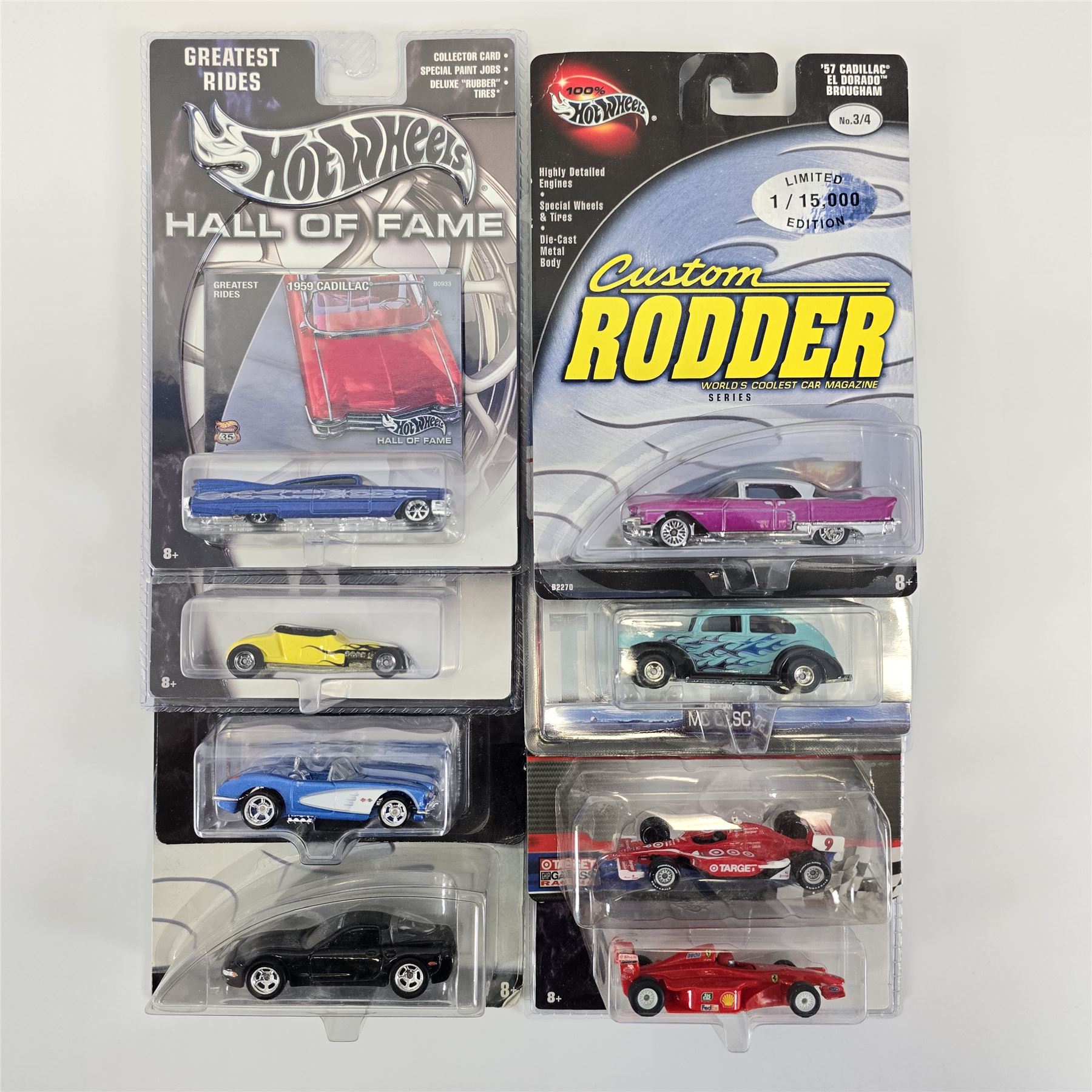 Hot Wheels assorted lot of 8 including, Custom Rodder '57 Cadillac, Hall Of Fame '59 Cadillac, Peterson Hall of Fame Hot Rod, Motor City Classics Fat Fender '40, Scott Dixon Izod Indy car, Michael Schumacher F1 racer, Ultra Hots '58 Corvette and C5 Corvette