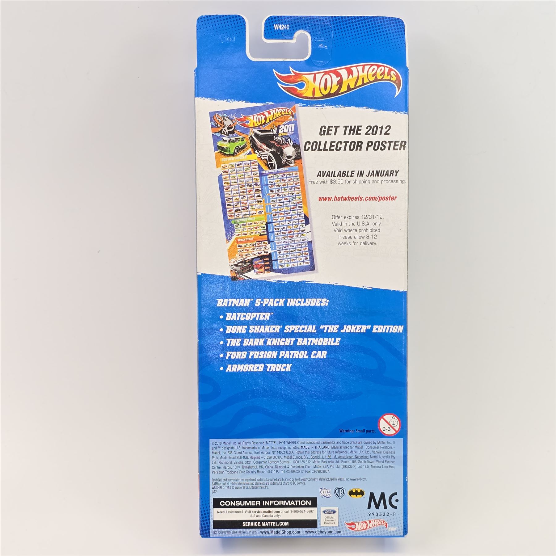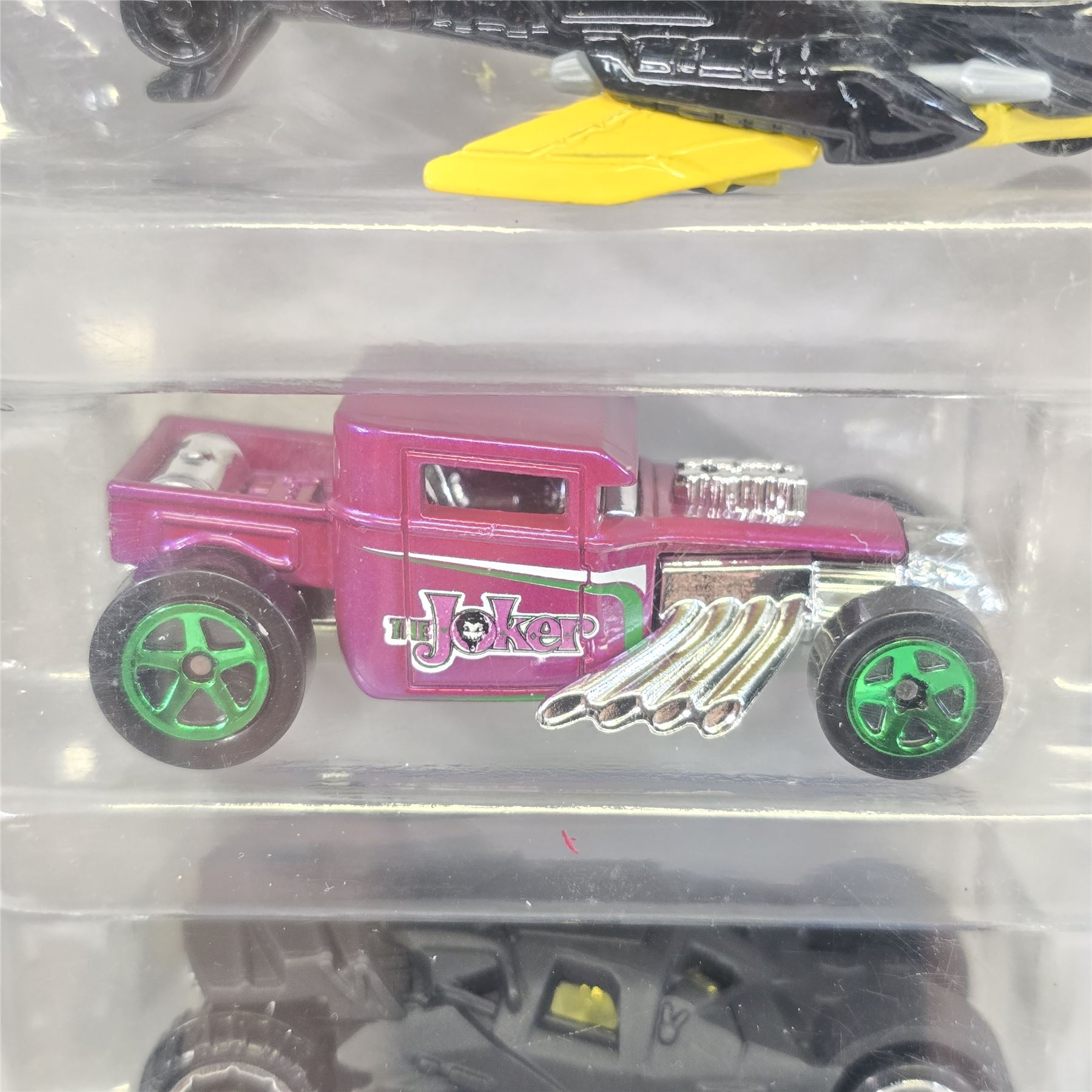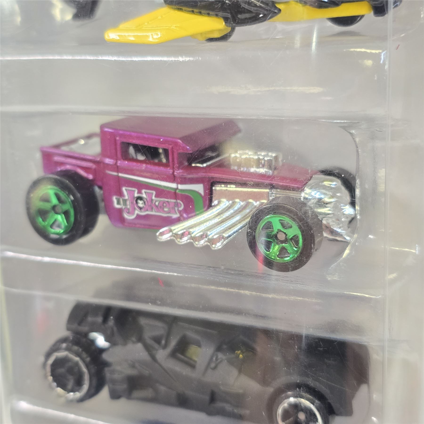 Hot Wheels Dark Knight Batman 5 pack, includes - Joker face variation bone shaker, Batmobile, Bat Copter, Armored Car and Police Cruiser
