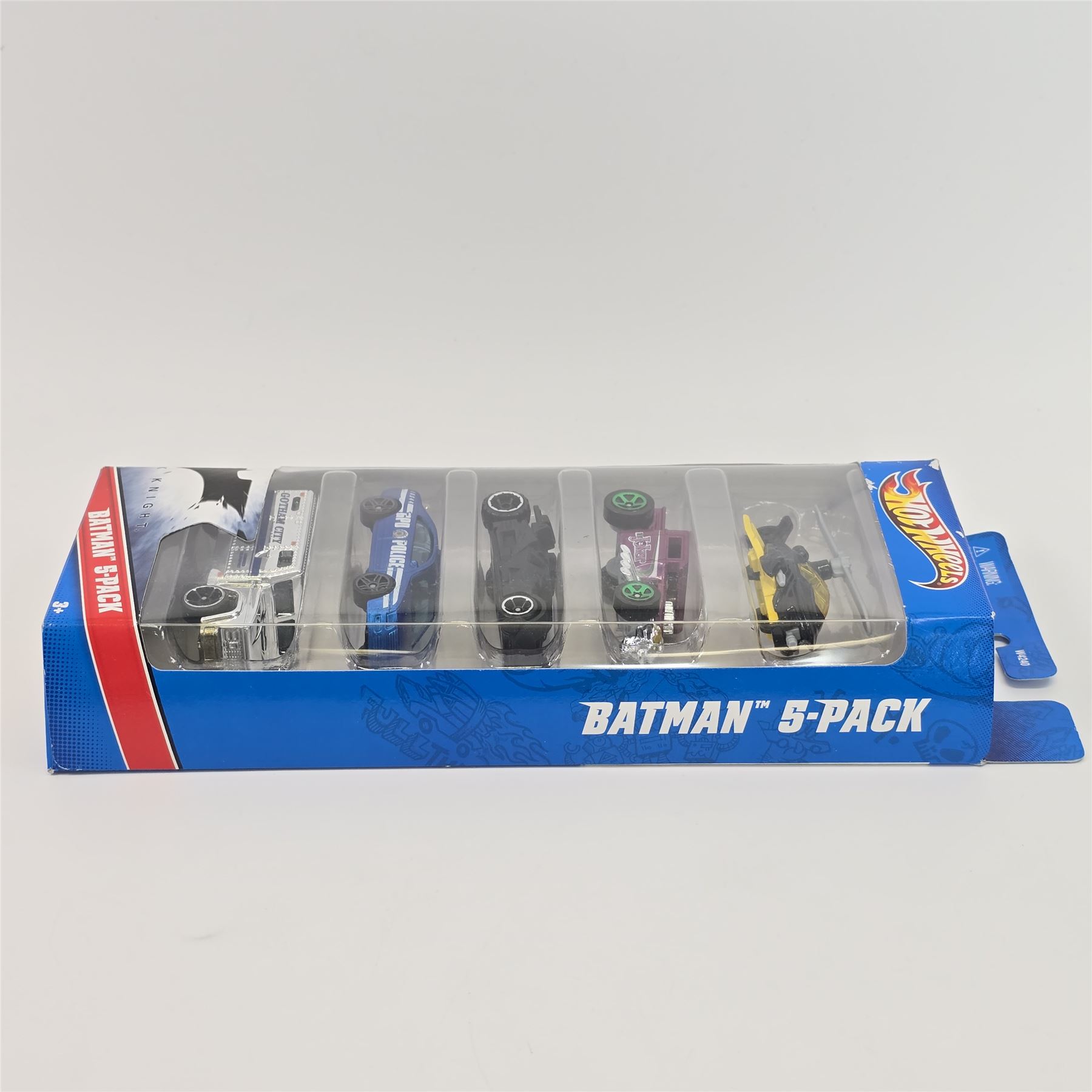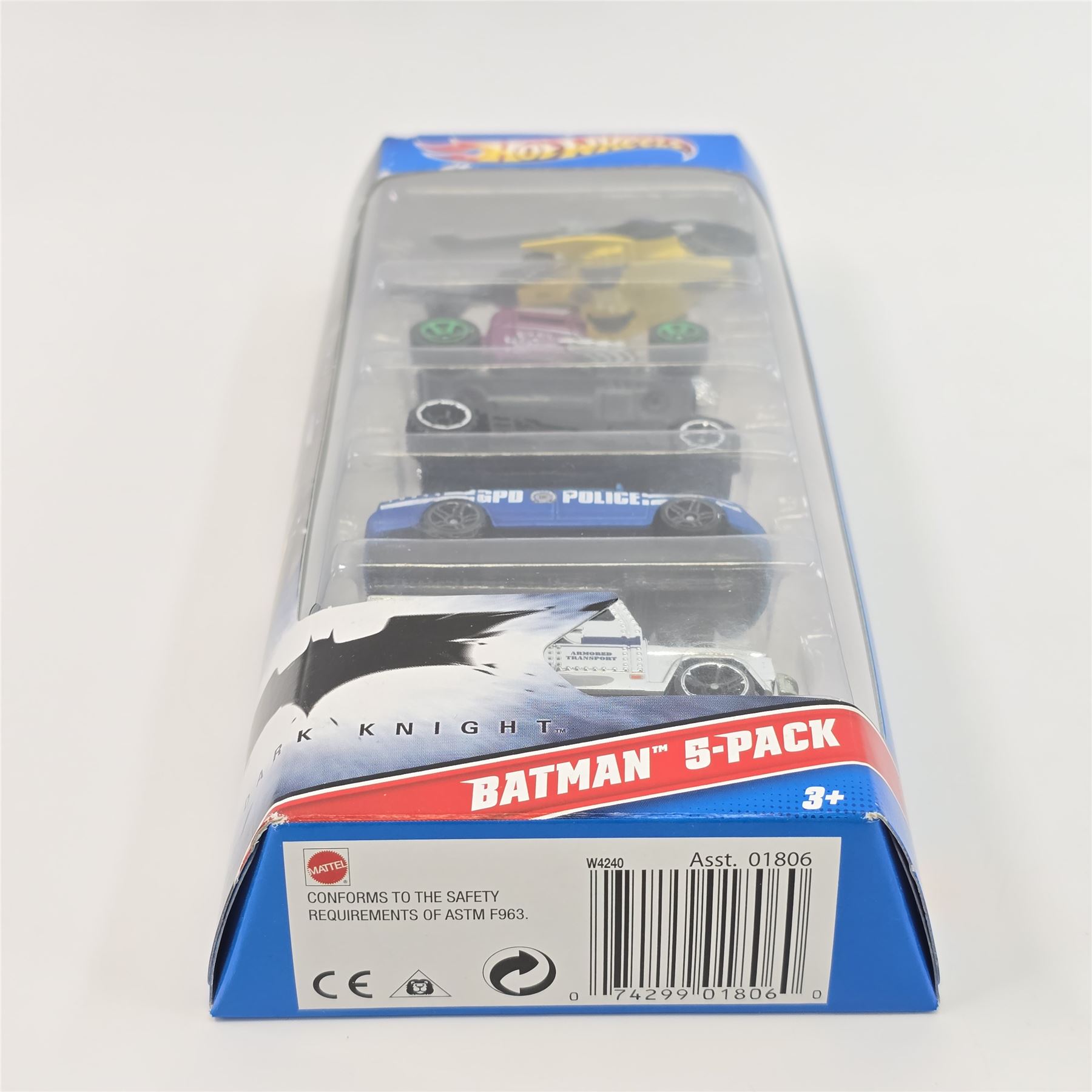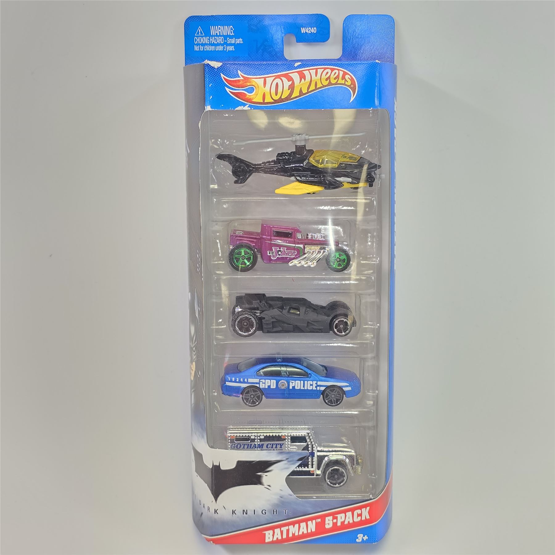 Hot Wheels Dark Knight Batman 5 pack, includes - Joker face variation bone shaker, Batmobile, Bat Copter, Armored Car and Police Cruiser