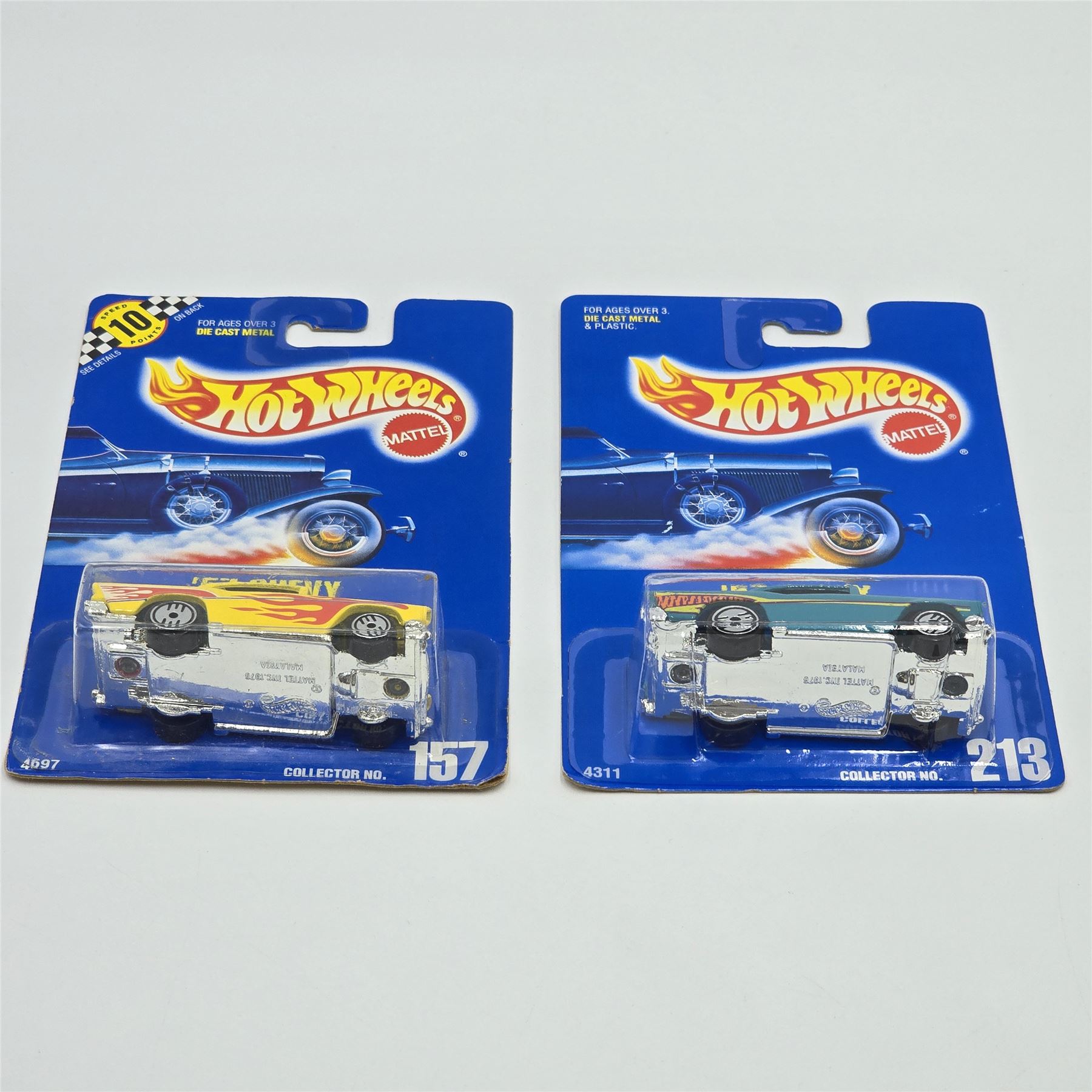 Hot Wheels Blue Card 57 Chevy pair, includes #157 Yellow with UH wheels and #213 Aqua with UH wheels