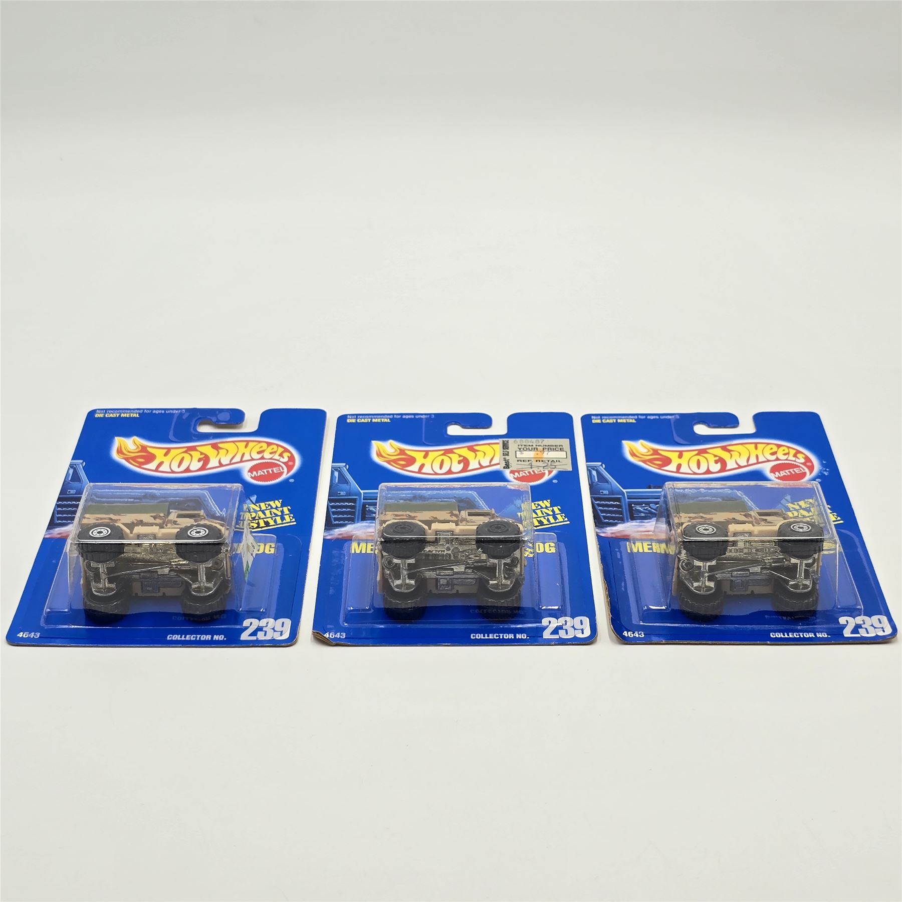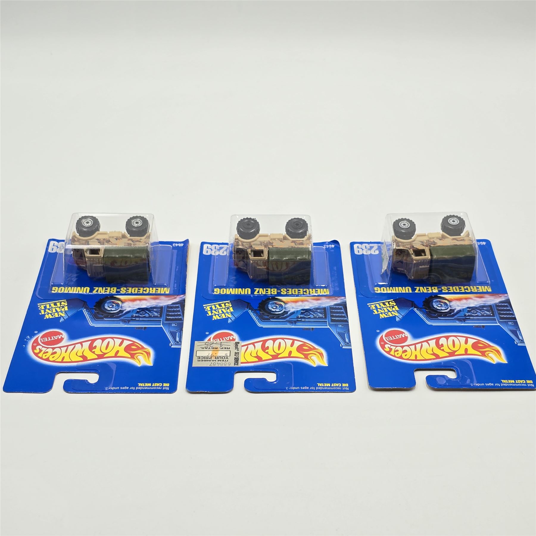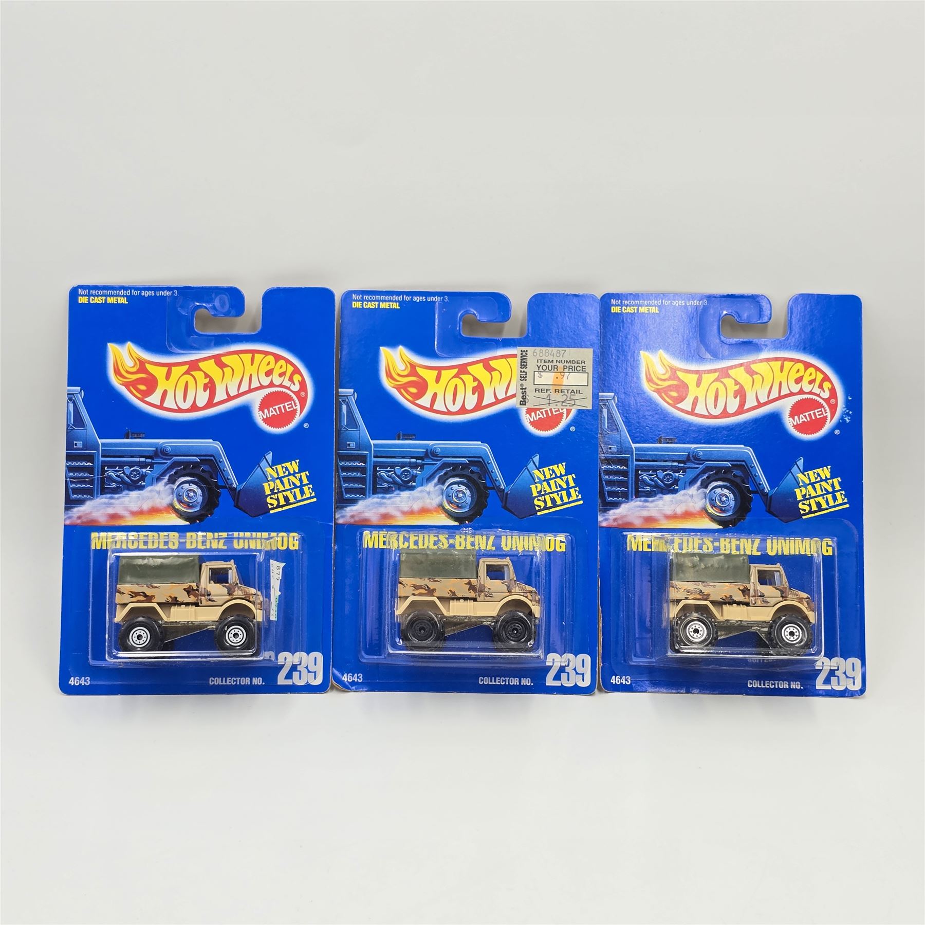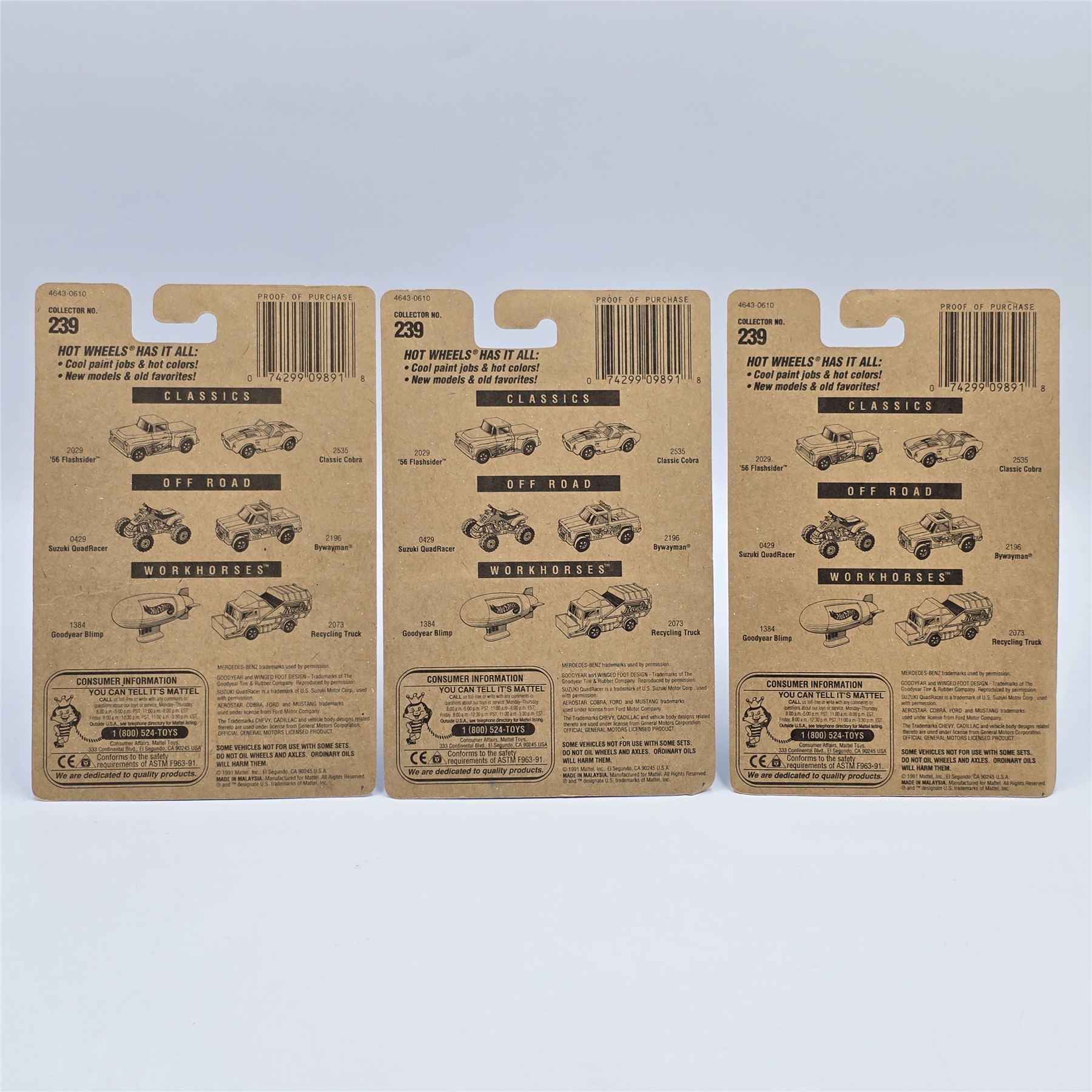 Hot Wheels Blue Card #239 Mercedes Benz Unimog lot of 3, includes - (2) with white CTS wheels and 1 with blacked out wheels, otherwise these appear to have no other differences
