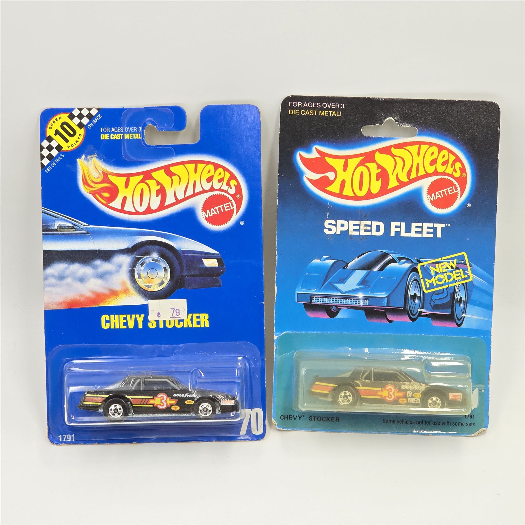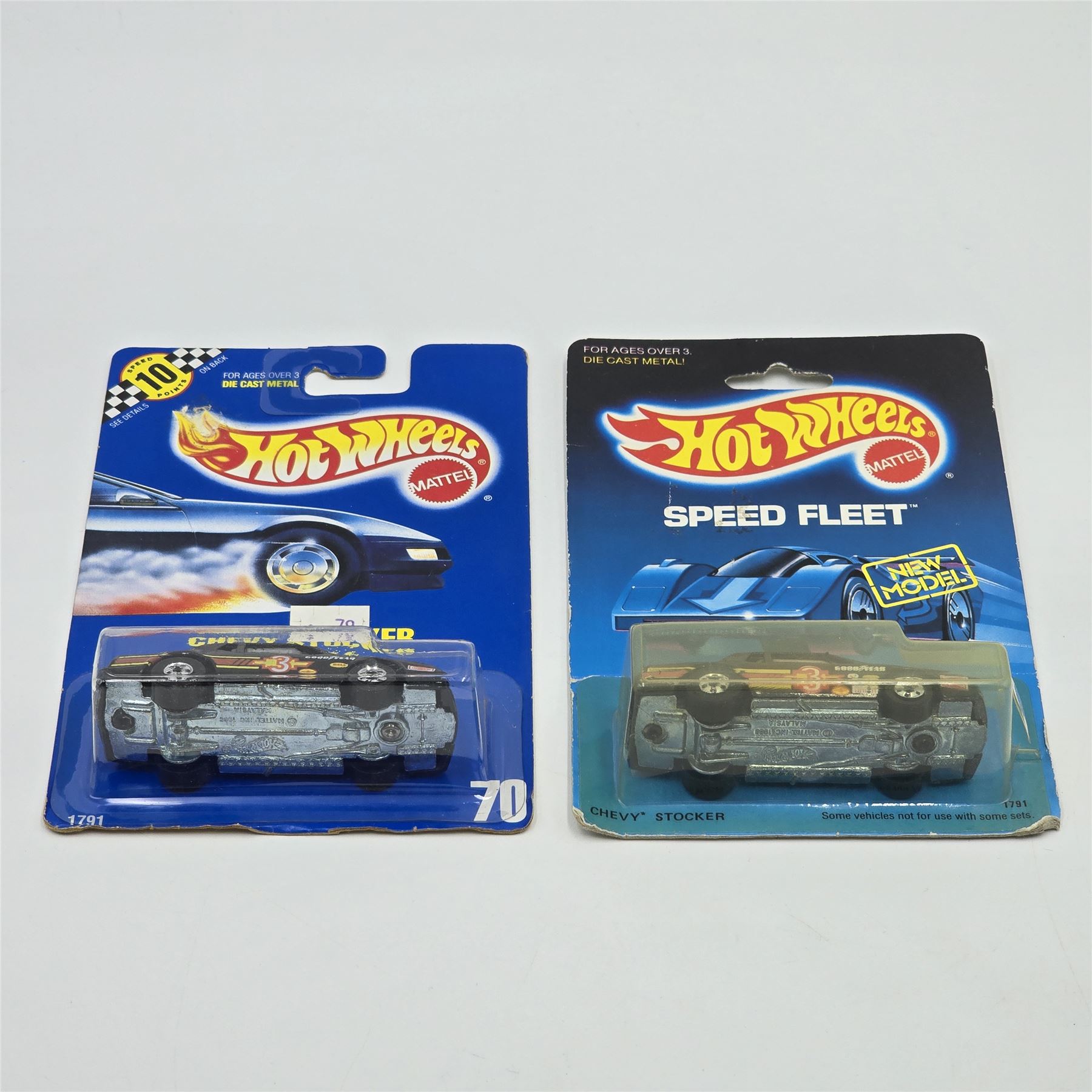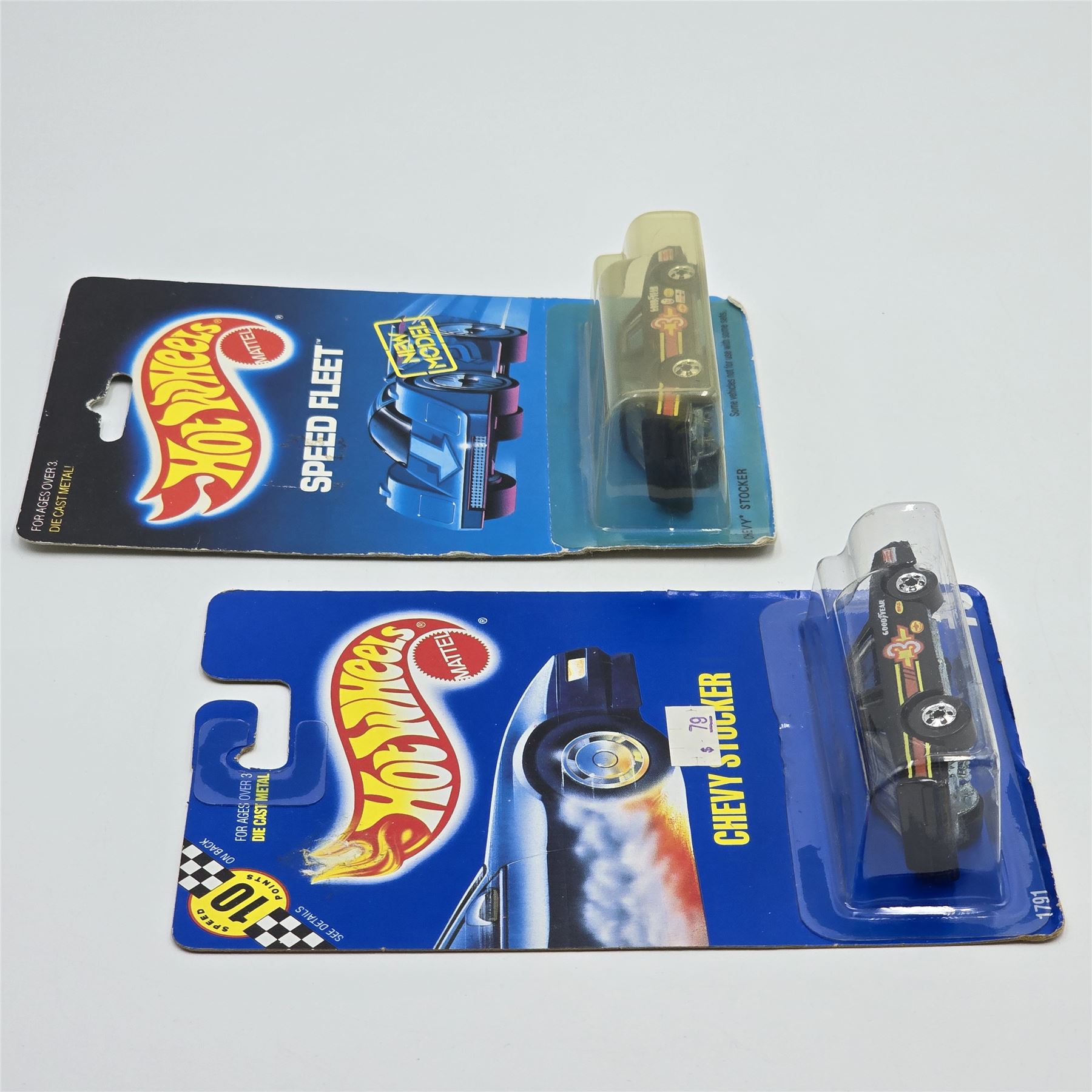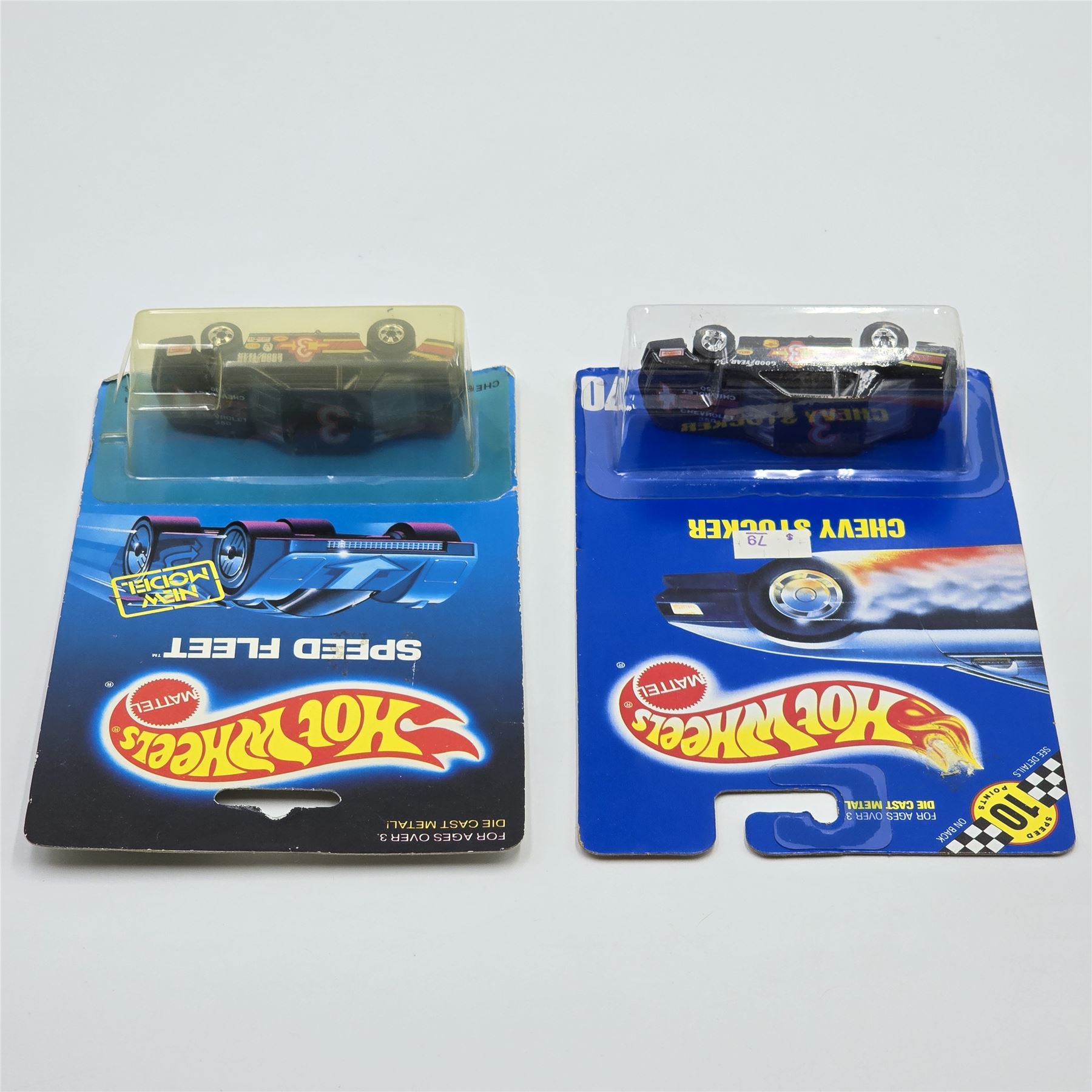 Hot Wheels Chevy Stocker pair, one on Blue Card #70 the other on a Speed Fleet Card