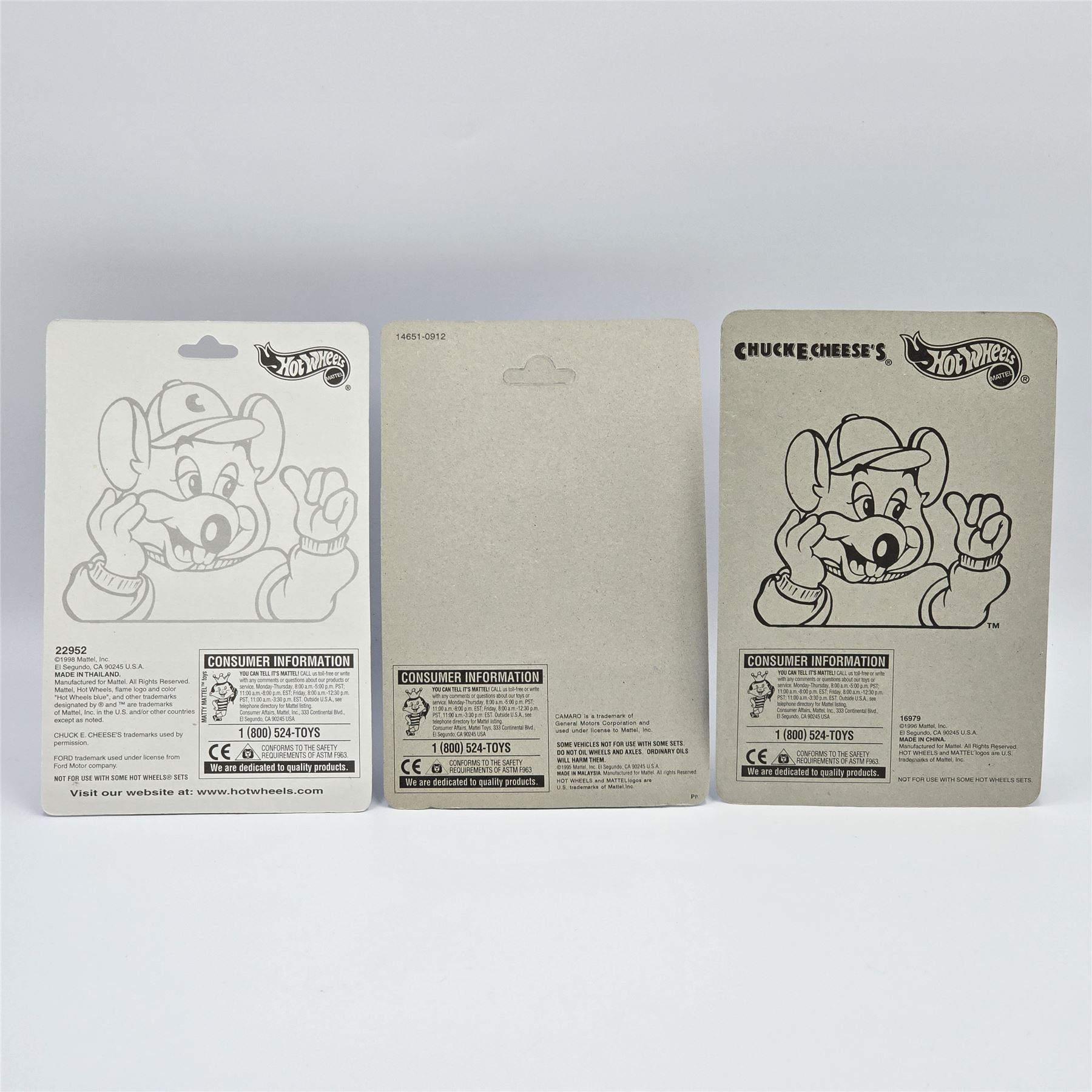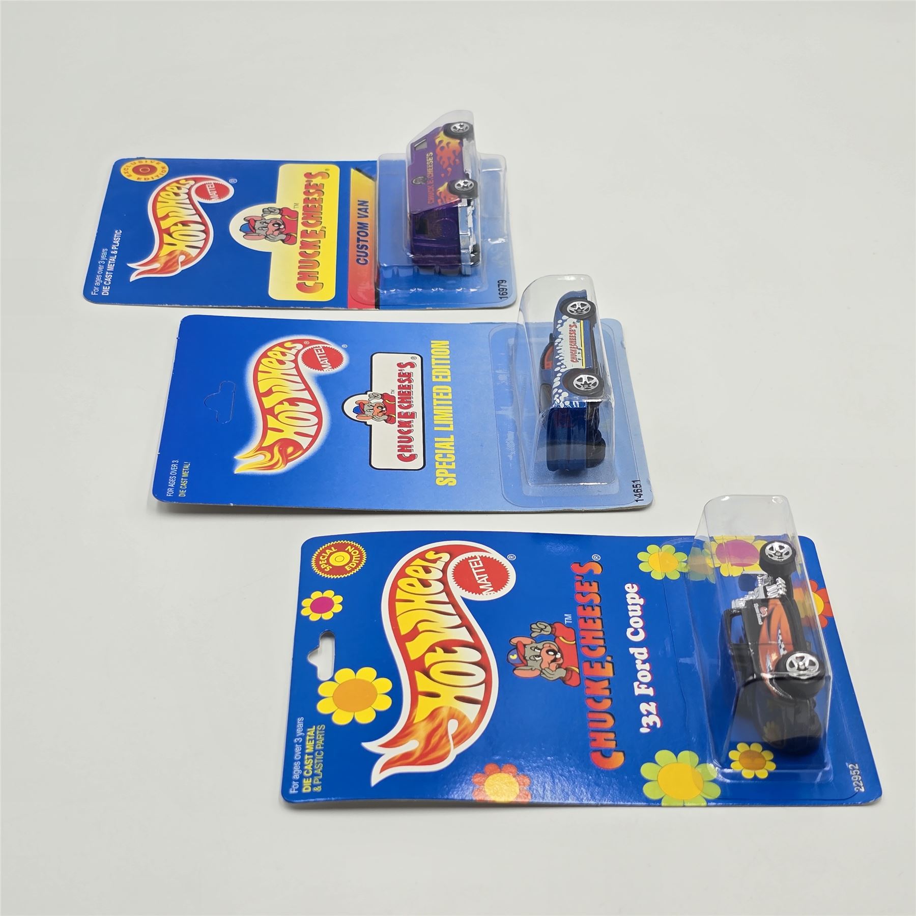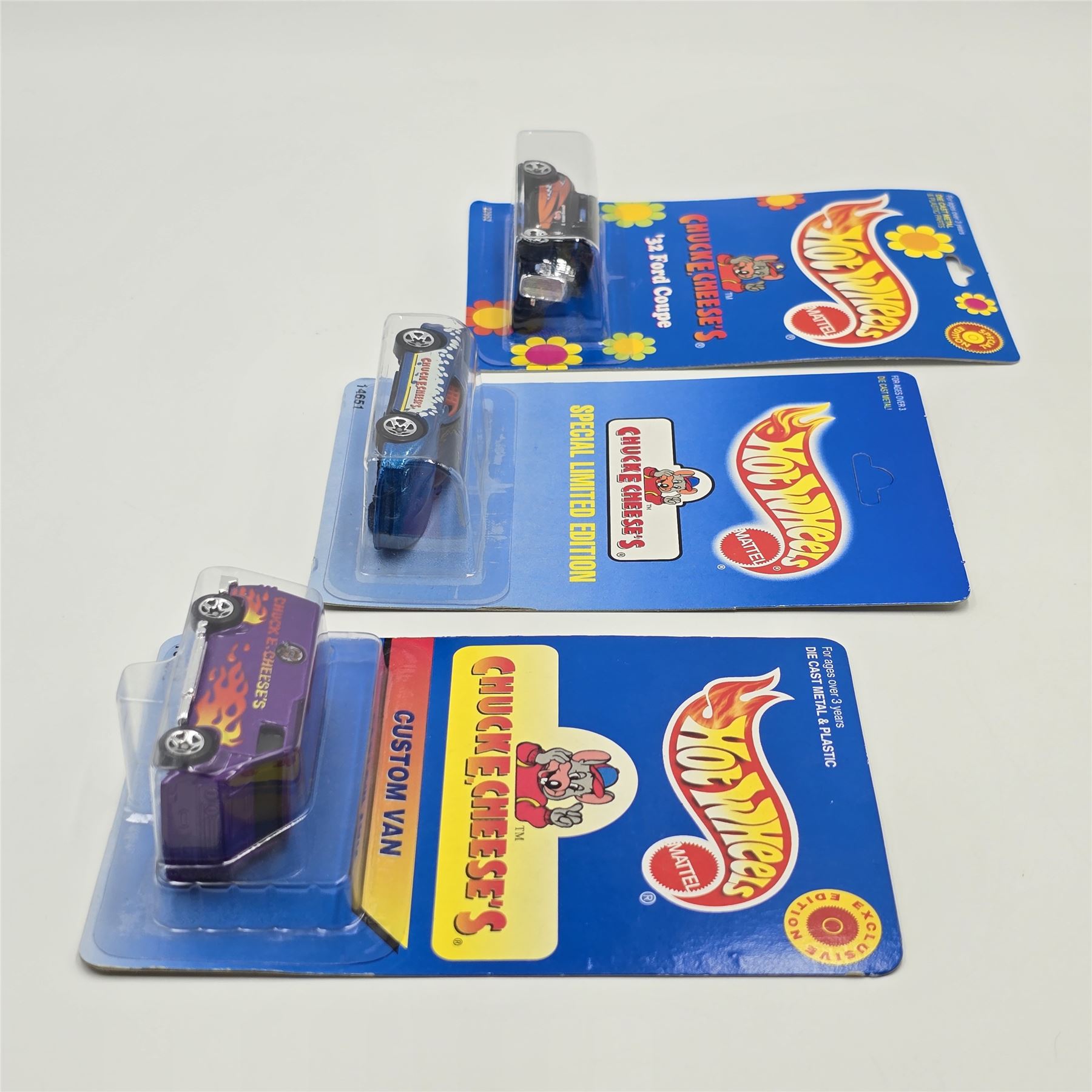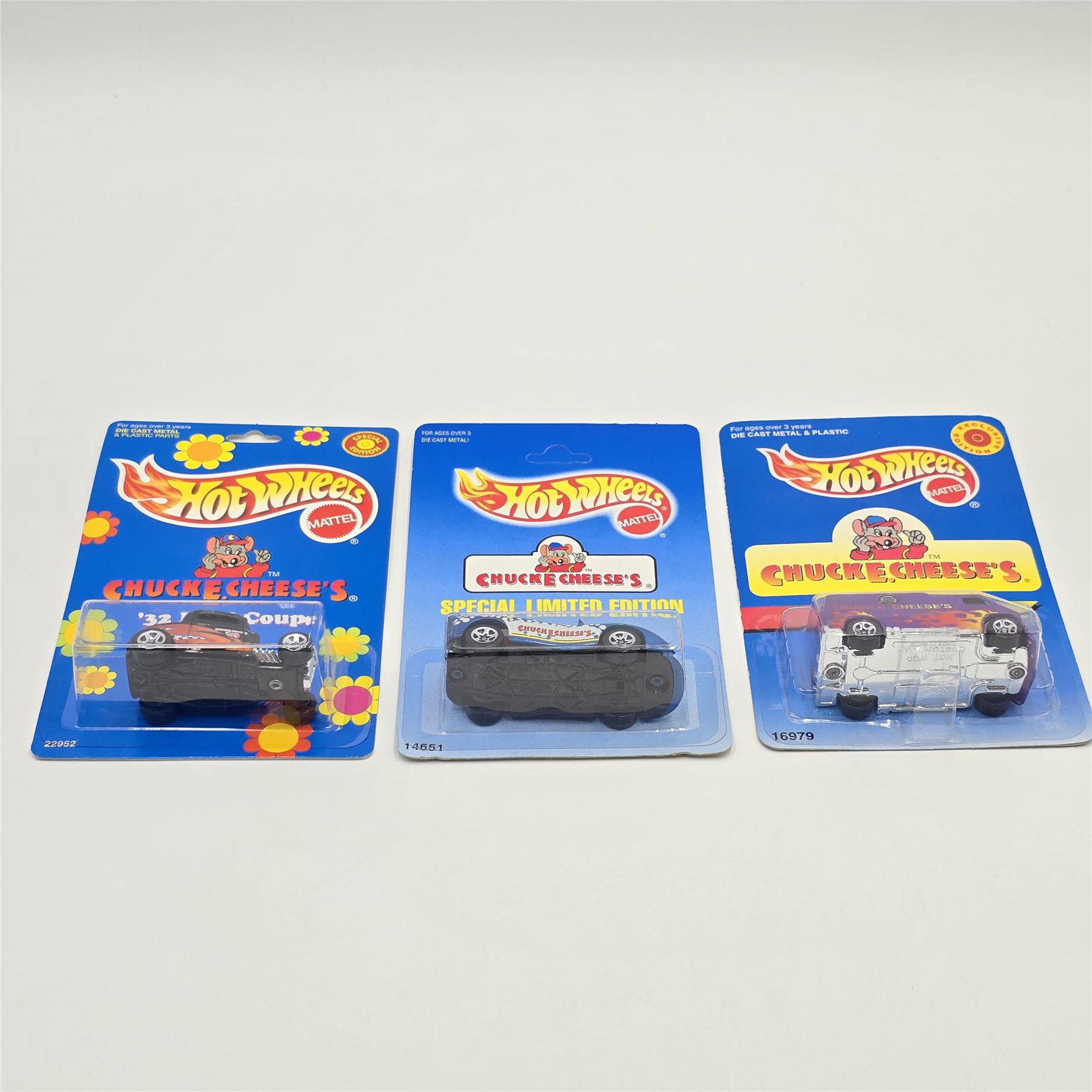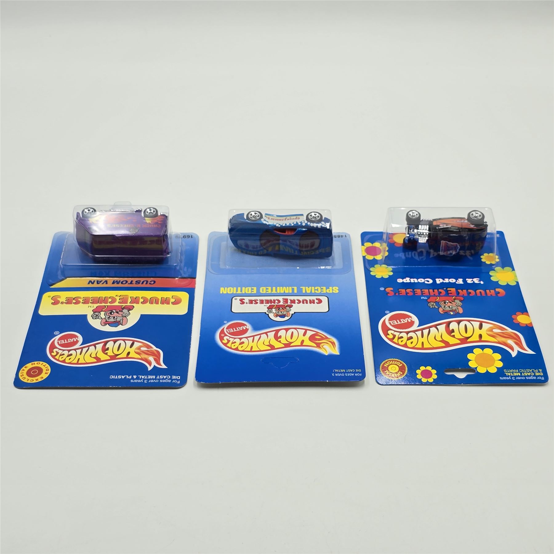 Hot Wheels Chuck-E-Cheese trio including - 32 Ford coupe, Camaro and Custom Van