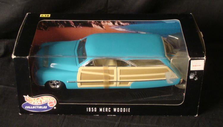 Hot Wheels Collectables 1950 Merc Woodie 1:18 scale car * There is some creases on the box The car is in its original box 1950 Merc Woodie * Nothing screams "American classic" like a Woodie - and our 1950 Merc is the king of cool custom cruisers. It has been tailor-made from its "frenched" headlights to its cruise skirts. The top has been chopped and the body slammed. Behind that grille roars a fuel-injected mill capable of getting that surfboard into the water before the sets flatten out. If you have wood grain on your brain, you'll love our 1950 Merc Woodie *