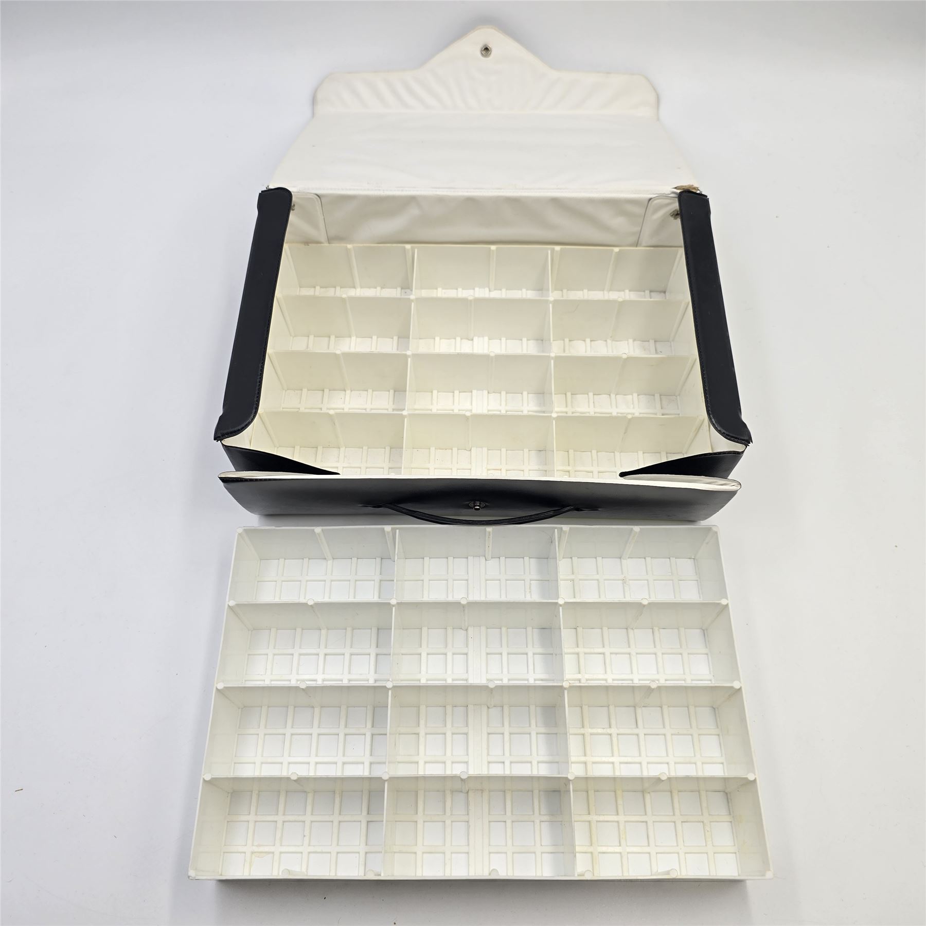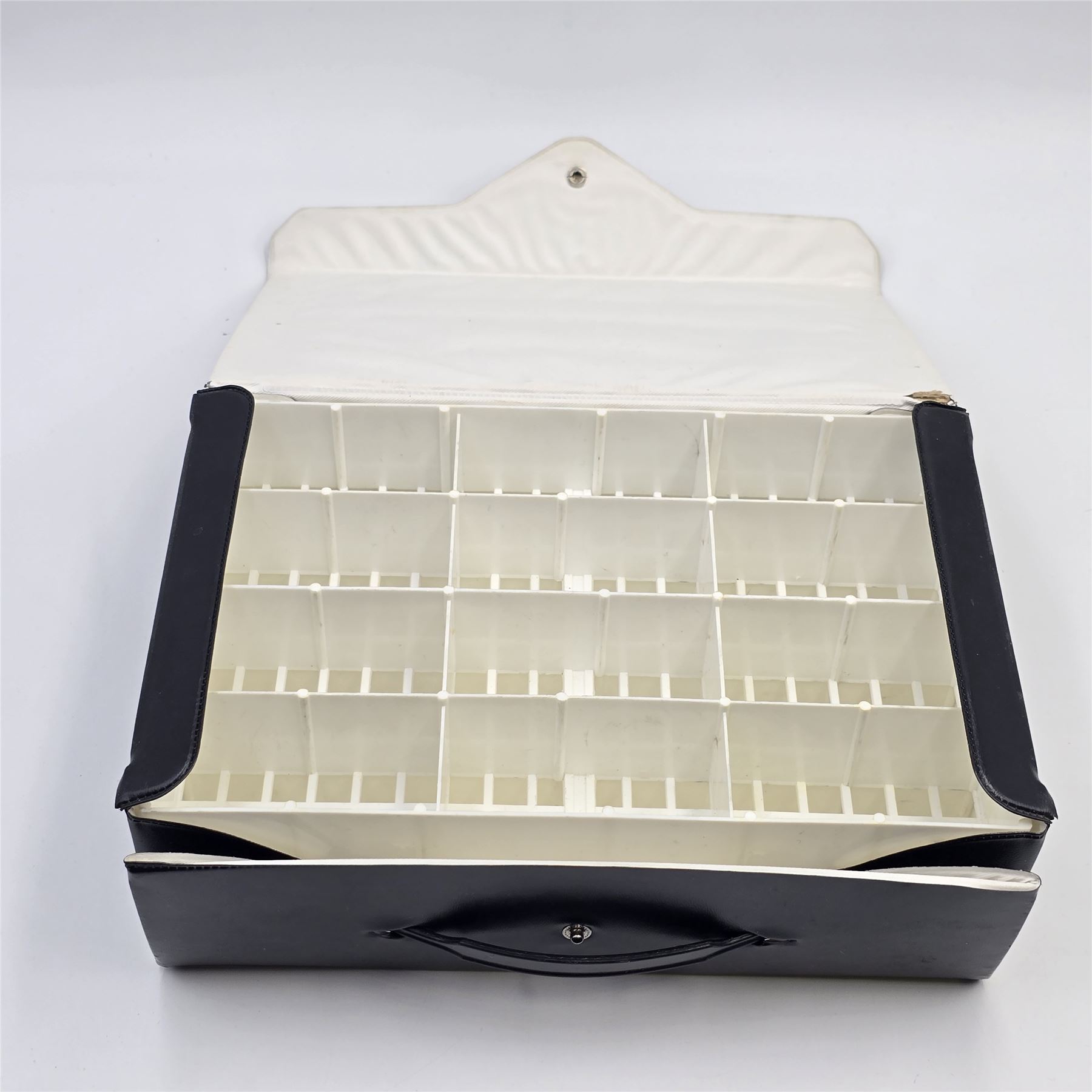 This case has 2 clean, bright white trays with no issues of note, the case itself is clean with a few small splits in the vinyl at the inner hinges, outside is nice, has some minor scuffing in spots, but overall very nice.