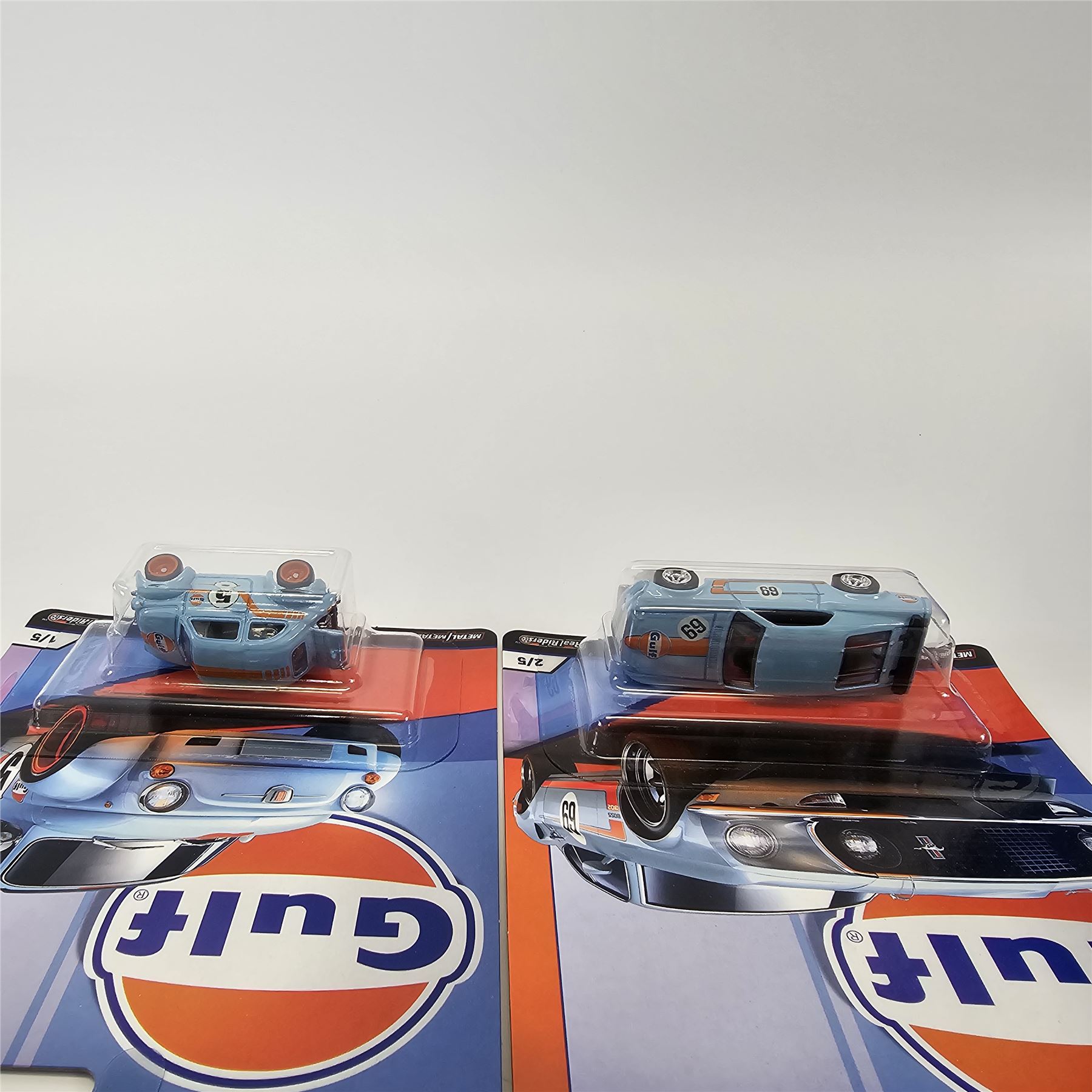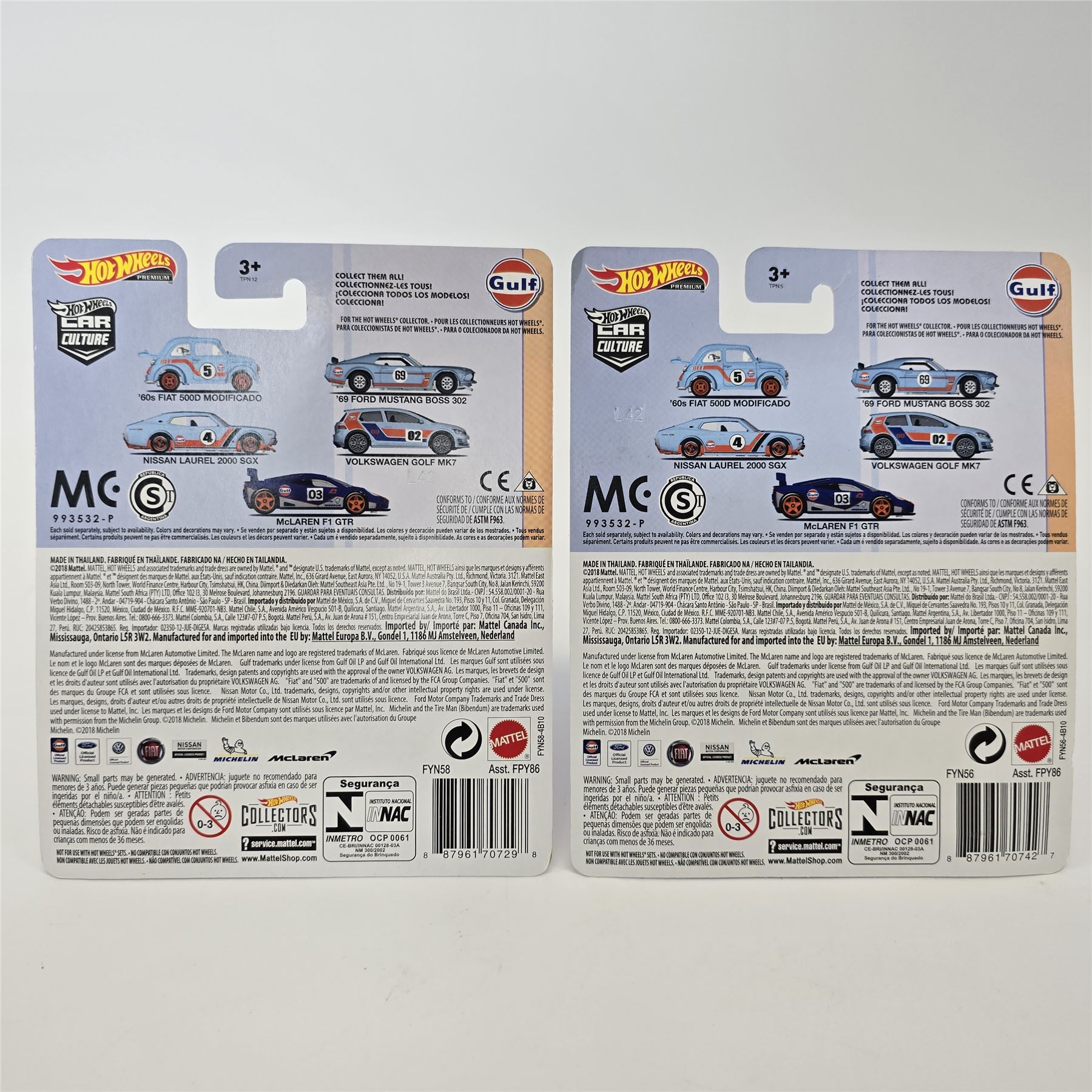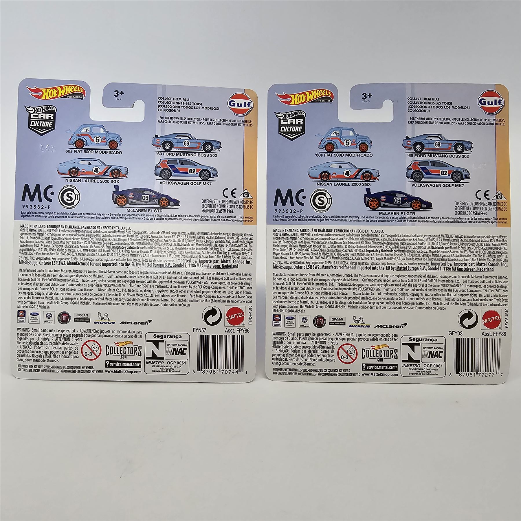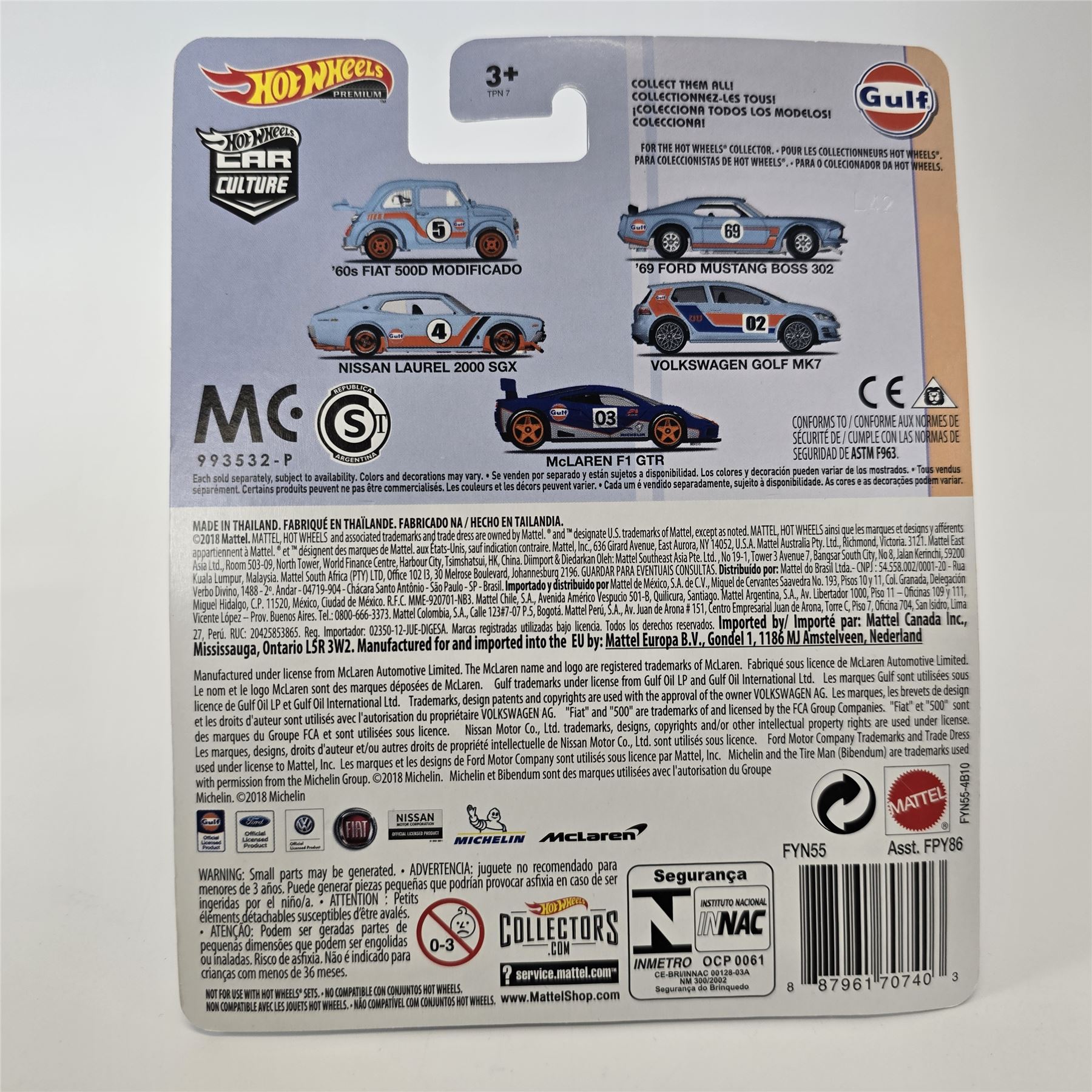 Complete set of 5 Hot Wheels Gulf Premium cars, includes: VW Golf MK7, '69 Ford Mustang Boss Hoss 302, McLaren F1 GTR, 60's FIAT 500D Modificado and Nissan Laurel 2000 SGX