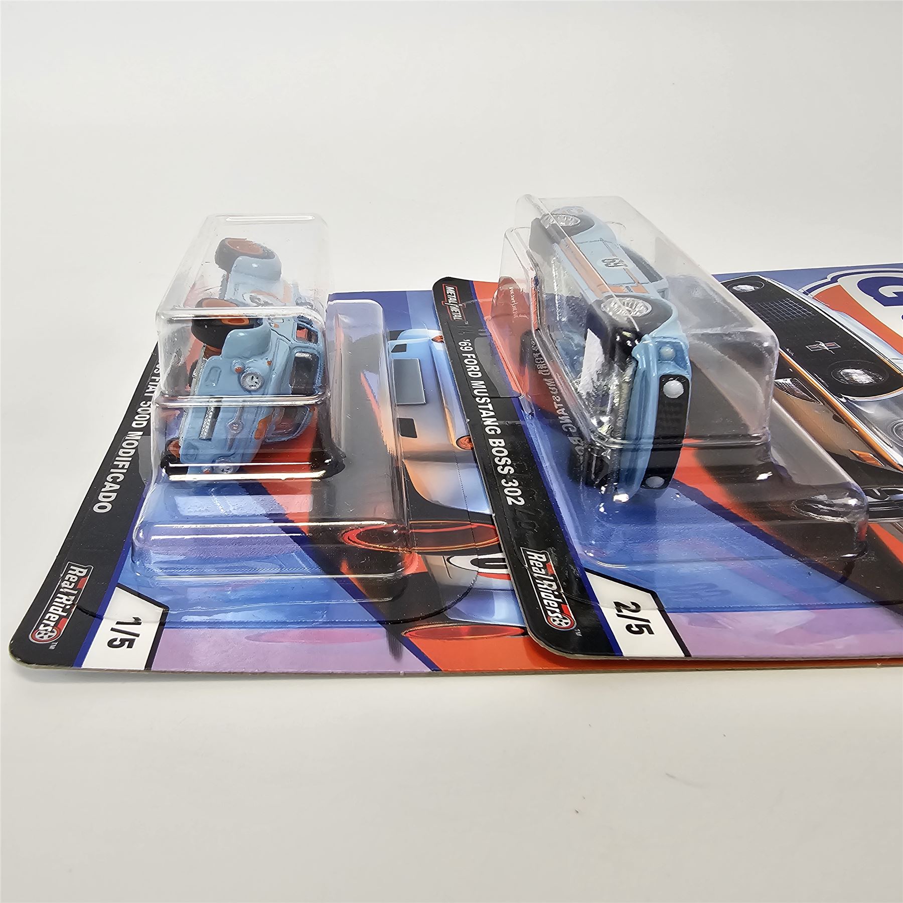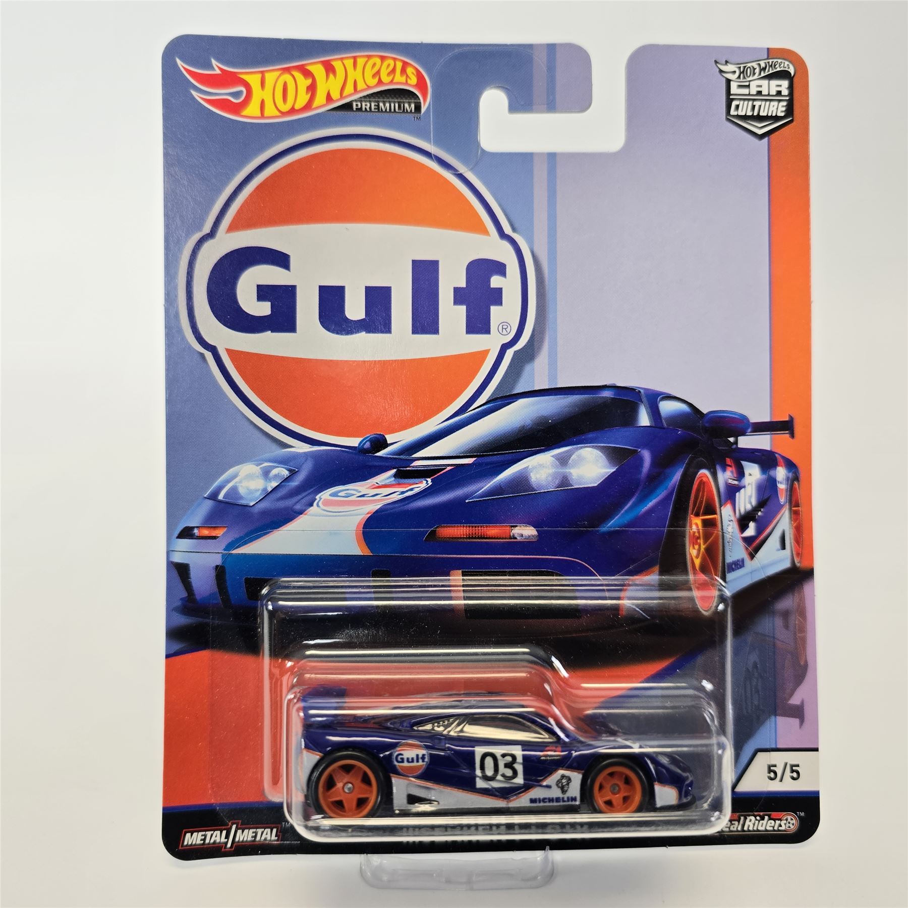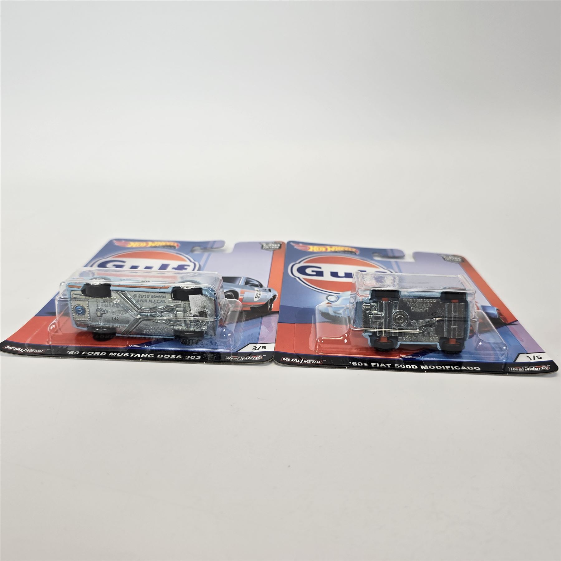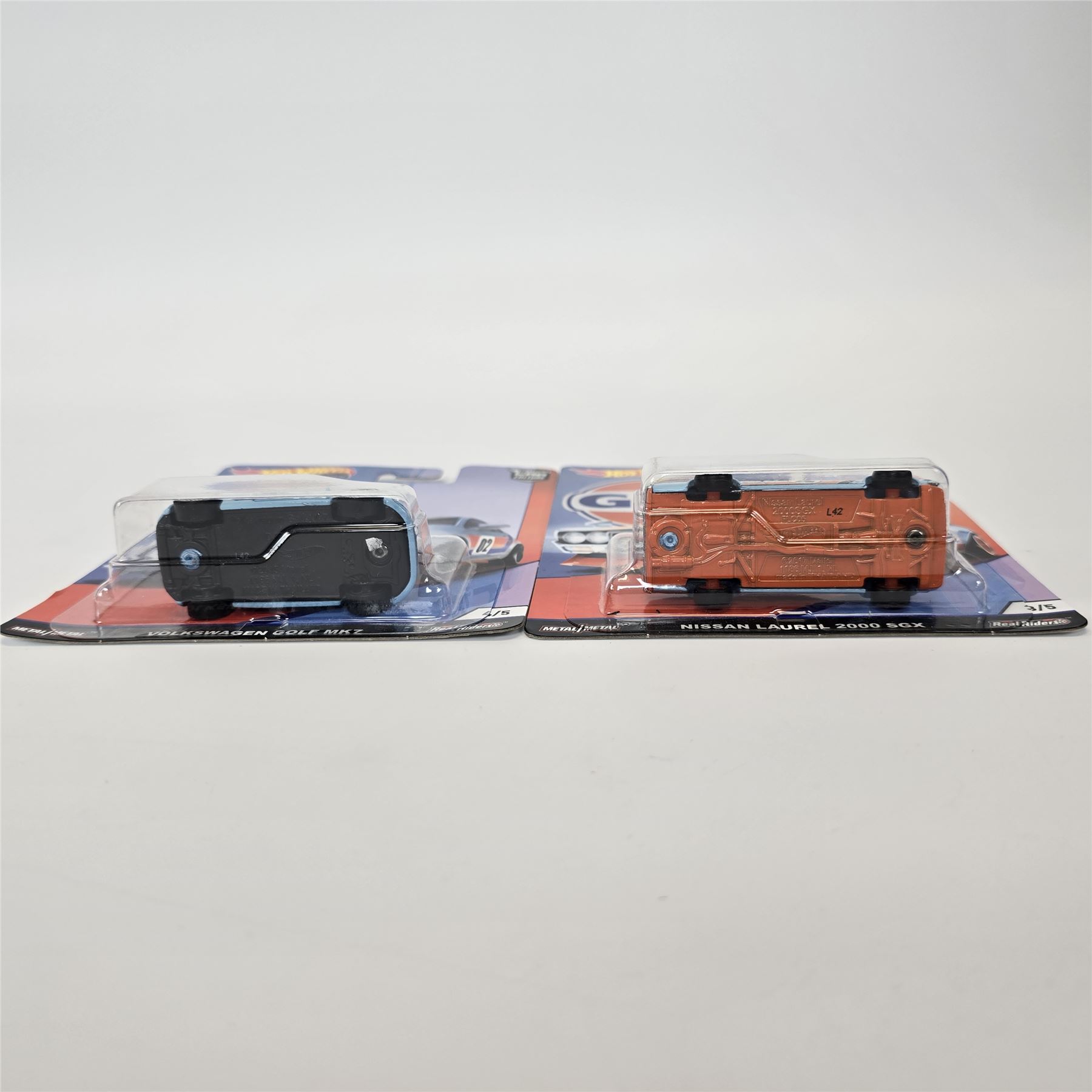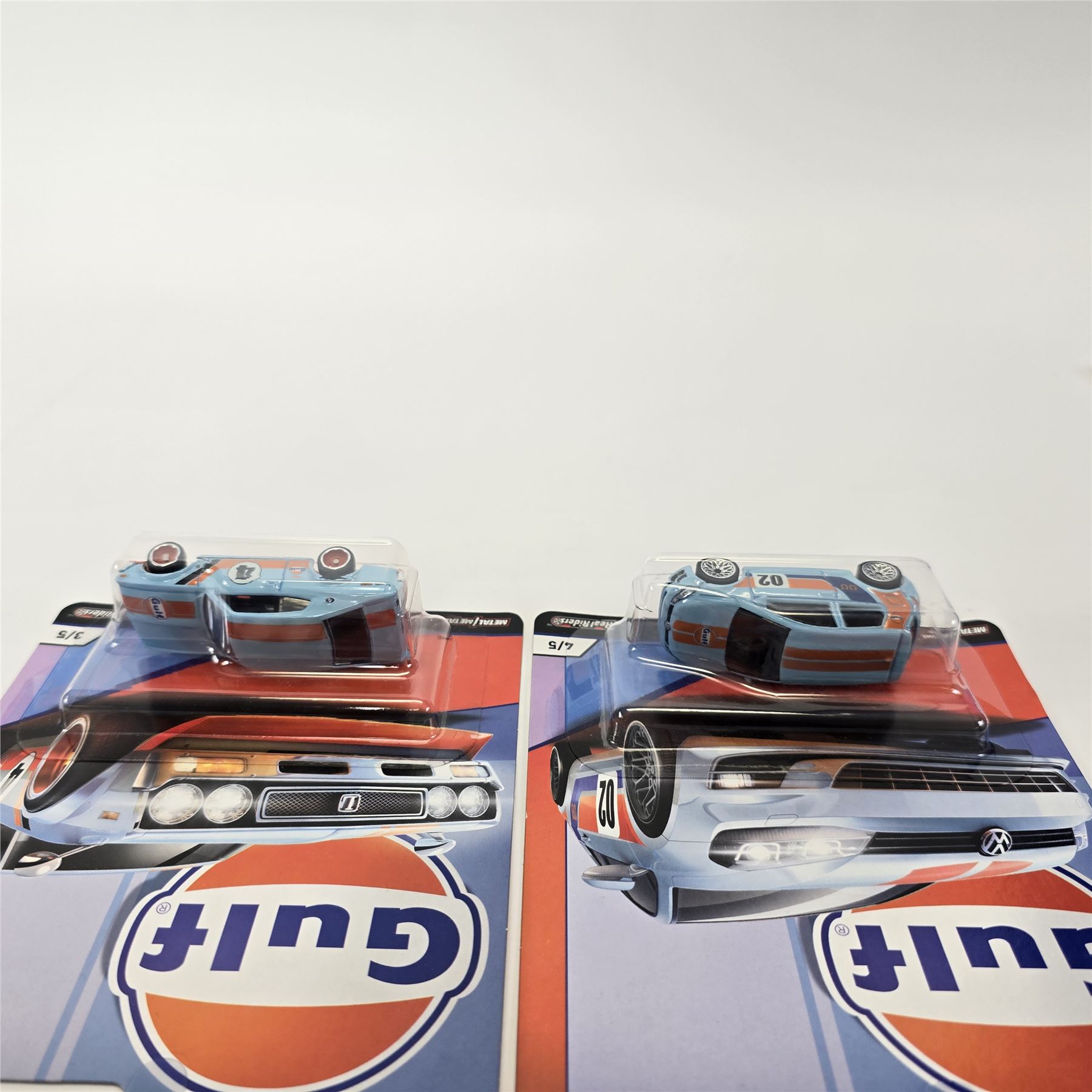 Complete set of 5 Hot Wheels Gulf Premium cars, includes: VW Golf MK7, '69 Ford Mustang Boss Hoss 302, McLaren F1 GTR, 60's FIAT 500D Modificado and Nissan Laurel 2000 SGX
