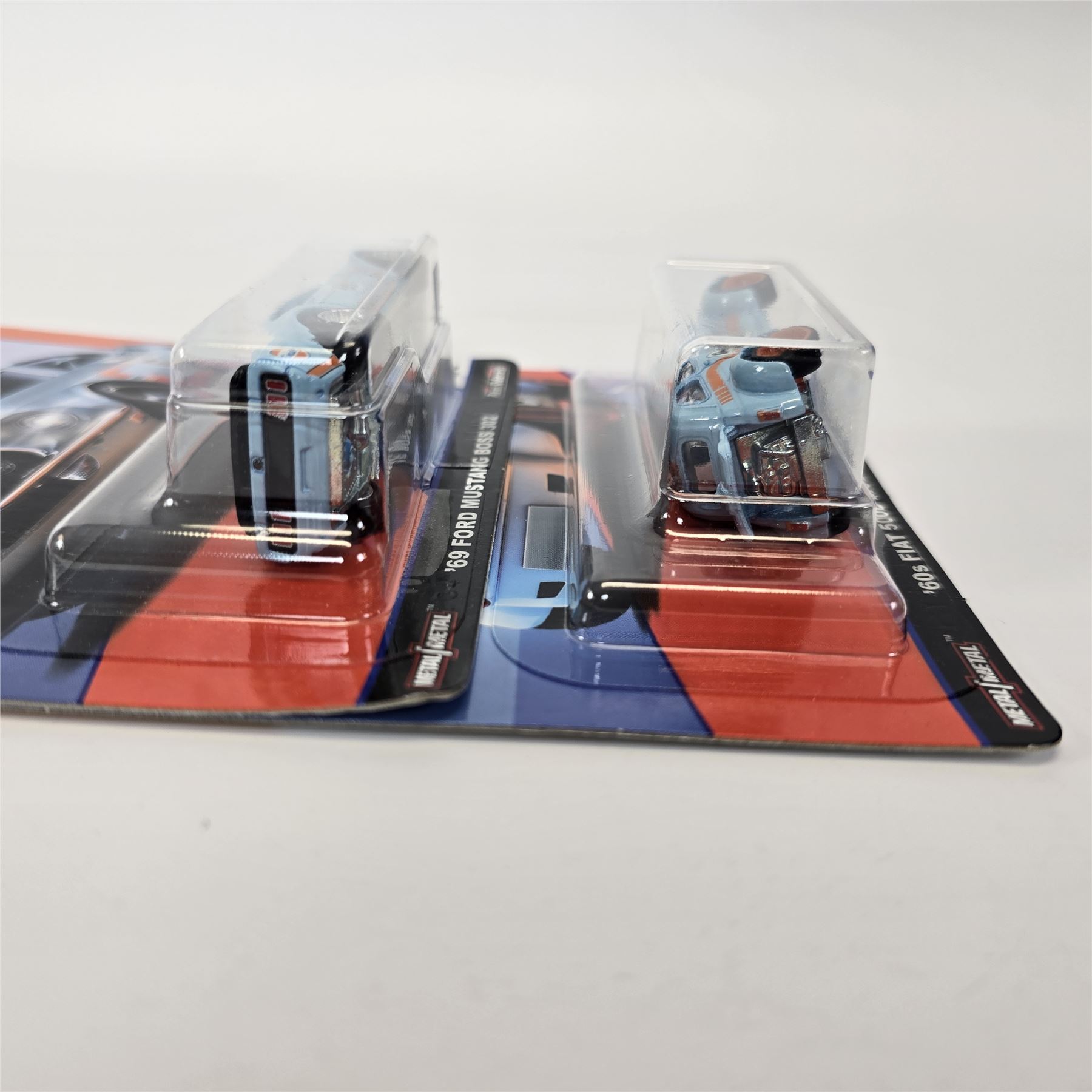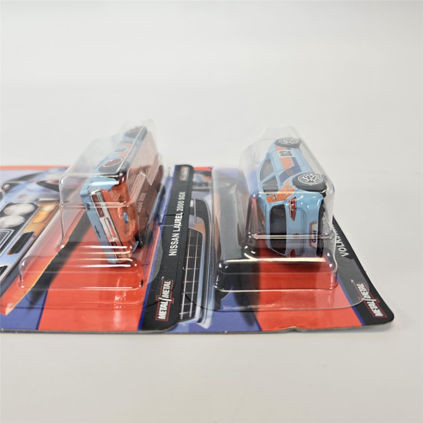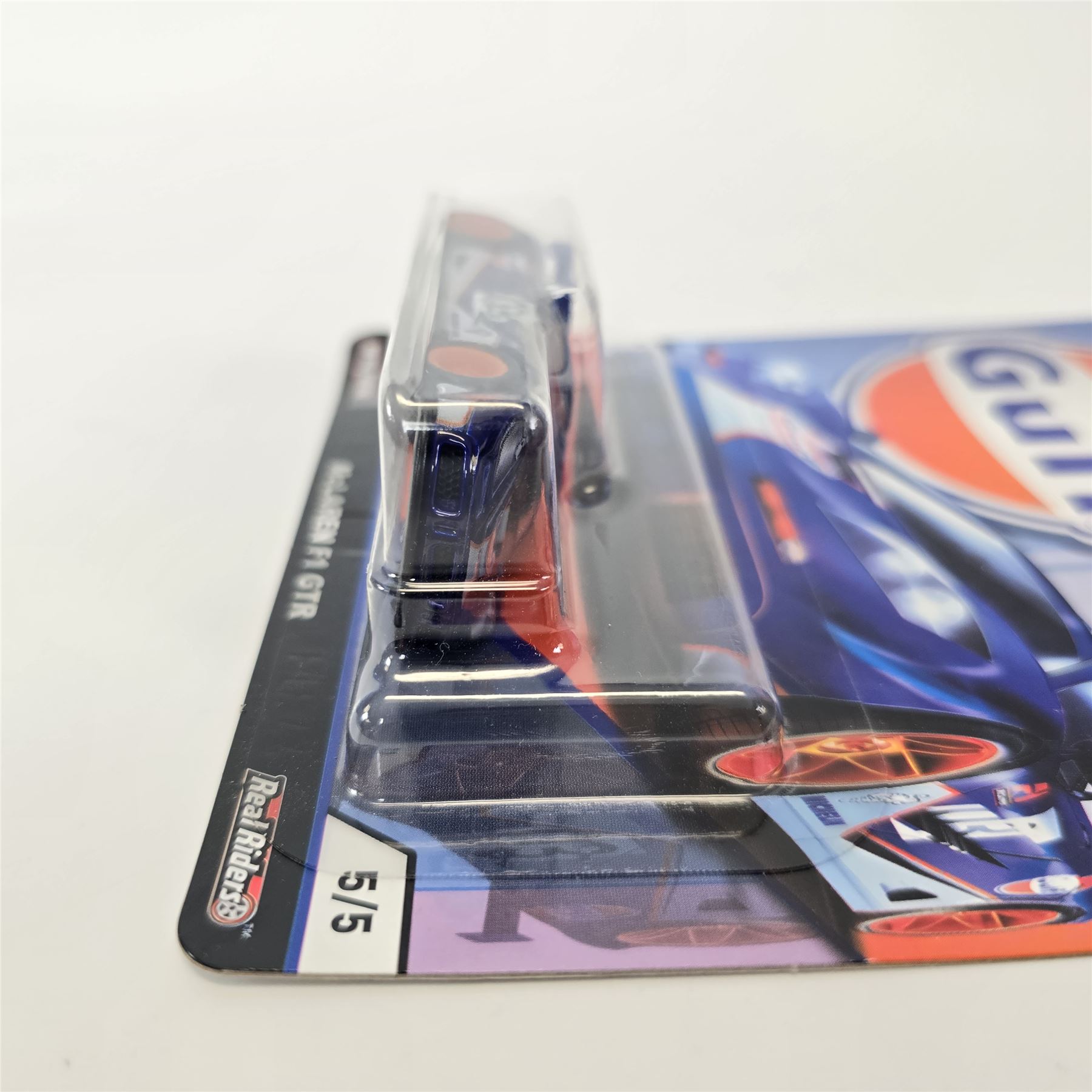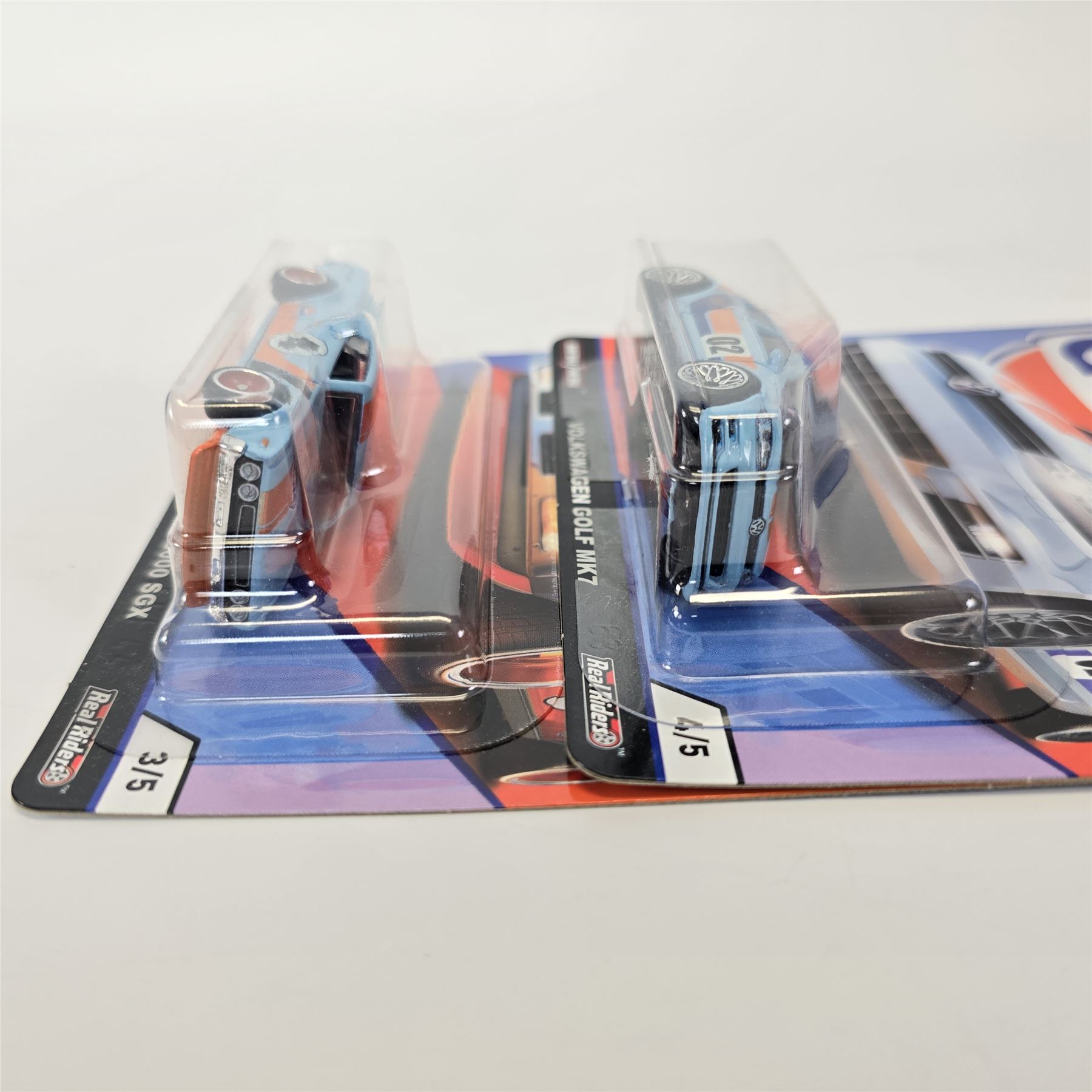 Complete set of 5 Hot Wheels Gulf Premium cars, includes: VW Golf MK7, '69 Ford Mustang Boss Hoss 302, McLaren F1 GTR, 60's FIAT 500D Modificado and Nissan Laurel 2000 SGX