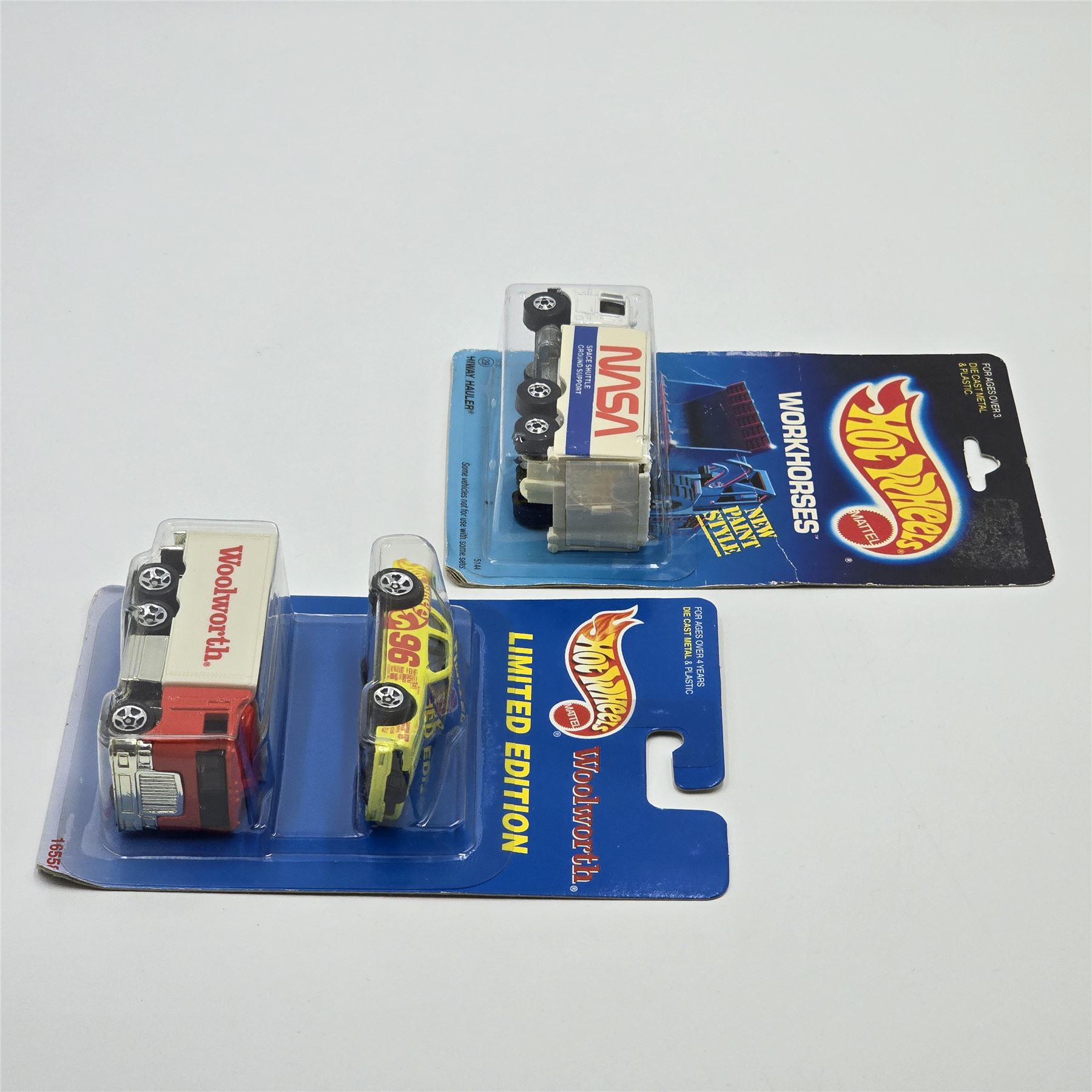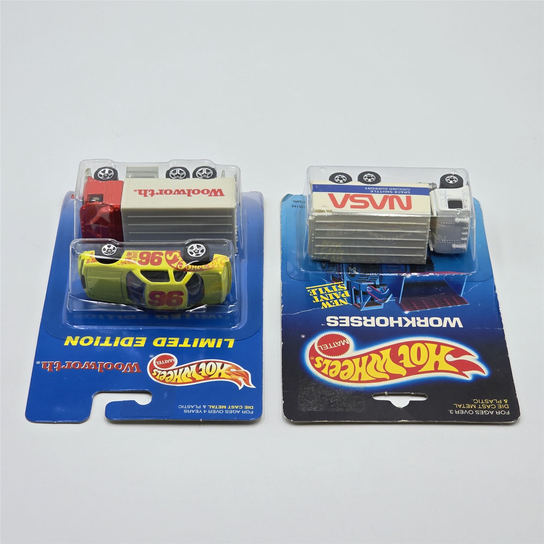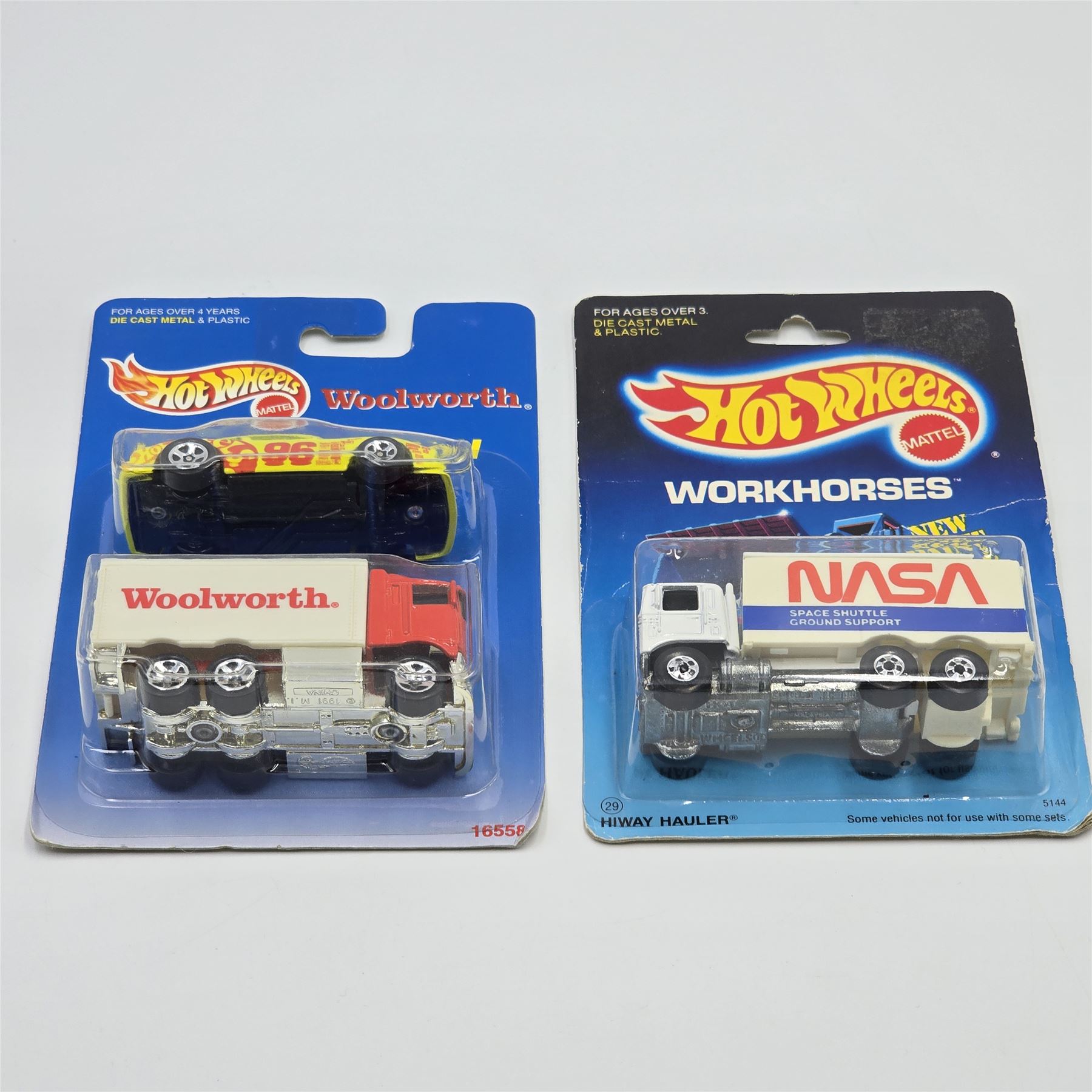 Hot Wheels Hiway Hauler pair, includes - Woolworth 2 pack with yellow Thunderbird Stocker and Workhorses NASA Hauler