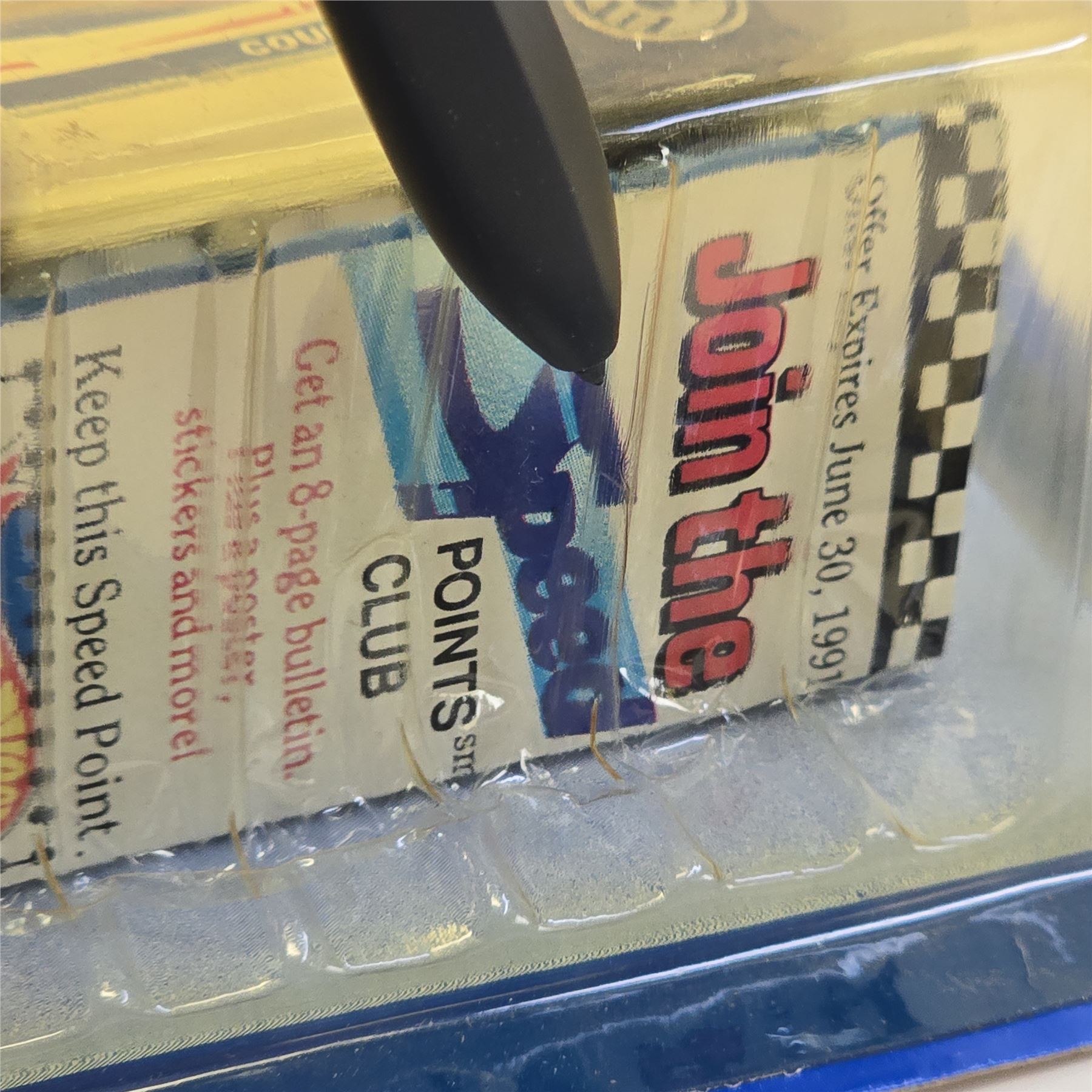 Blister(s) - blister is yellowed, has a crack on the bottom side in one of the blister ridges, hard to detect, blister is firmly attached to the card