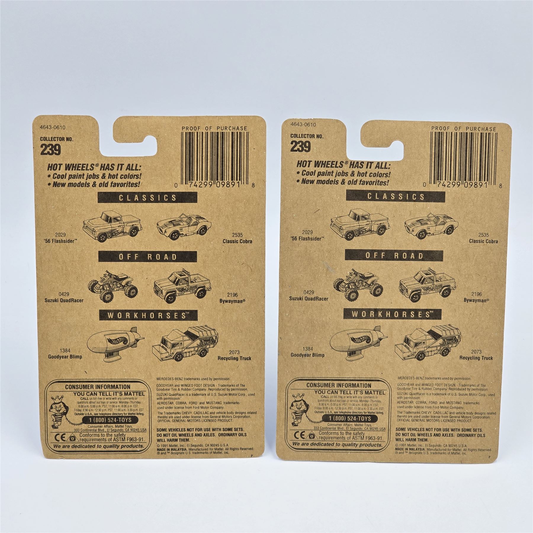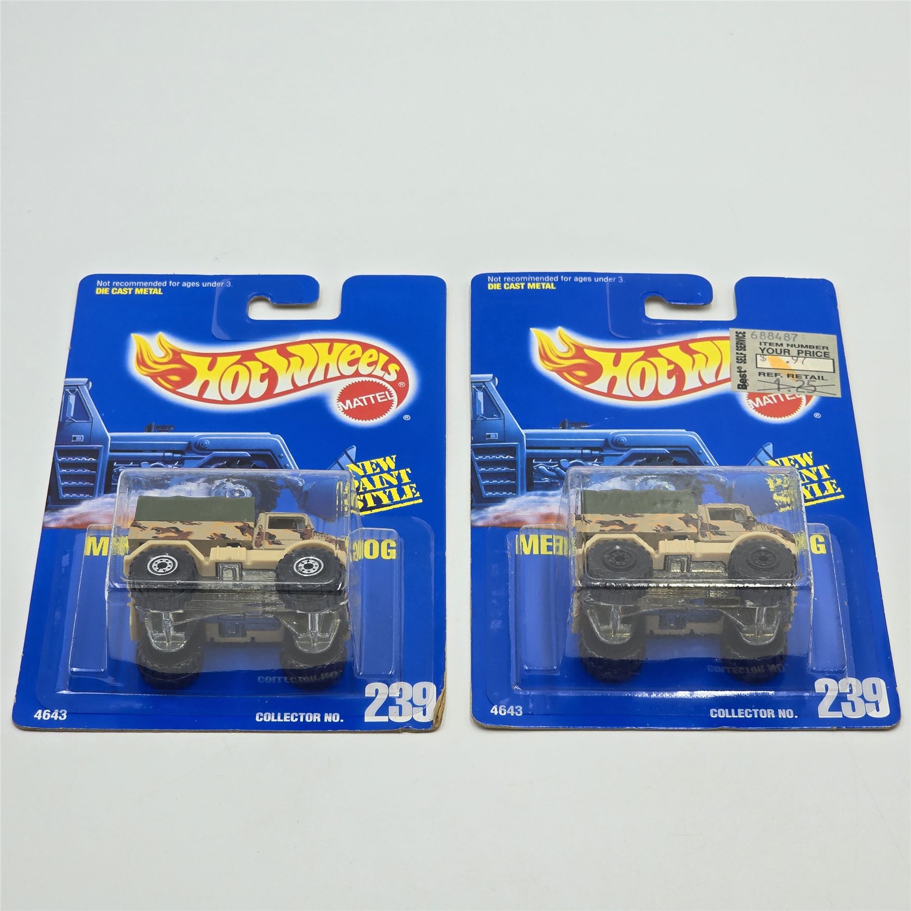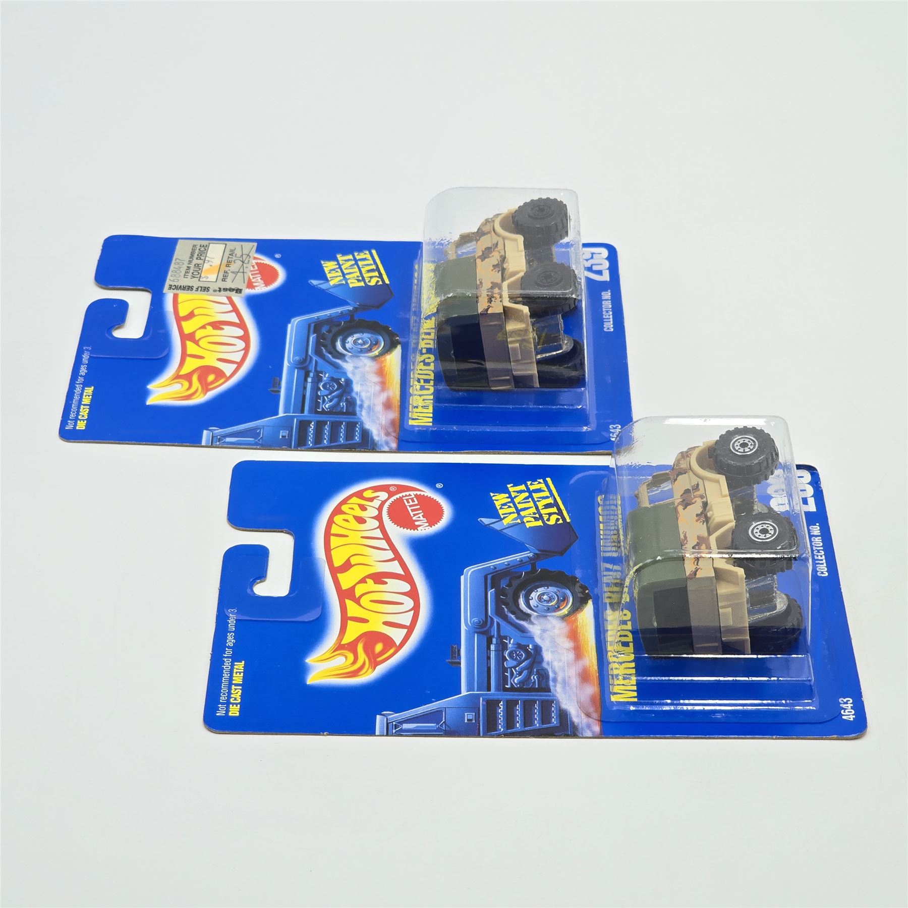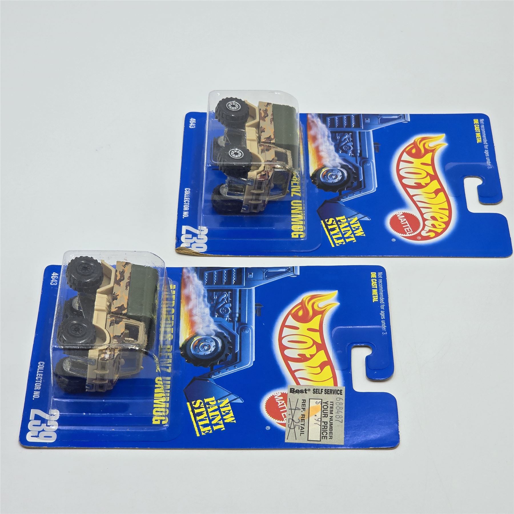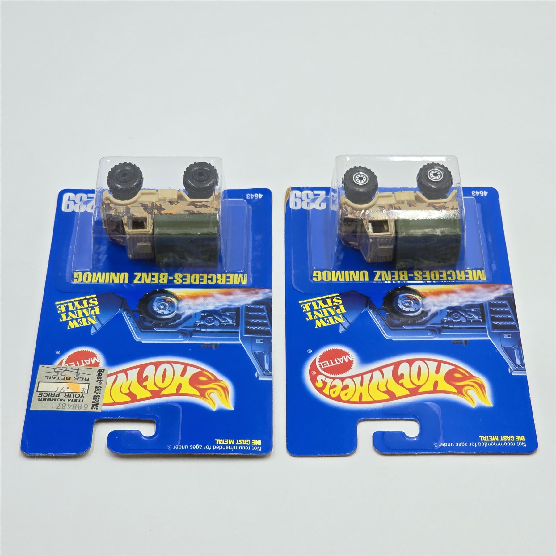 Hot Wheels Blue Card #239 Mercedes Benz Unimog pair, these are similar but have different wheels, one has White hubs, the other has blacked out hubs