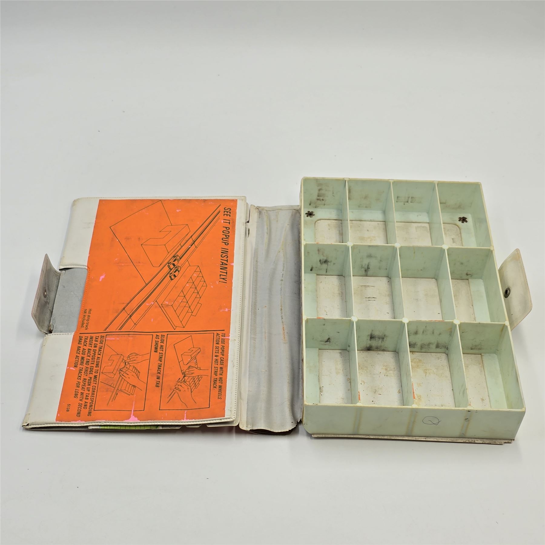 Case is complete but has wear and splits and tears on outside of hinge areas as shown, tray is marked up as is back of case.& nbsp; Should clean up better, please check photos for complete description