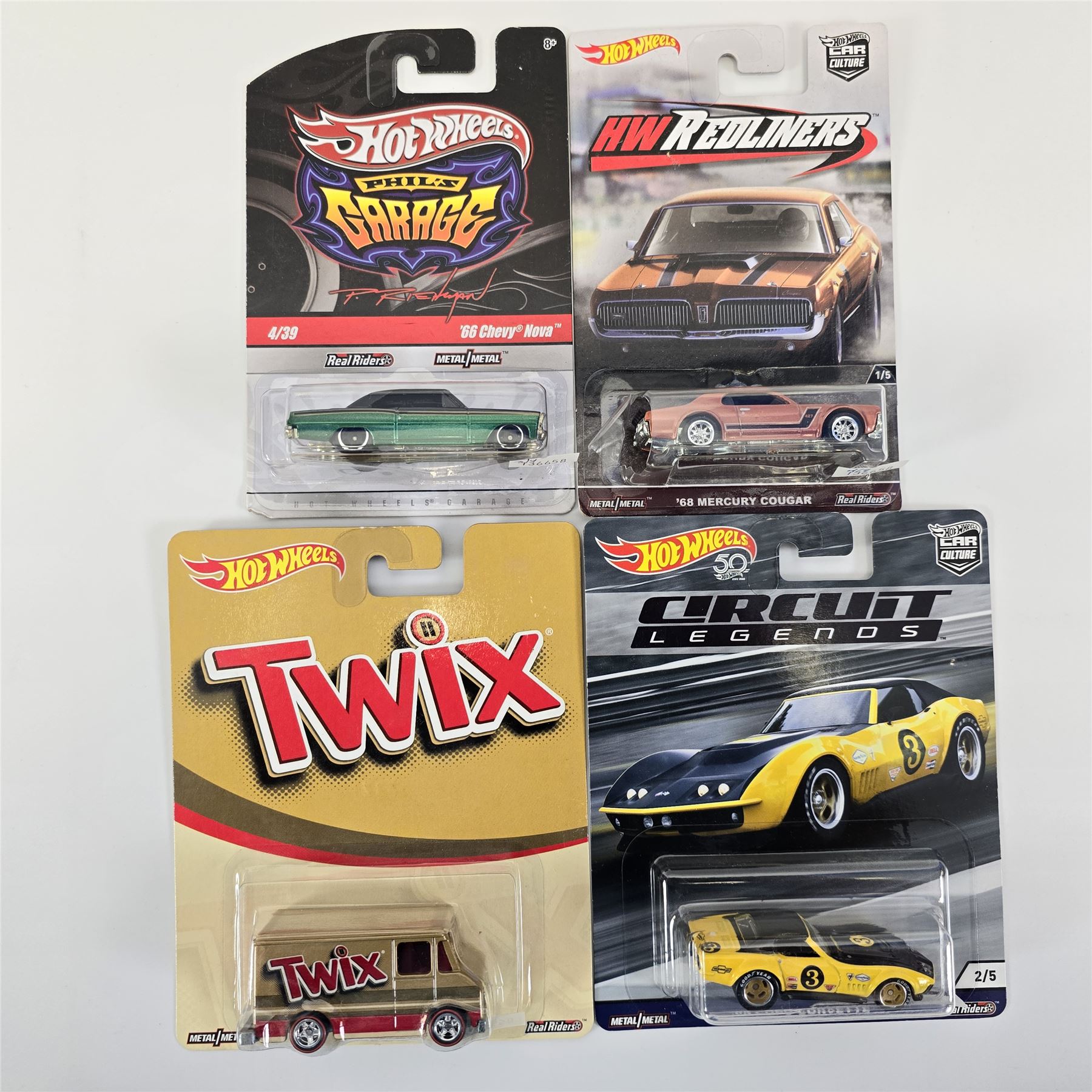 Hot Wheels Premium lot including TWIX Delivery Van, Phil's Garage 66 Chevy Nova, HW Redliners 68 Cougar and Circuit Legends COPO Corvette