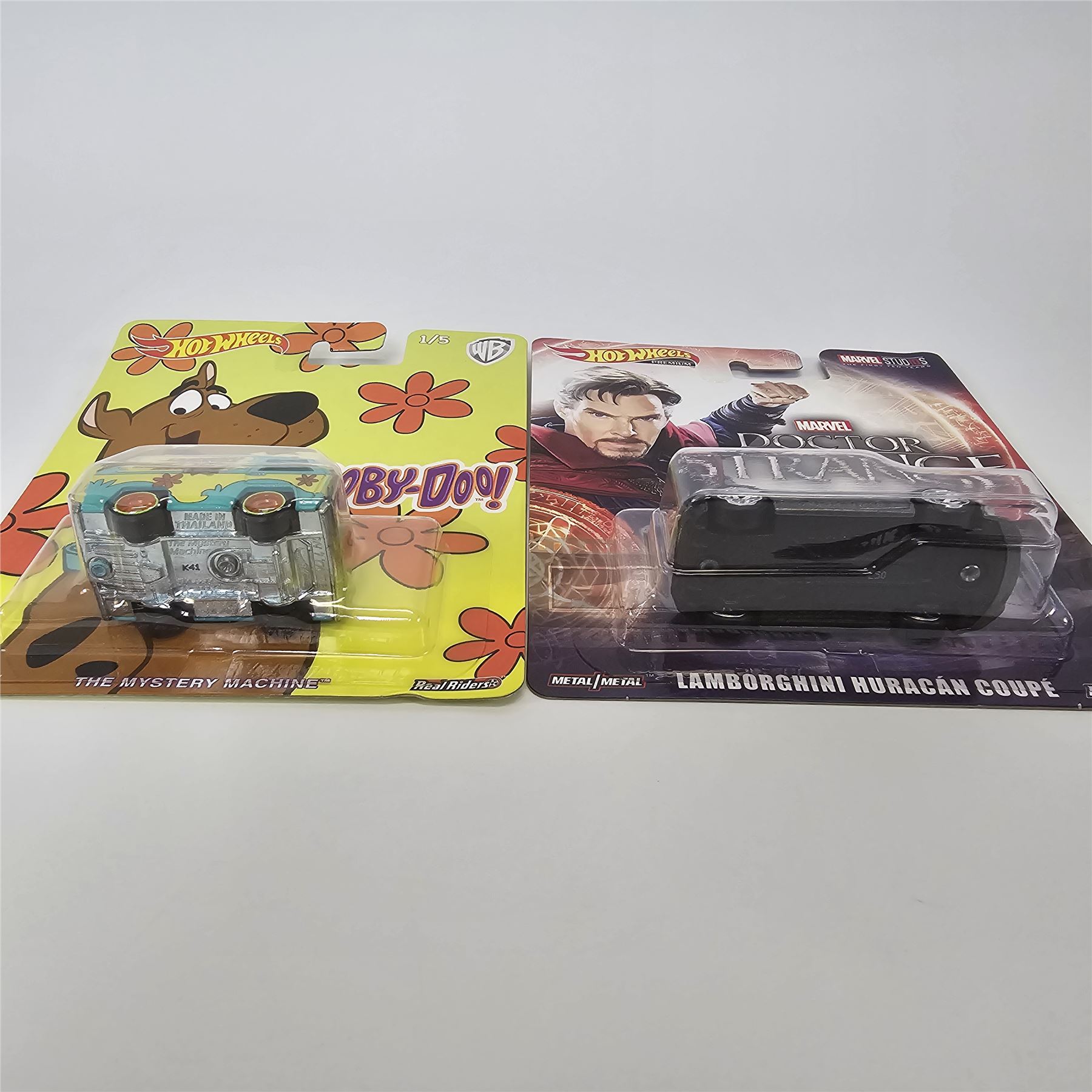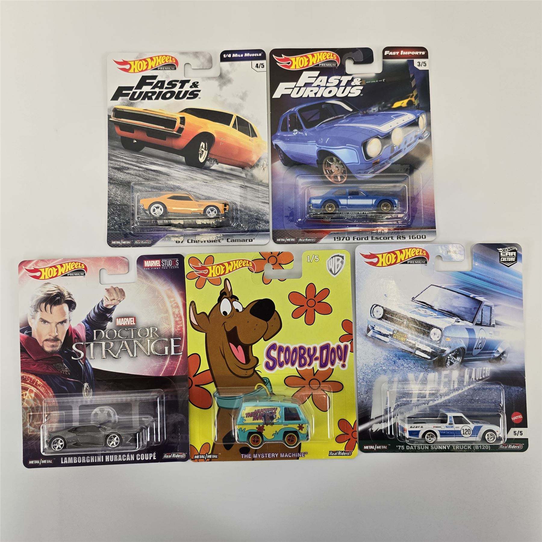 Hot Wheels premium lot of 5 cars including, Fast & amp; Furious 67 Chevy Camaro, Fast & amp; Furious 1970 Ford Escort, Doctor Sterange Lamborghini Huracan Coupe and Scooby Doo Mystery Machine