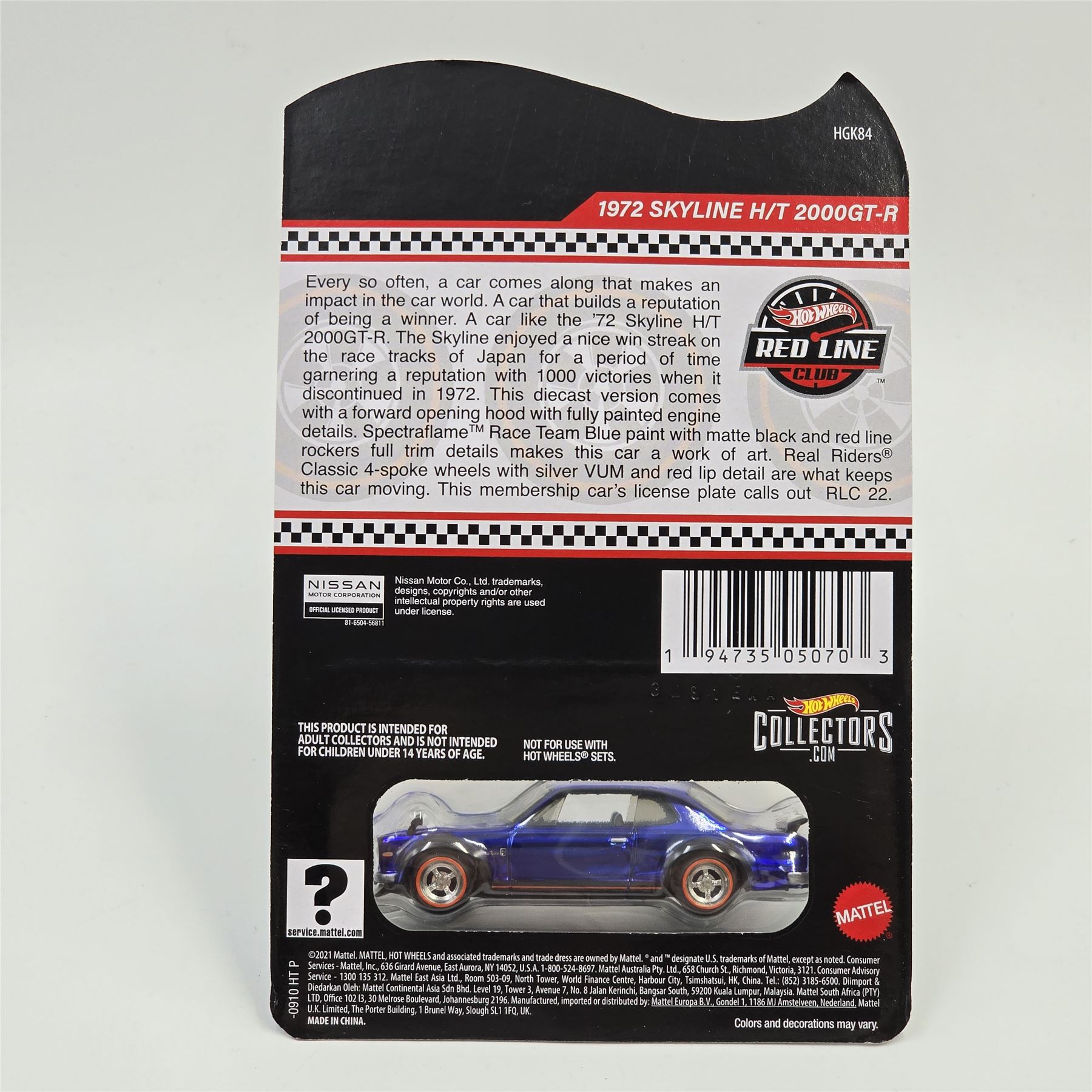 Hot Wheels 2022 Club car Nissan Skyline H/T 2000GT-R - includes patch and button