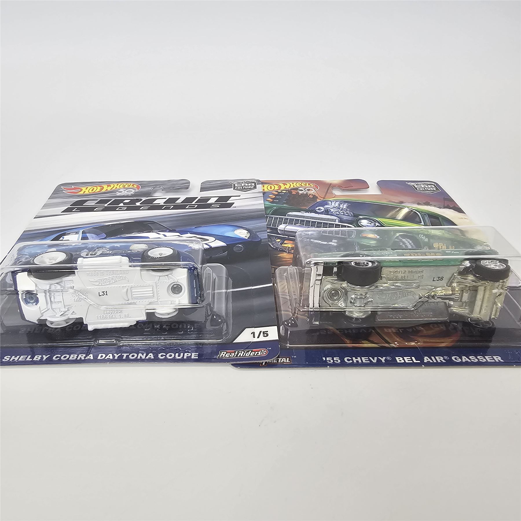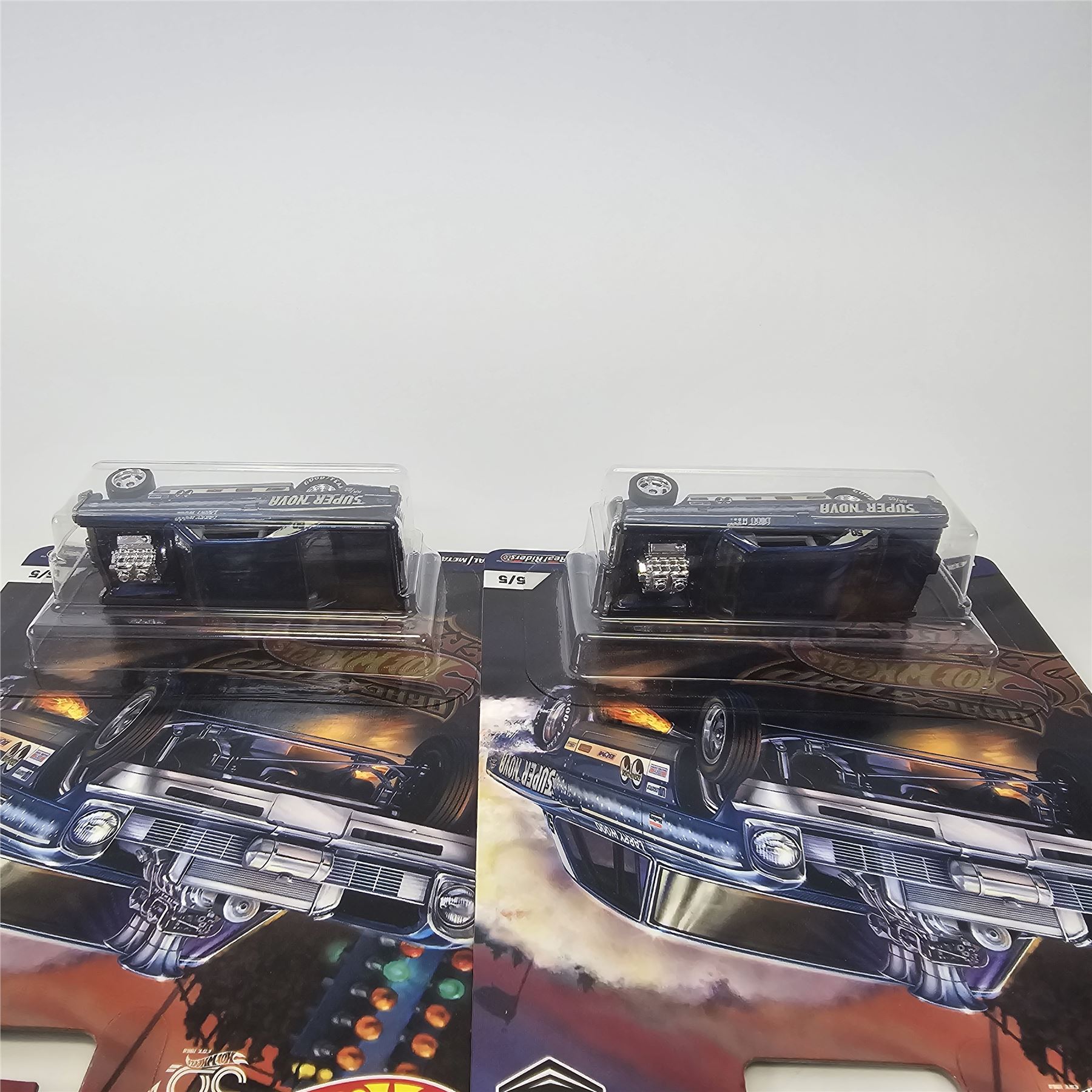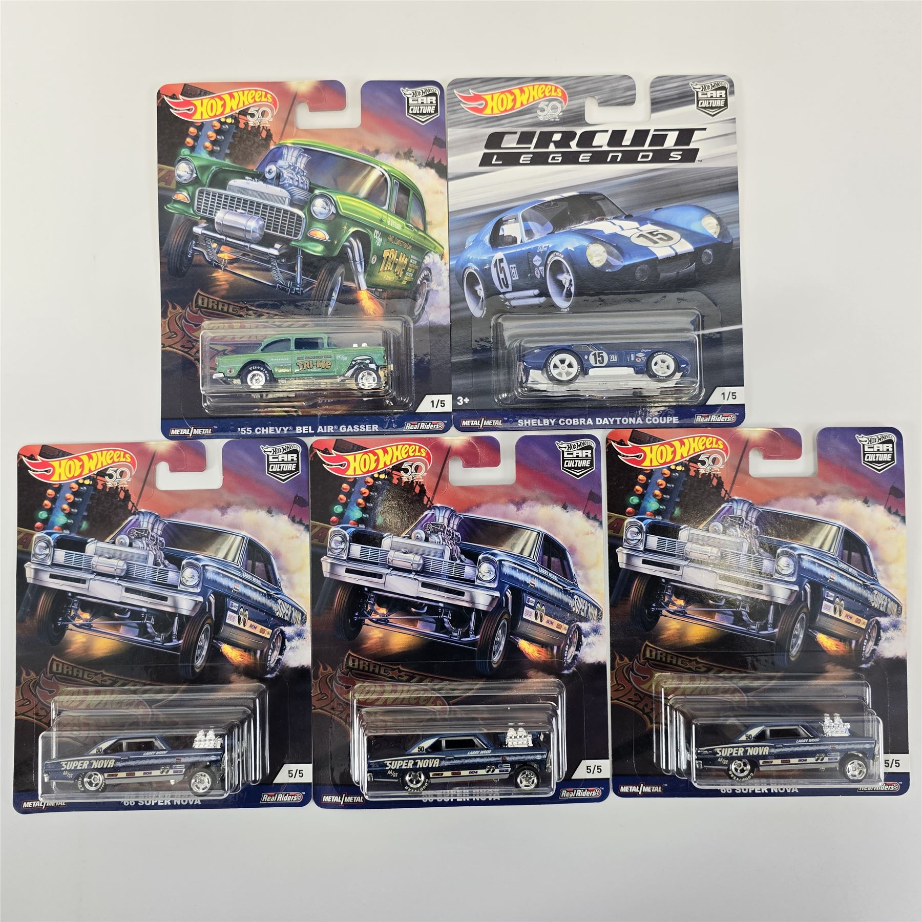 Hot Wheels Real Riders Car Culture 5 car lot including, (3) '66 Chevy Super Novas, '55 Chevy Bel Air Gasser and a Circuit Legends Shelby Cobra Daytona Coupe