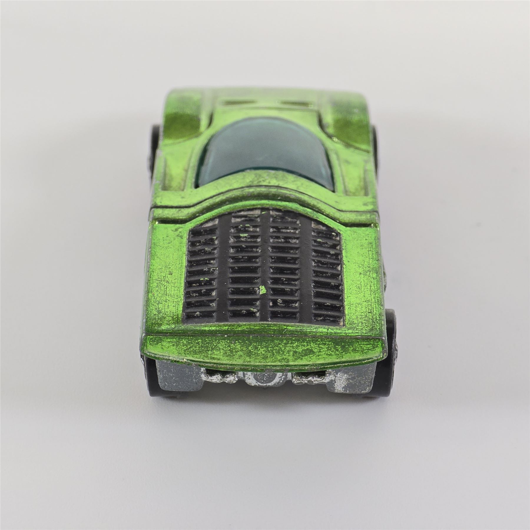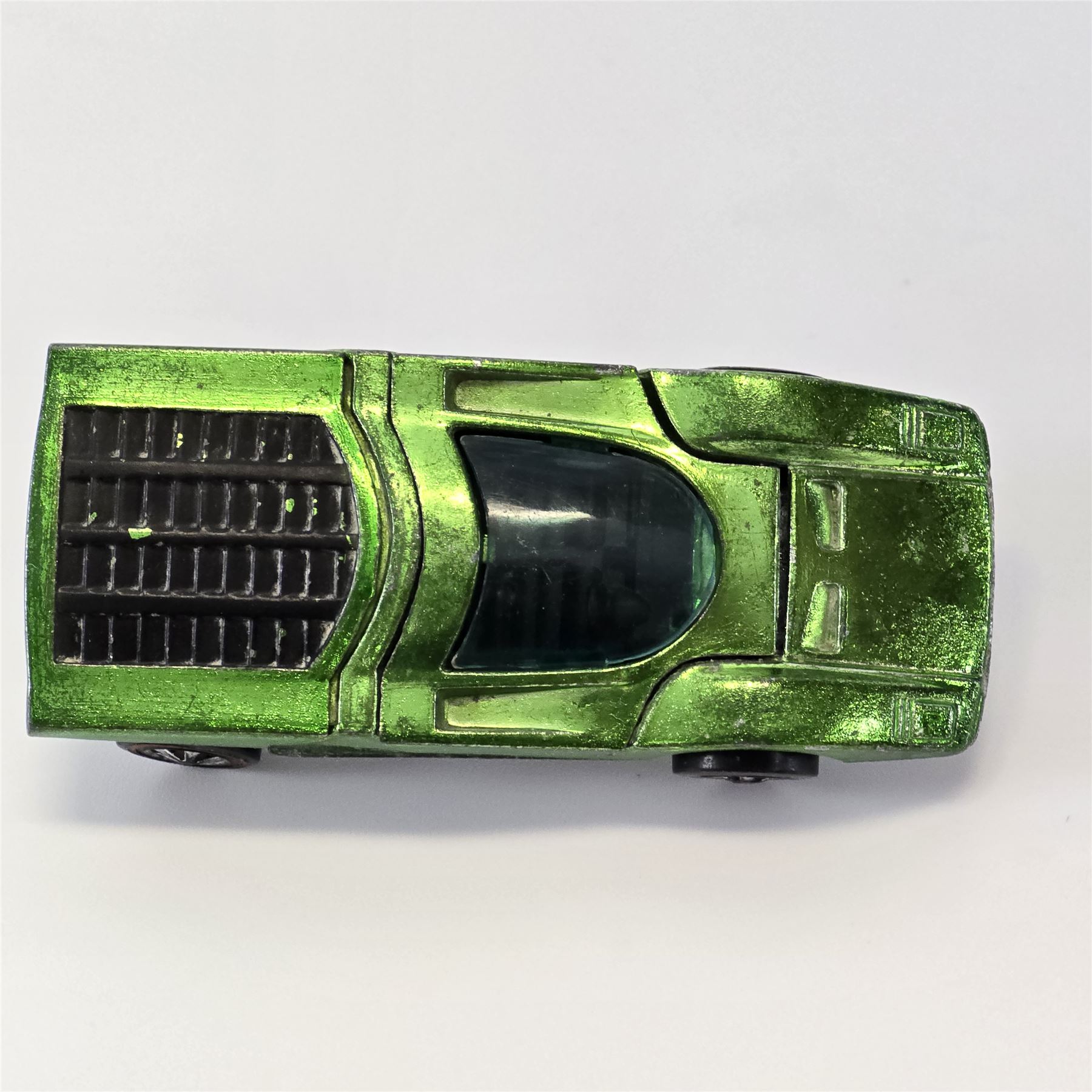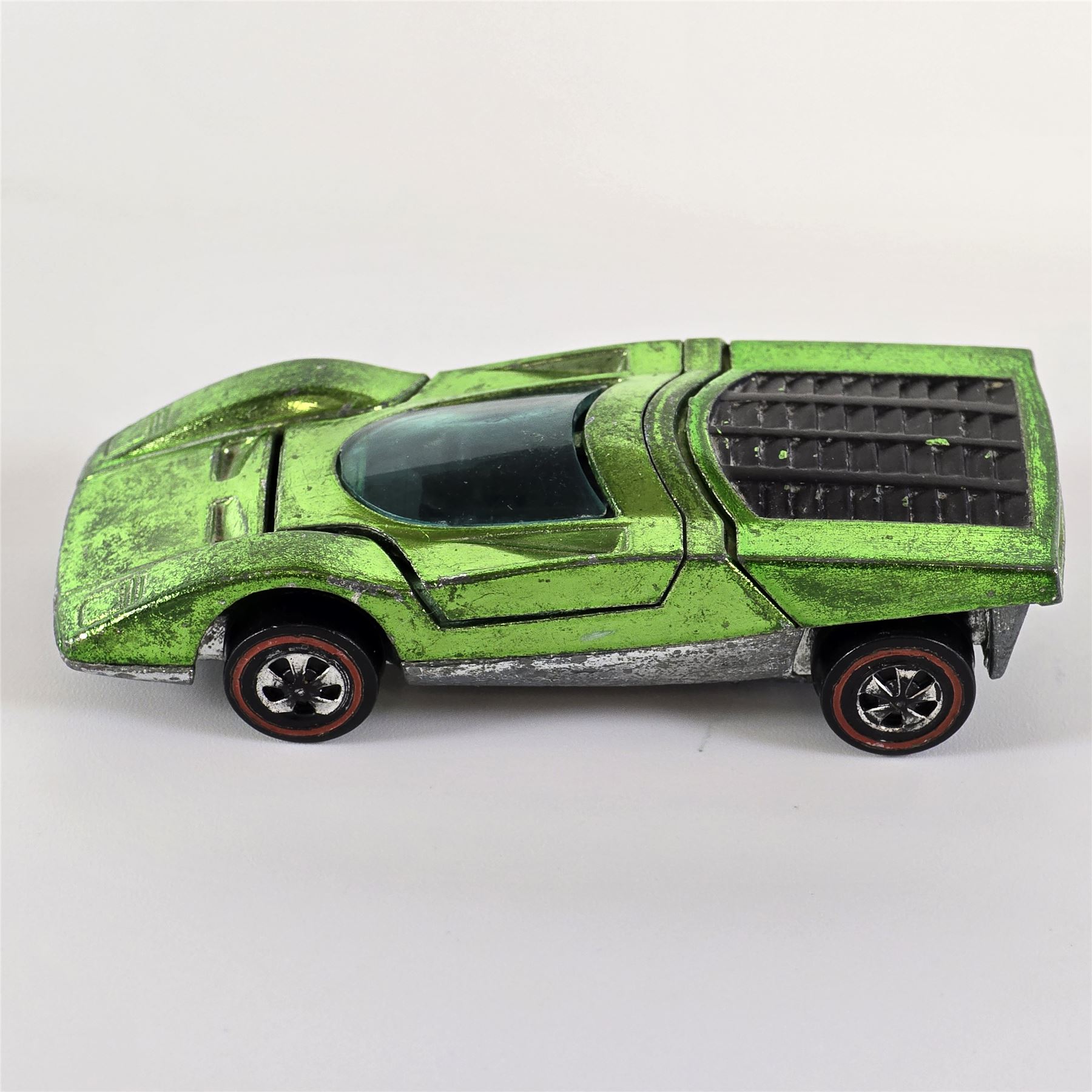 Nice condition overall with some light wear throughout. Has some toning throughout. Glass is crack free. Both hatches work. Factory error - oversprayed engine bay!! Wheel chrome shows light wear. Base is lightly tarnished.