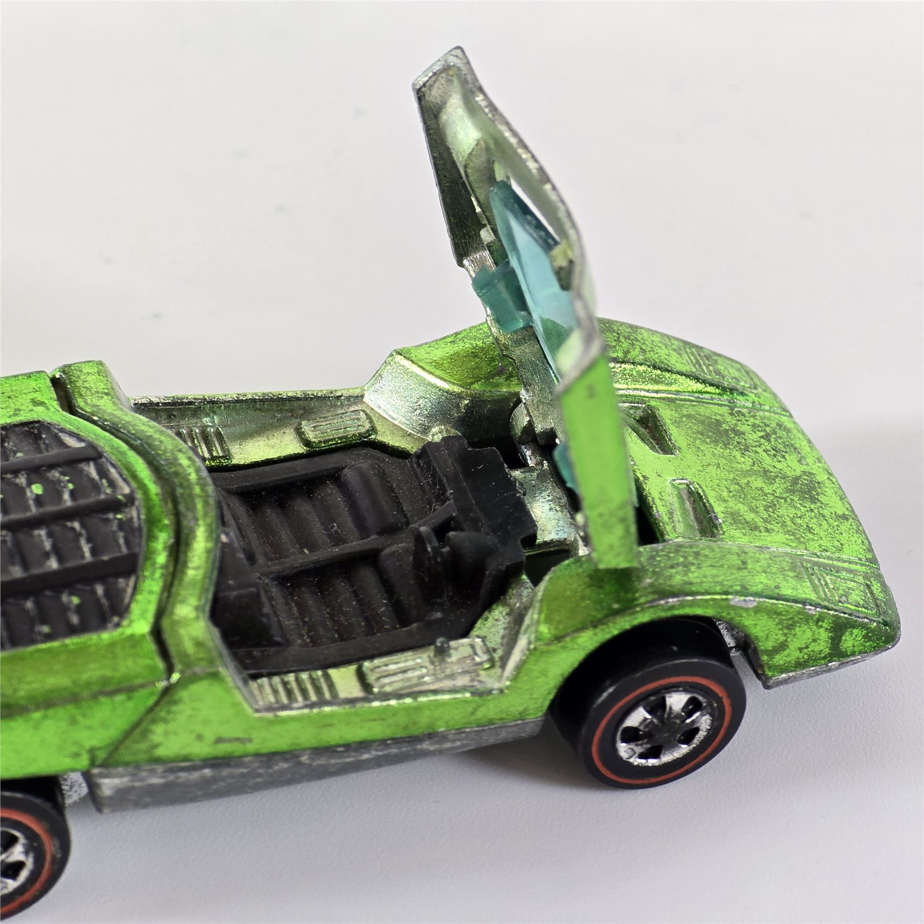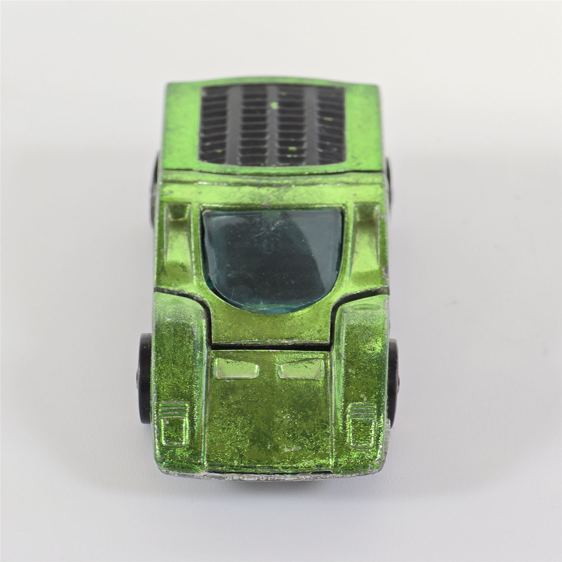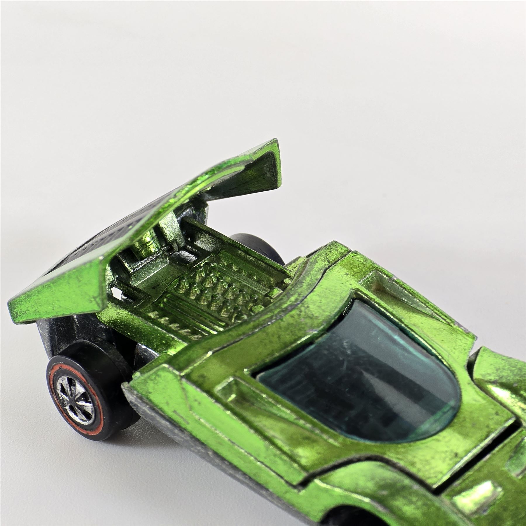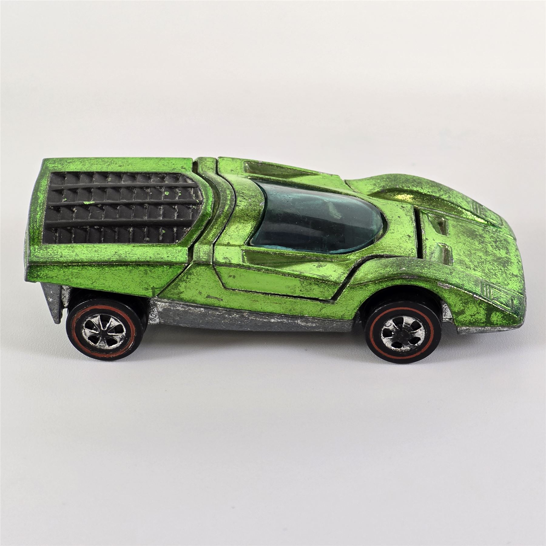 Nice condition overall with some light wear throughout. Has some toning throughout. Glass is crack free. Both hatches work. Factory error - oversprayed engine bay!! Wheel chrome shows light wear. Base is lightly tarnished.