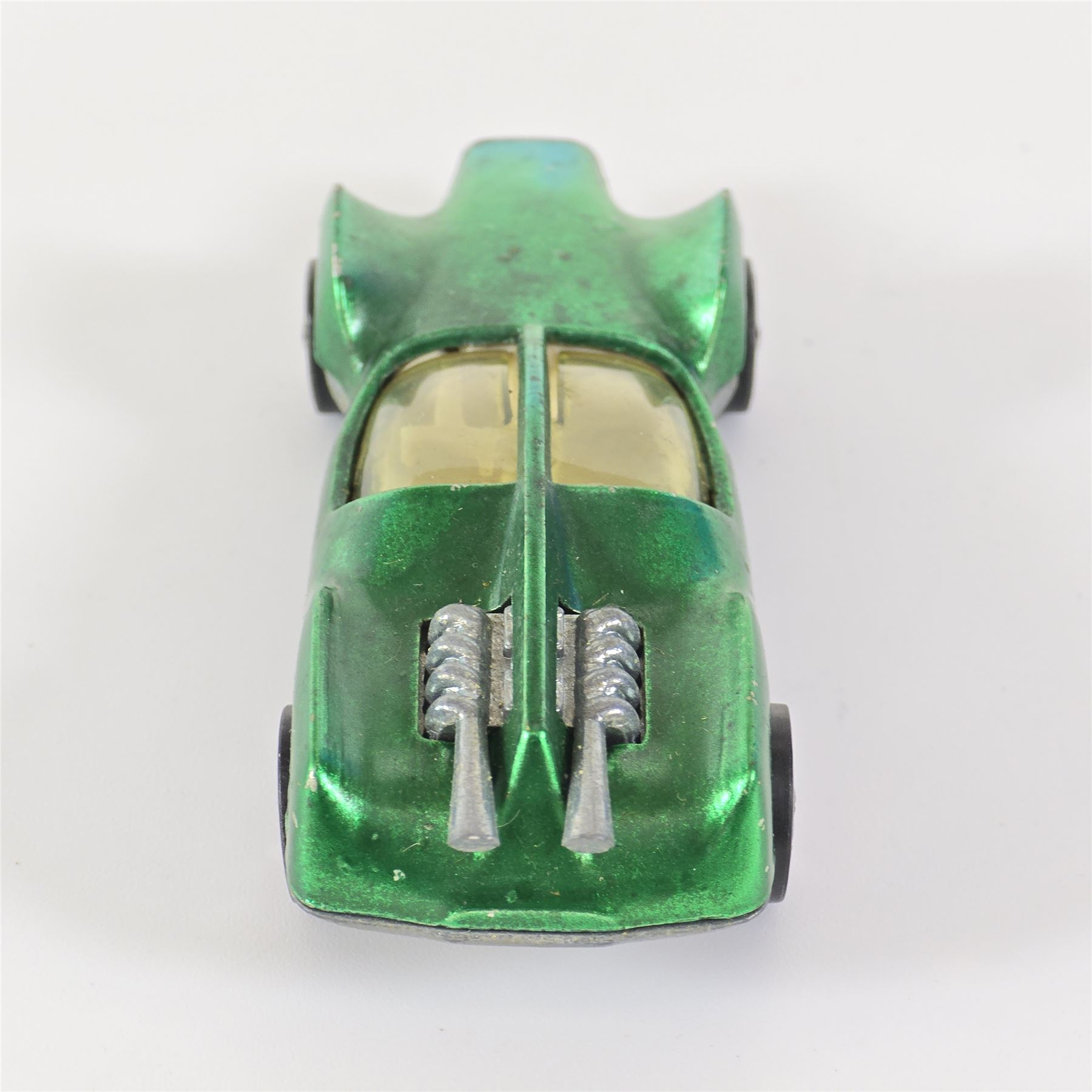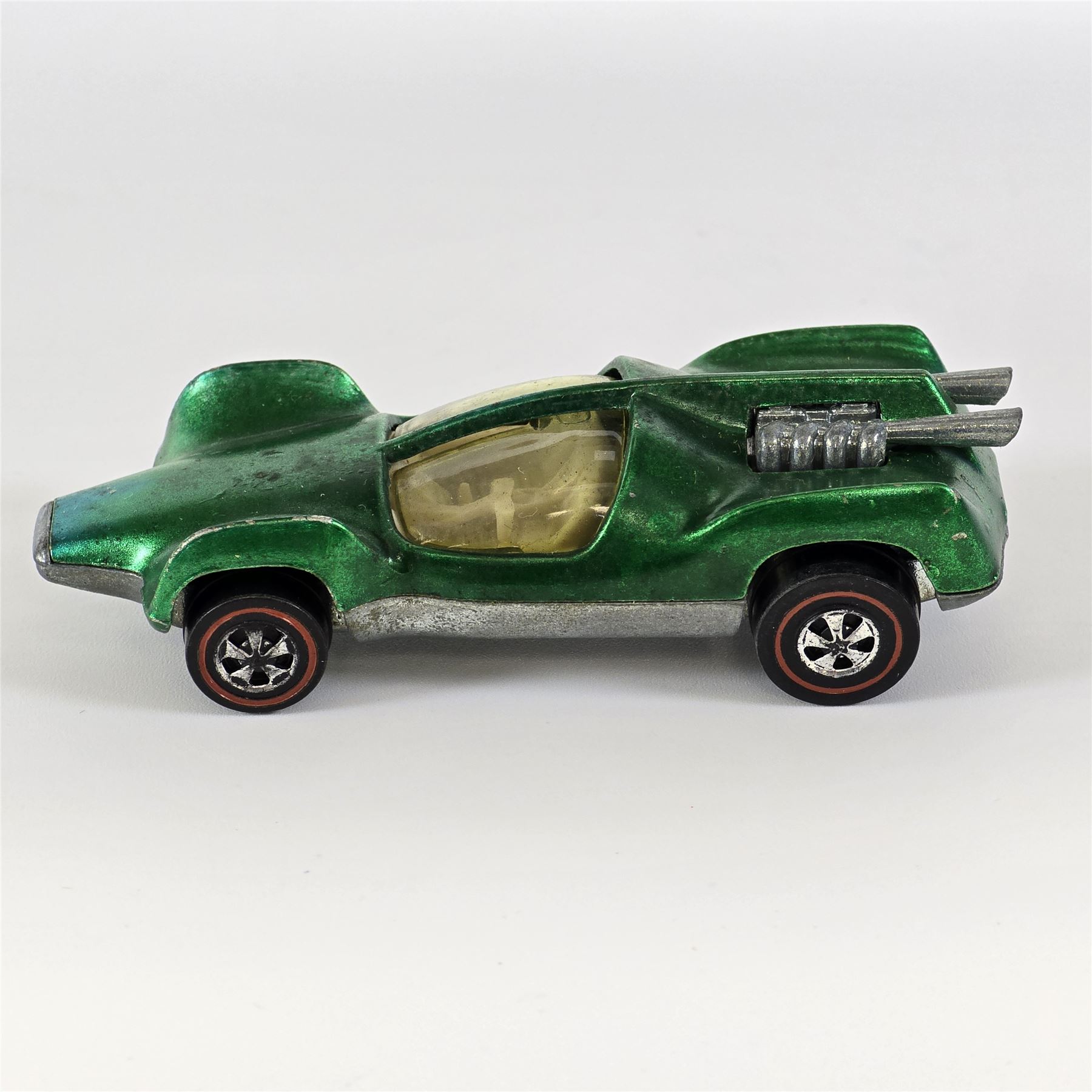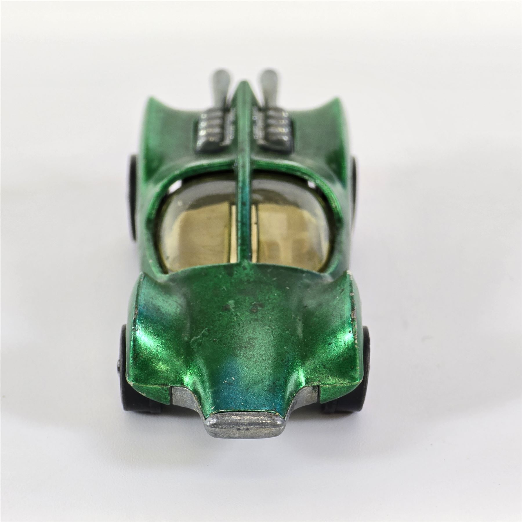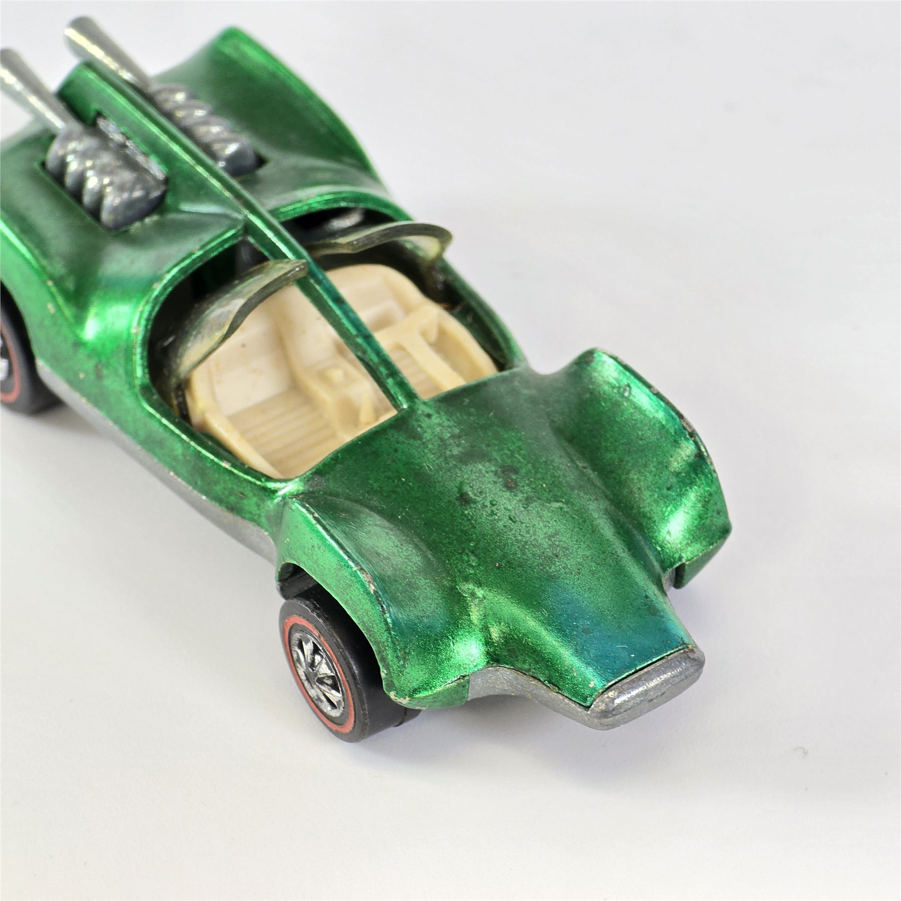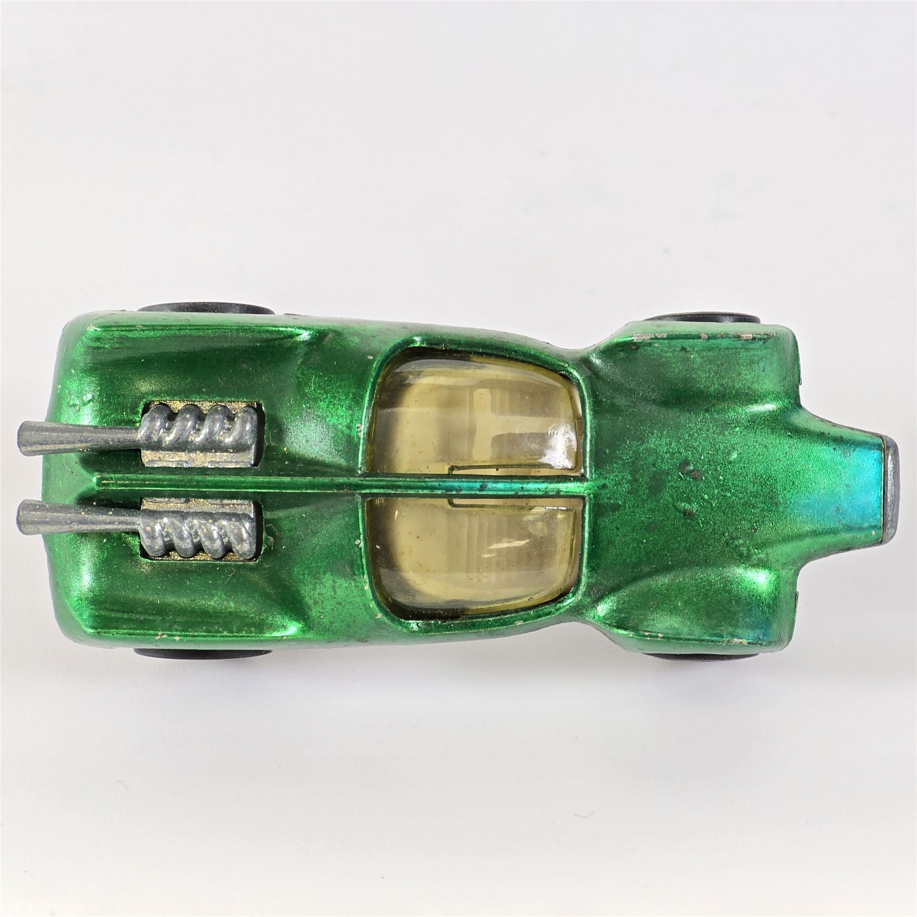 Nice condition overall with some slight playwear. Paint is starting to fade in spots to aqua shade. Referred to as & quot;Graqua& quot; by hobbyists, this is a common phenomenon with US green painted cars from this era. Has some toning throughout. Glass is crack free and works properly. Wheel chrome is nice. Base is lightly tarnished.