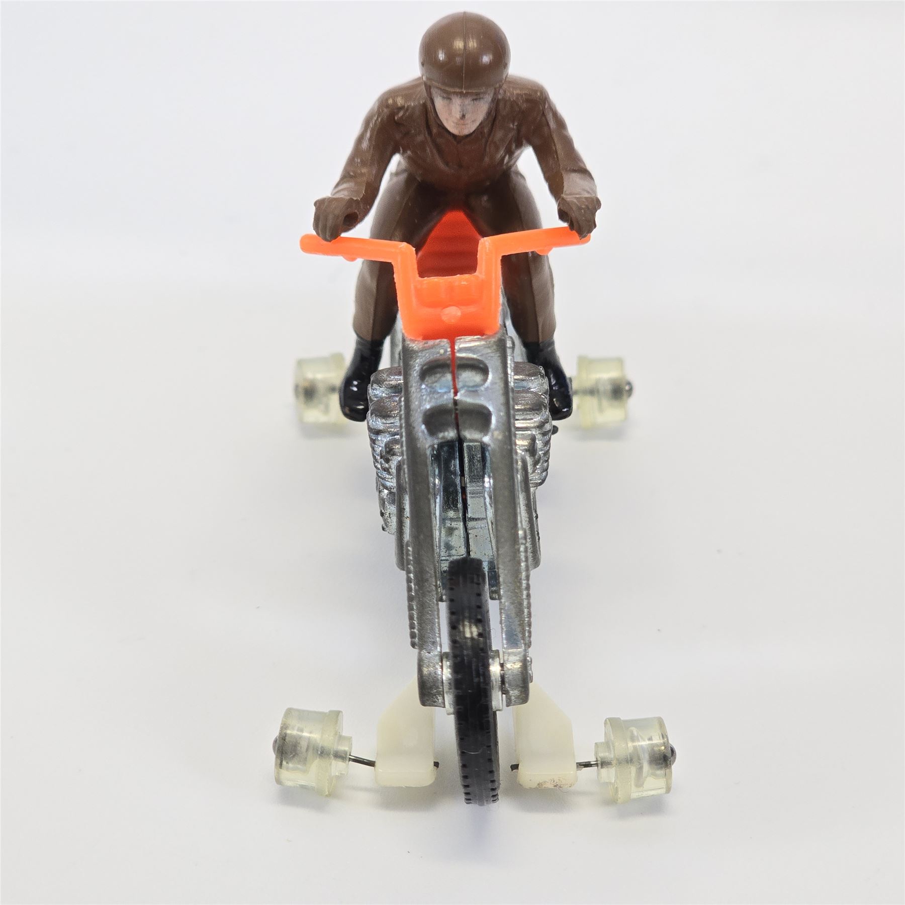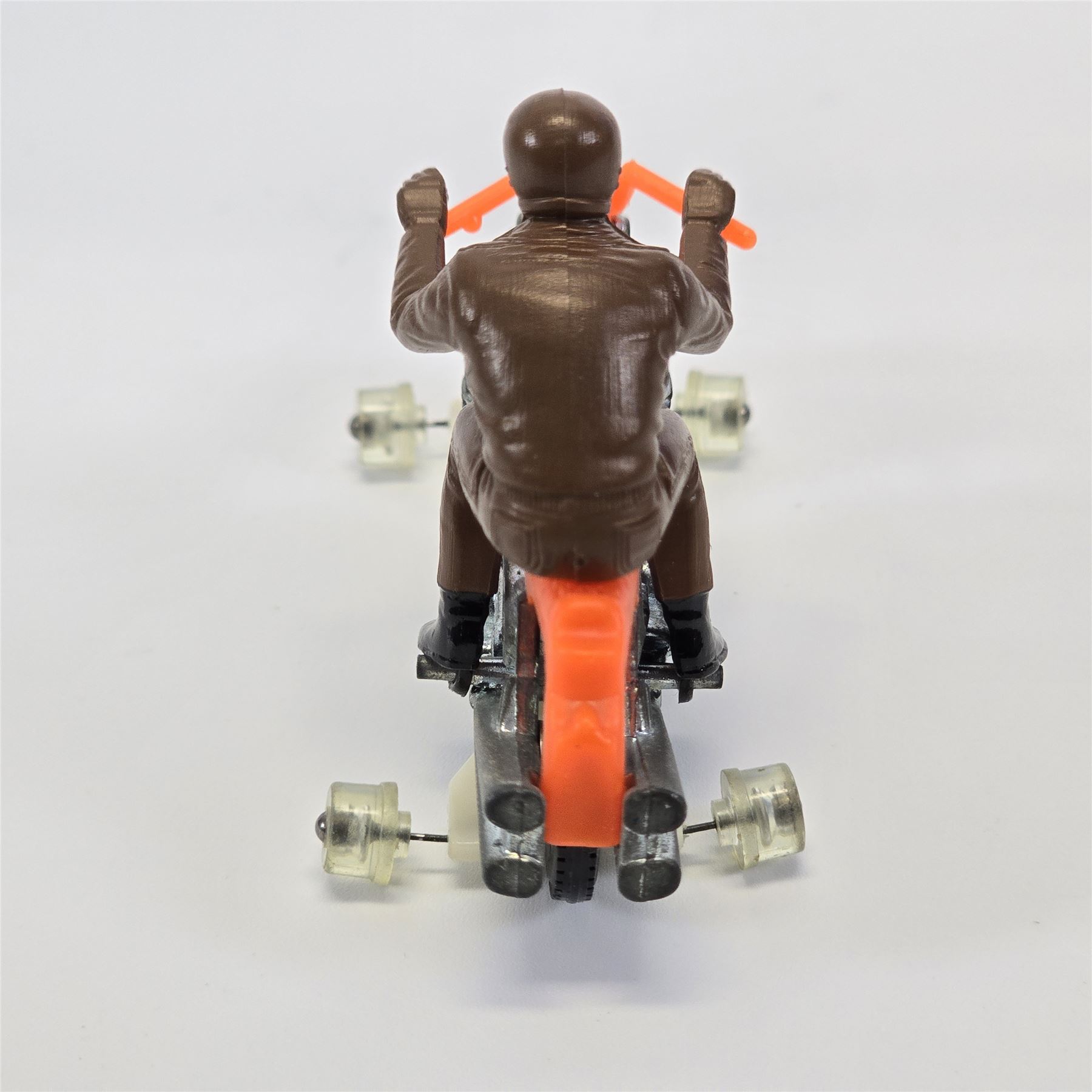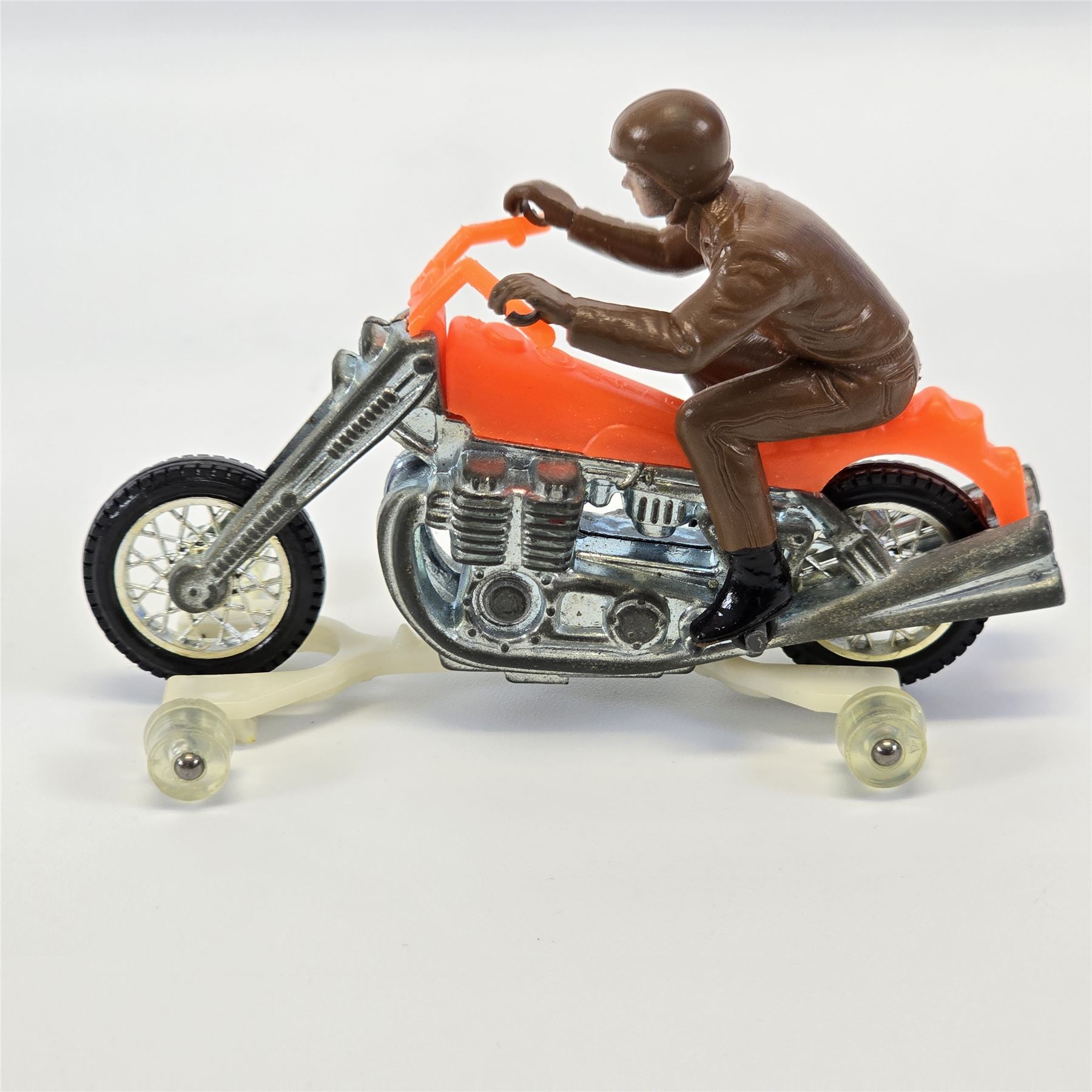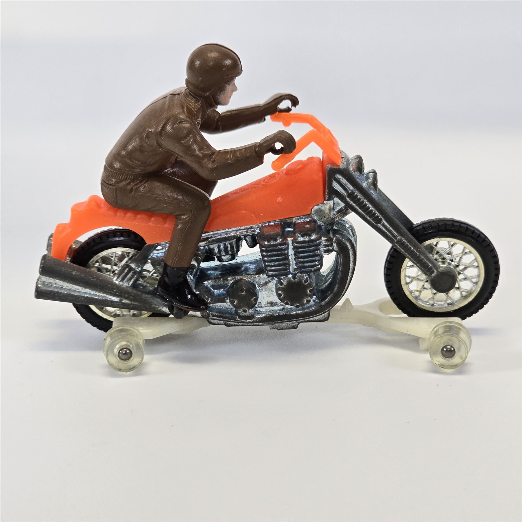 Overall nice condition with some slight tarnish to metals. All plastics appear intact. Brown Hog rider has all loops intact. Bike kickstand intact. 4-wheel track guide intact.
