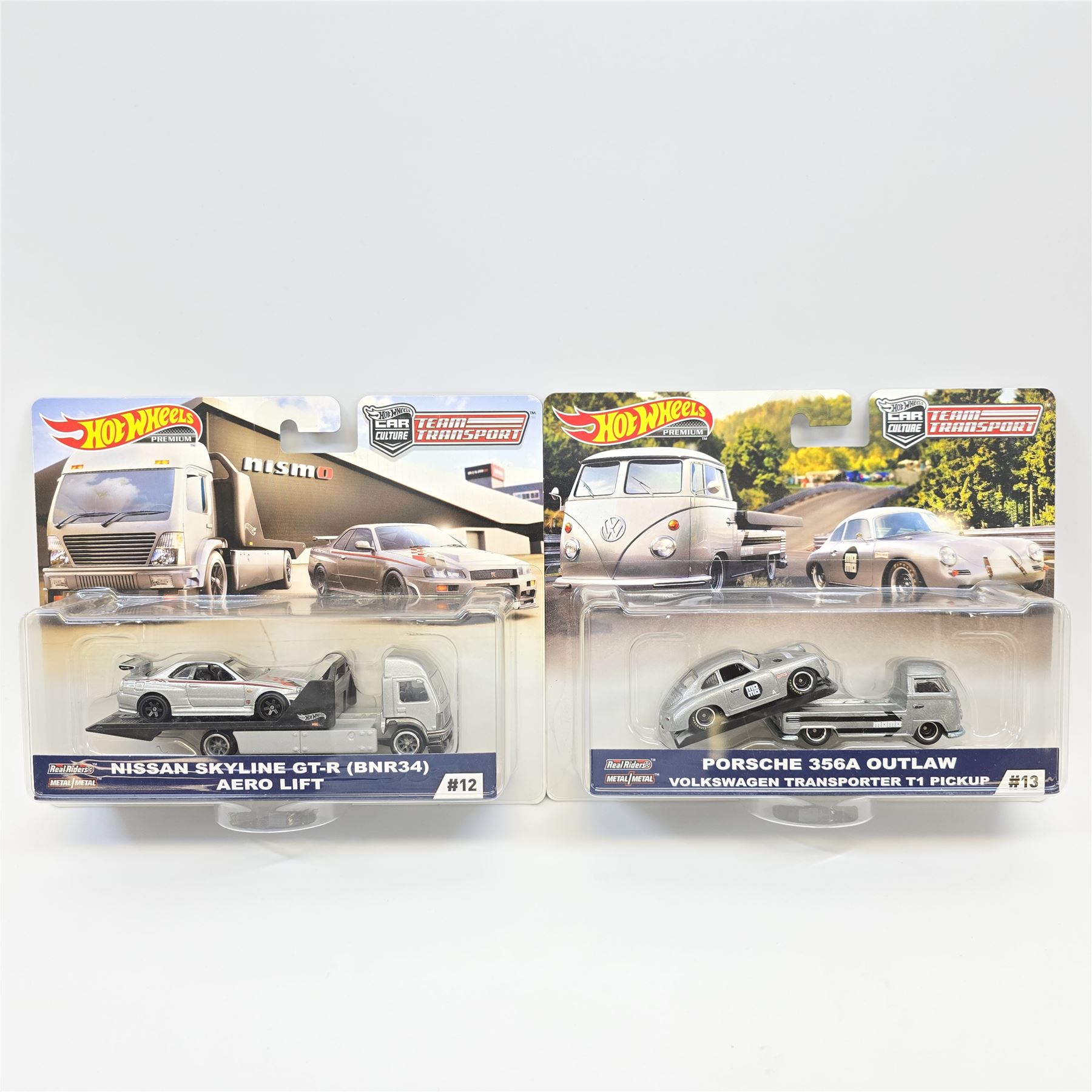 2019 Hot Wheels Team Transports #12 & amp; #13, Nissan Skyline GT-R (BNR34)/Aero Lift and Porsche 356A Outlaw/VW Transporter T1 Pickup
