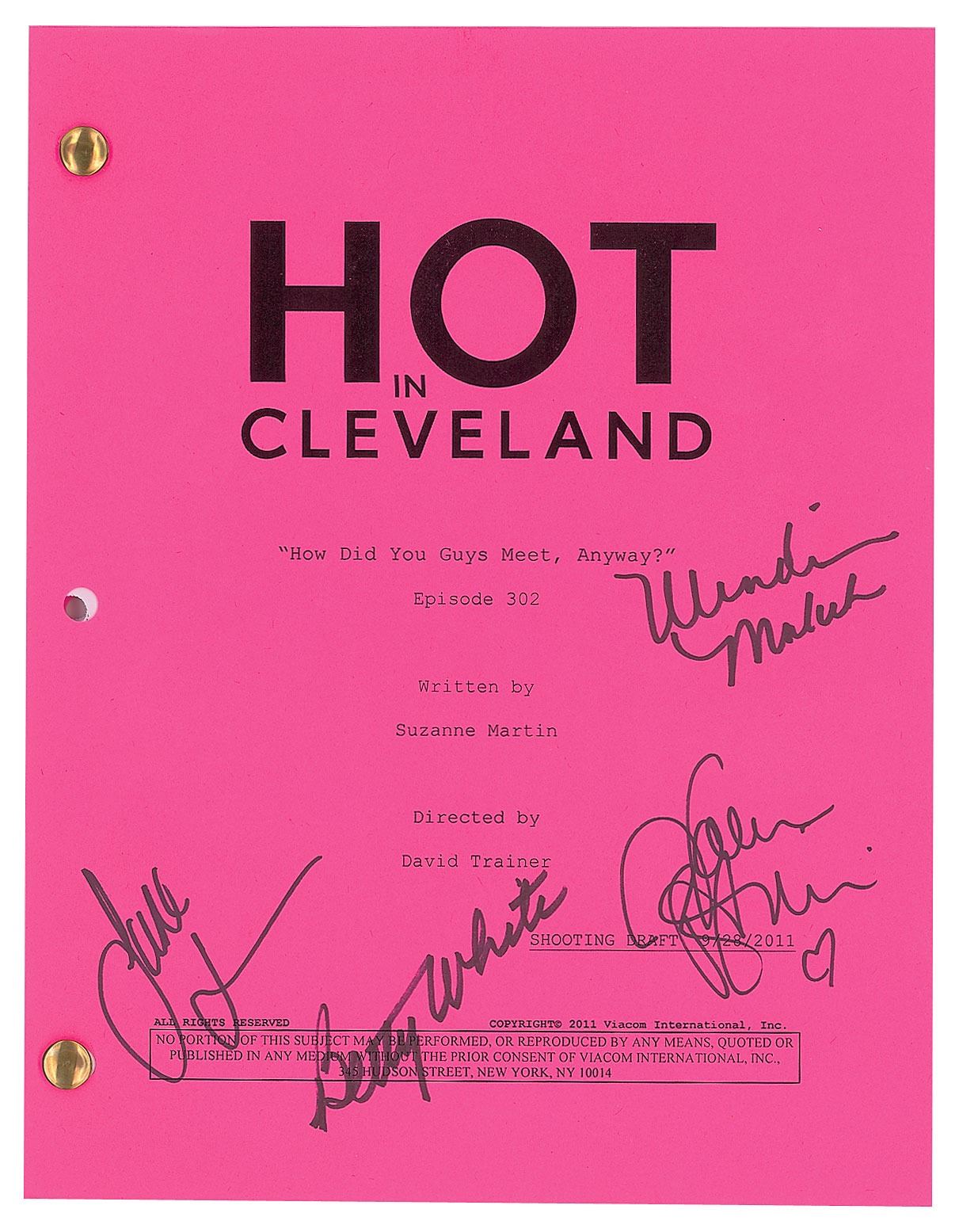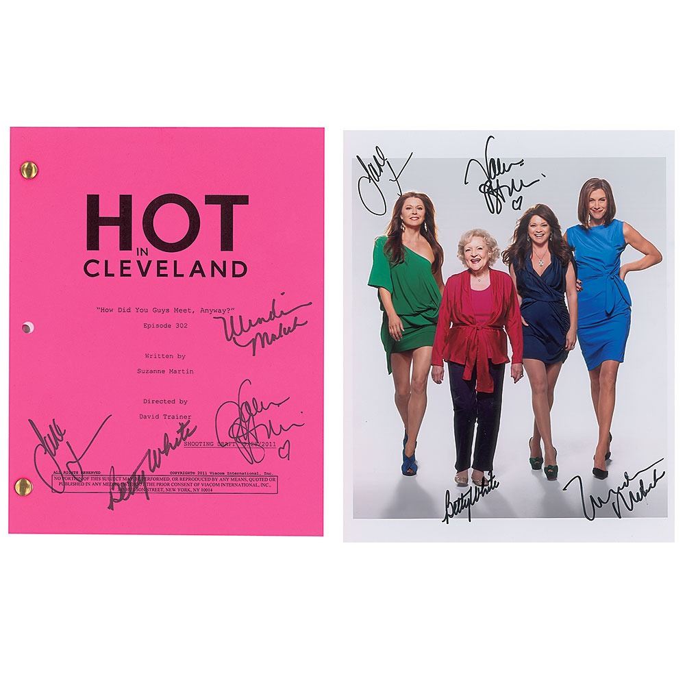 Brad-bound shooting draft script for the Hot in Cleveland episode 'How Did You Guys Meet, Anyway?,' season three, episode six, 45 pages, 8.5 x 11, dated September 28, 2011, signed on the front cover in black felt tip by Valerie Bertinelli, Jane Leeves, Wendie Malick, and Betty White. Includes a color glossy 8 x 10 photo of the Hot in Cleveland cast, signed by each actress in black felt tip. In overall fine condition.