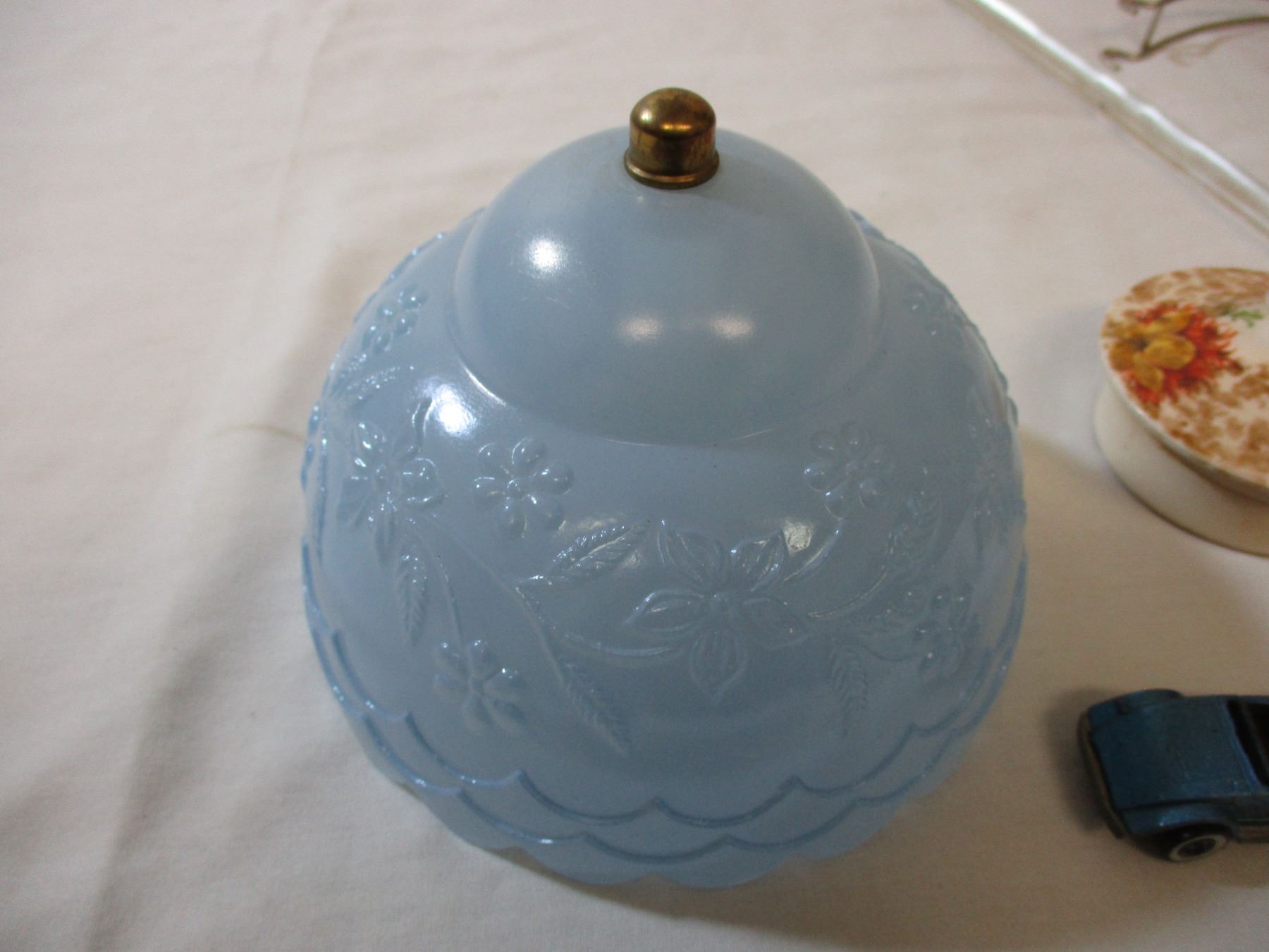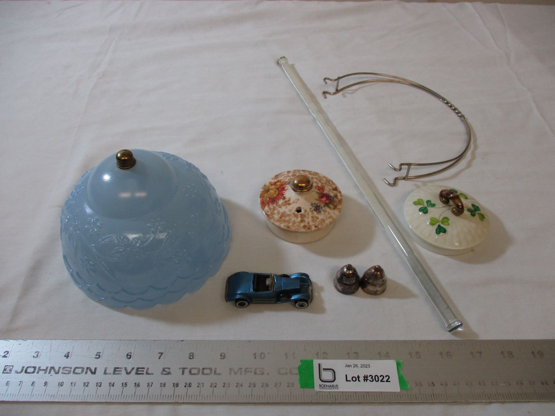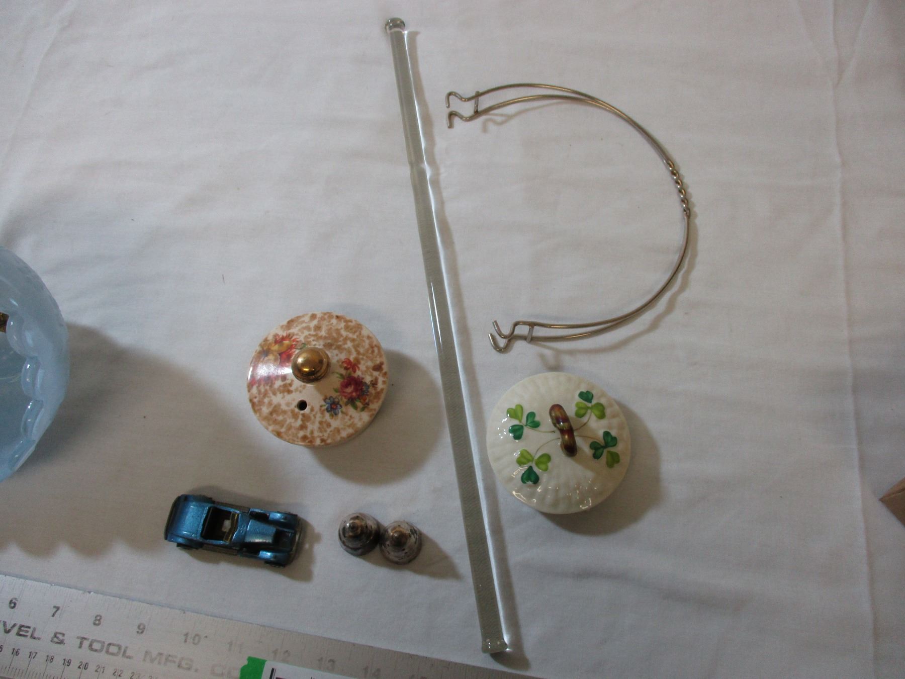 Hot wheels car, lamp shade, misc