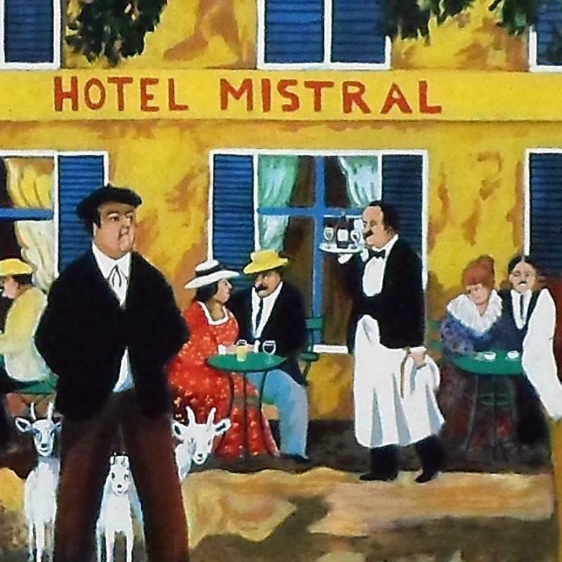 "Hotel Mistral" is a limited edition serigraph on paper by Guy Buffet. It is numbered, hand-signed by the artist, and comes with a Certificate of Authenticity. Measures approx. 23.5" x 17.5" (image).