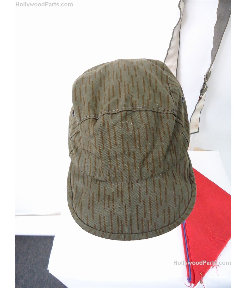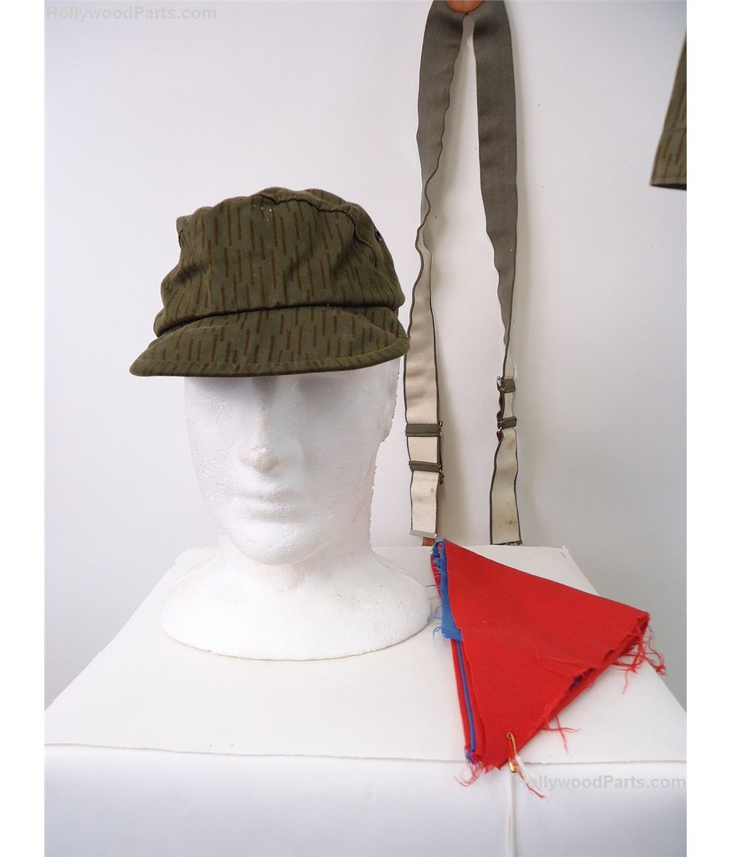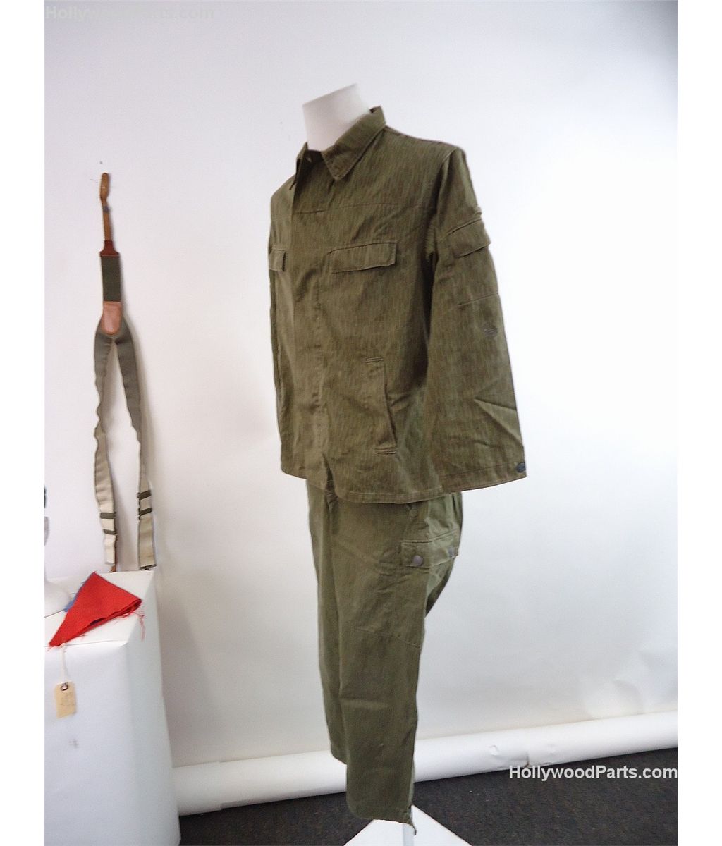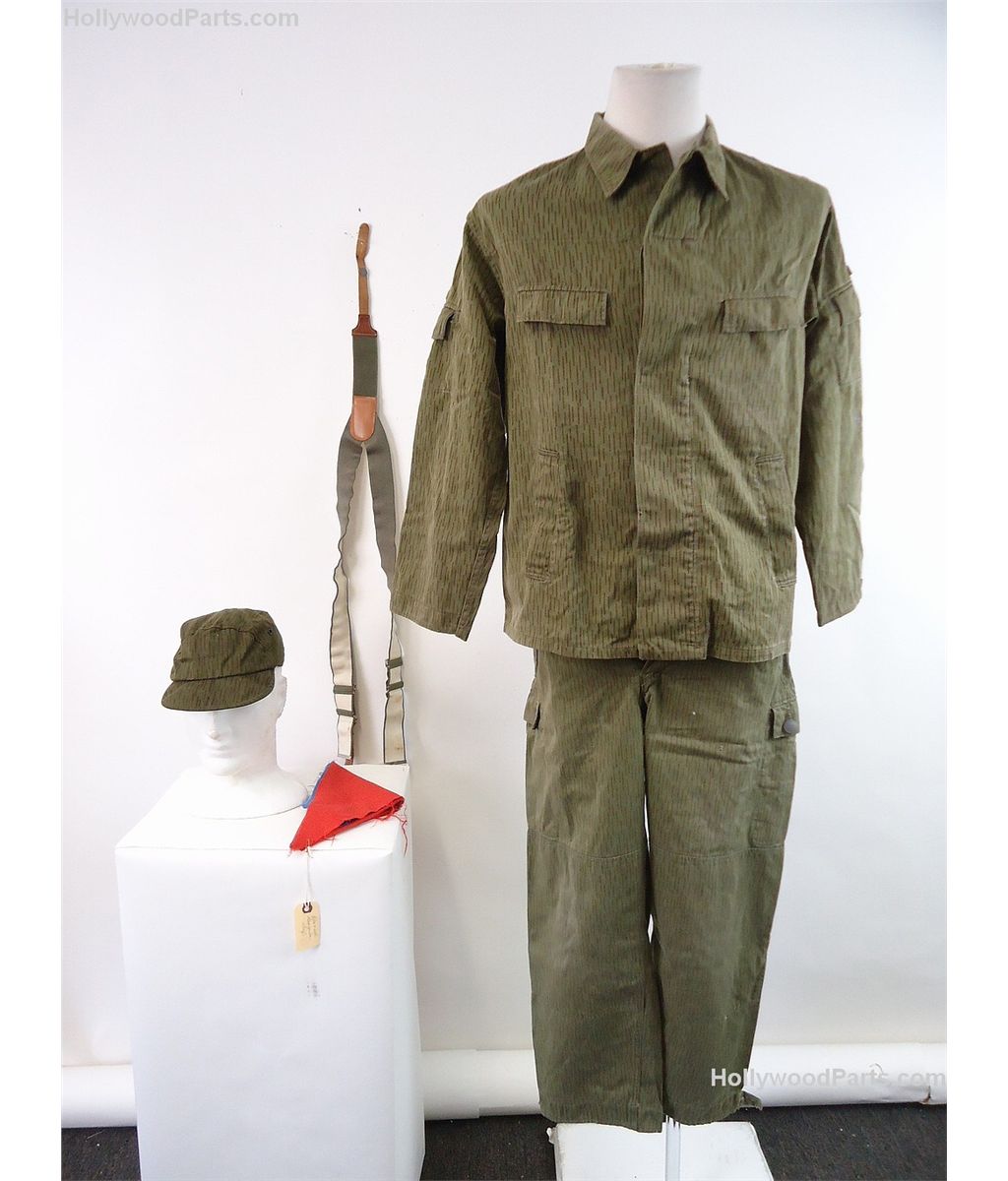 Hotel Rwanda RPF Tutsi Rebel Soldier Striped Green Uniform with Ruanda Flag. Striped uniform with suspenders, hat and flag. MGM 218265 Box 851
