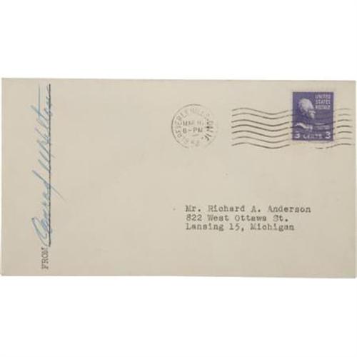 <B>Hotelier Conrad Hilton Envelope Signed</B></I> "<I>Conrad N. Hilton</B></I>". 6.5" x 3.75", postmarked Beverly Hills, California, March 11, 1954, signed vertically at the left margin, envelope toned with age, else near fine. Conrad Nicholson Hilton, Sr. (1887-1979) was the founder of the Hilton Hotel chain, and the great-grandfather of celebutant, Paris Hilton. <BR><BR><b>Shipping:</b> Flat Material, Small (<a target="_blank" href="http://www.heritageauctions.com/common/shipping.php">view shipping information</a>)