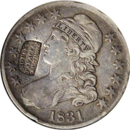 <B>(1836) Counterstamped 1831 Bust Half Dollar, VF35 NGC.</B></I> HT-141, Brunk H-799. "Houck's Panacea Baltimore, Md" Frederick, Maryland, native Dr. Jacob Houck used whatever coins were handy to promote his panacea, likely during the 1836-37 Hard Times period. A similar piece in VF20 brought over $1,000 in our September 2006 sale (lot 6631). The grading services seem to grade the coin rather than the counterstamp; we grade the stamp as an Extremely Fine, with all letters readable.<BR><BR><b>Shipping:</b> Coins & Currency (<a target="_blank" href="http://www.heritageauctions.com/common/shipping.php">view shipping information</a>)