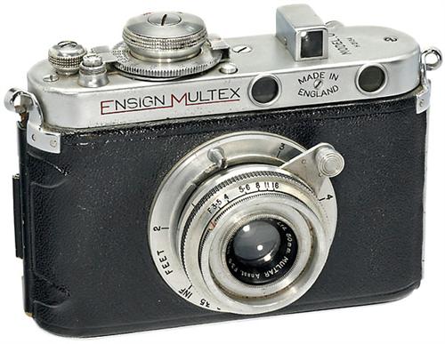 Ensign Multex Model. O", 1937 Houghton, London, Nr. H 21134, Format 3 x 4 cm auf 127er Film. Multar Anastigmat 3,5/50 mm, Schlitzverschluß 1/2-1/1000 Sek., zweiter Verschlußvorhang hängt, gekuppelter Entfernungsmesser. Mit Tasche. - Seltene Kamera.