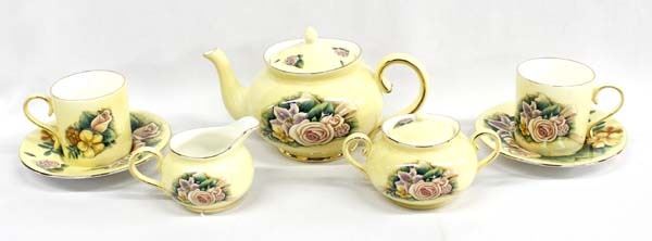 Hour of Power Fine Bone China Tea Set for Two, teapot measures 7'' x 4.5'' x 4.5'', 1970-2002 ''...And the greatest of these is Love.'' 1st Corinthians 13:13, gold gilt and floral pattern