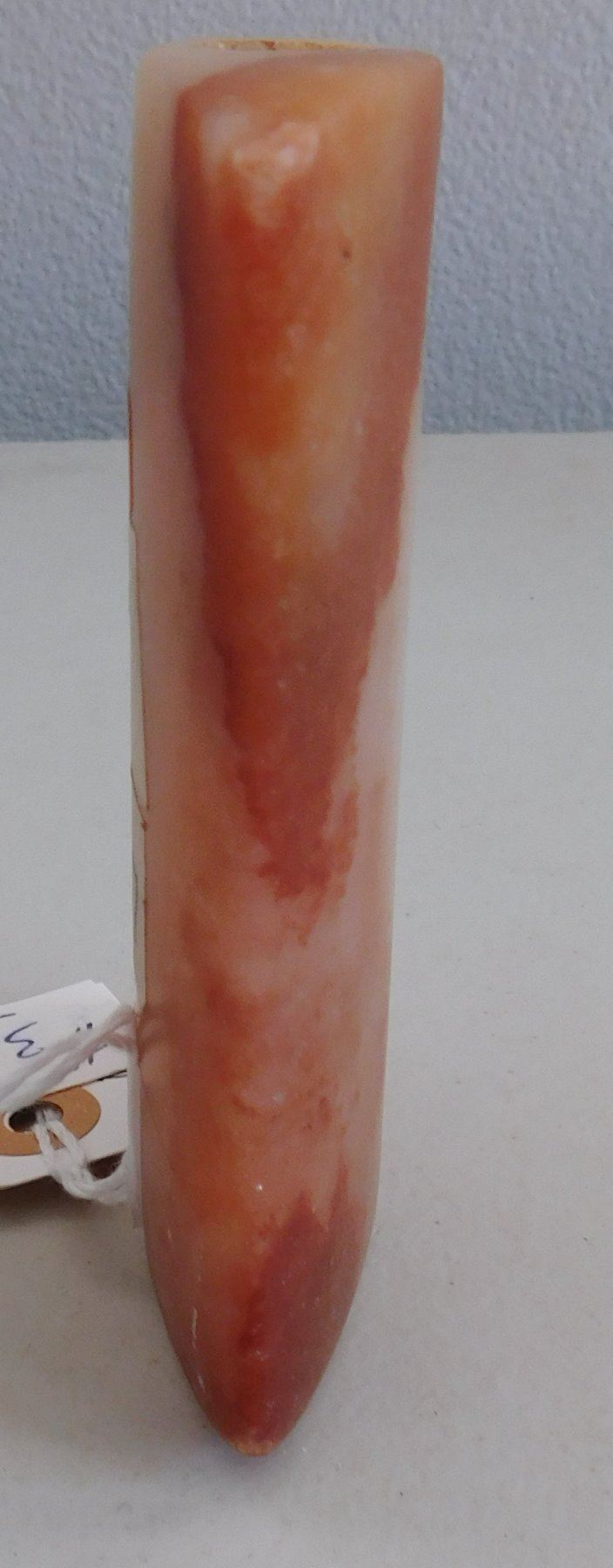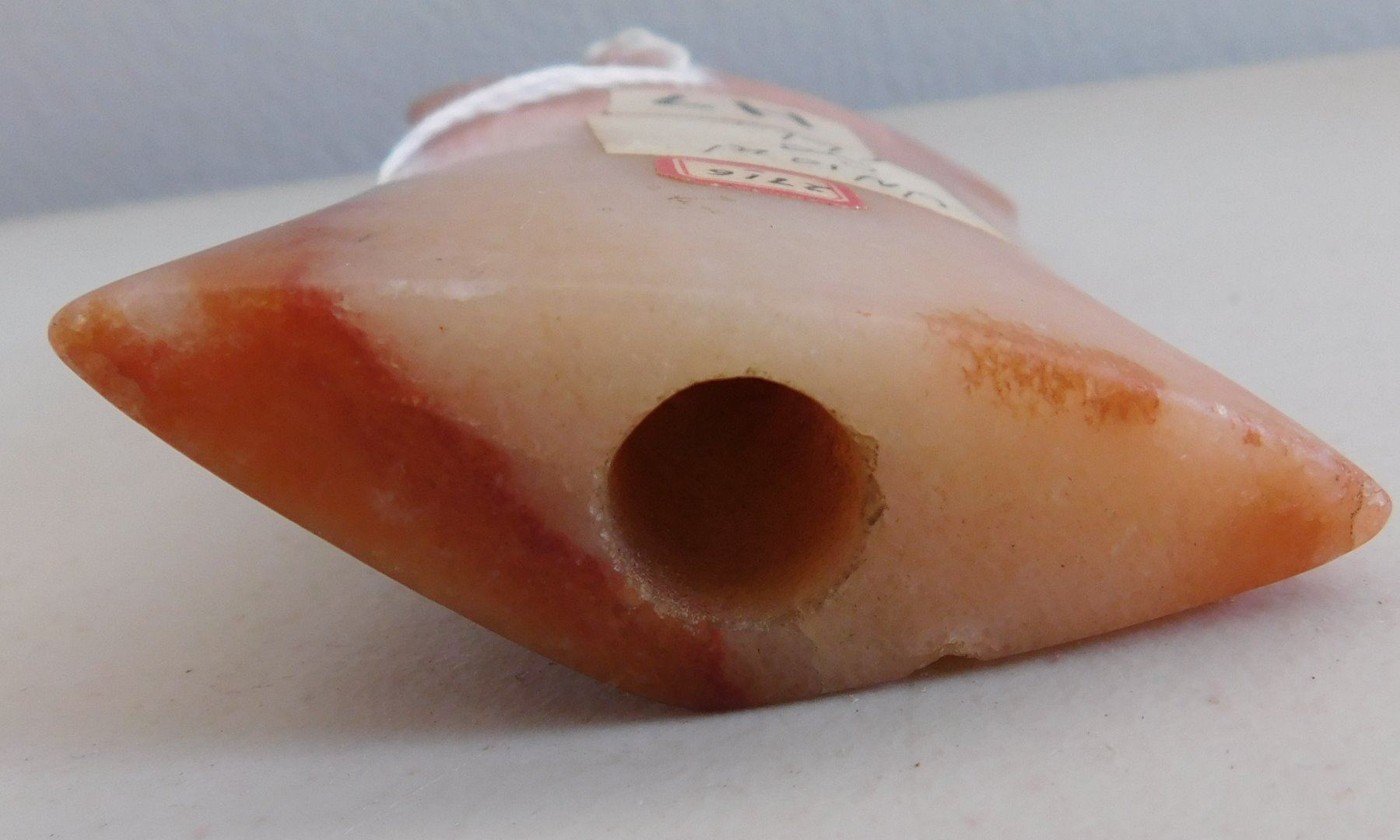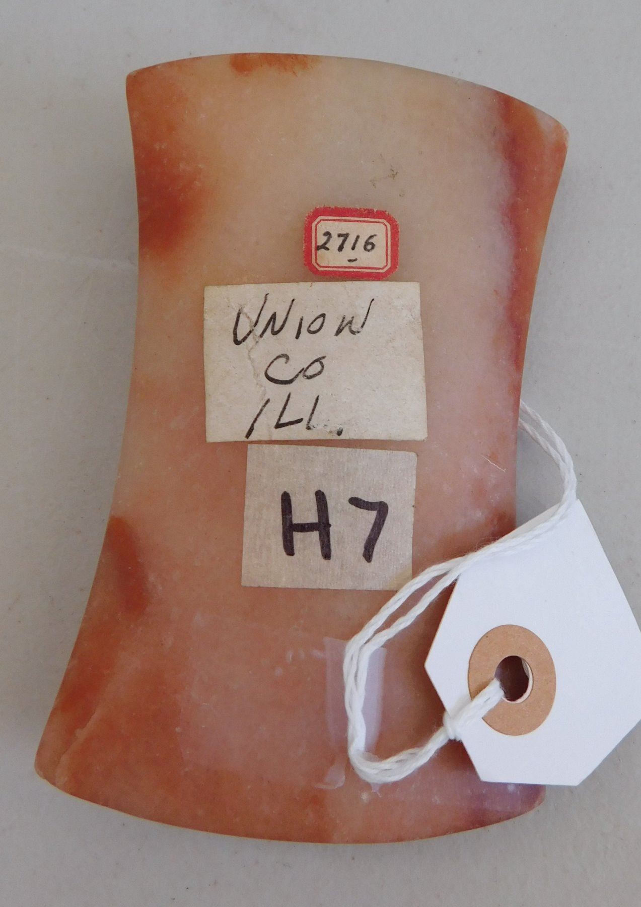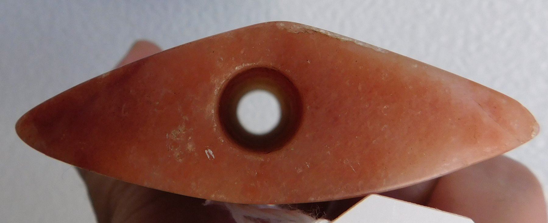 Hourglass Bannerstone, archaic period. Made of red and white quartz, the item measures 4 1/2" x 3 3/4". Union County, Illinois. Translucent, great color. Condition: Very good, see images. Shipping: $18.50 w/insurance and signature.