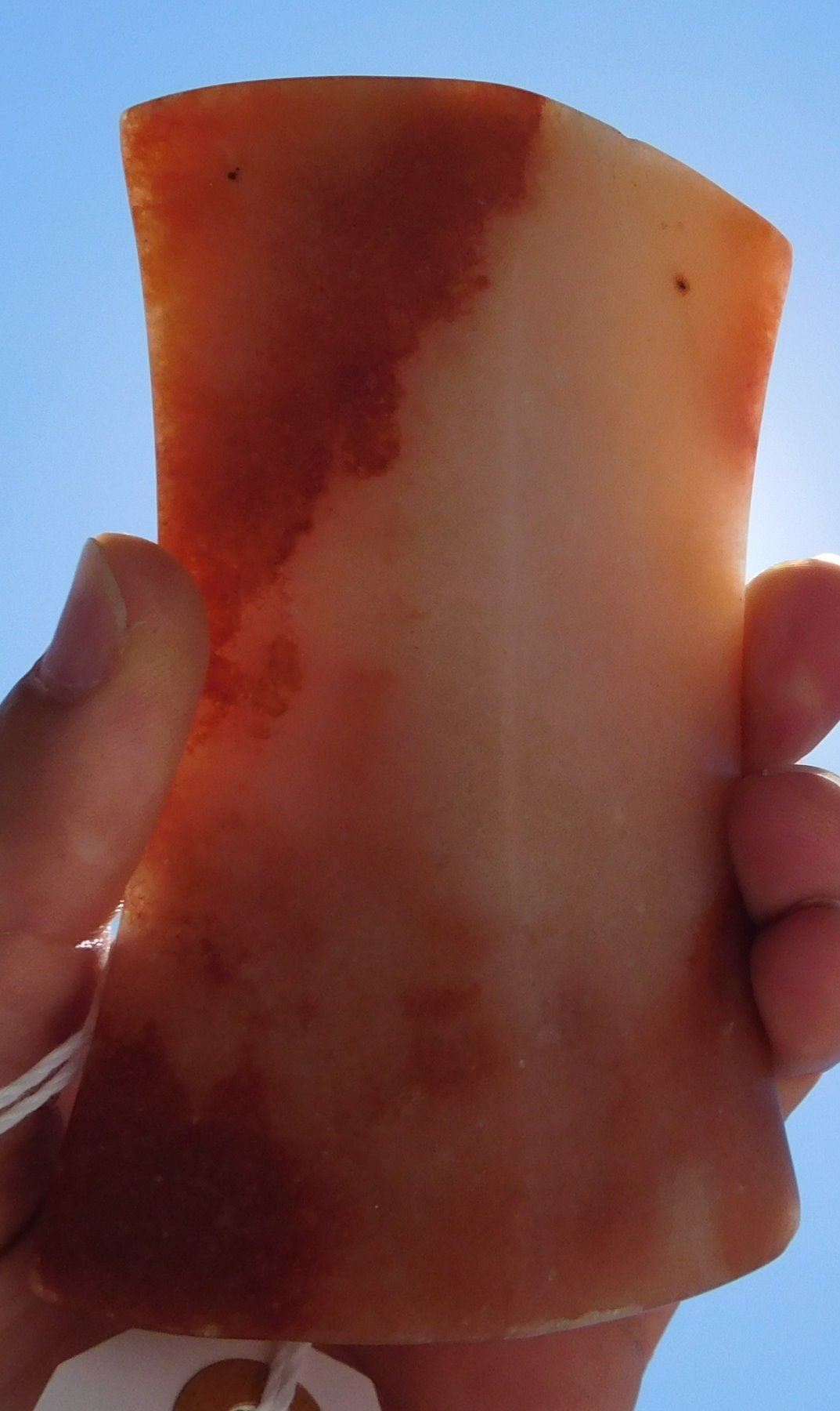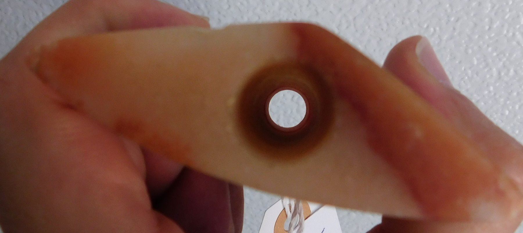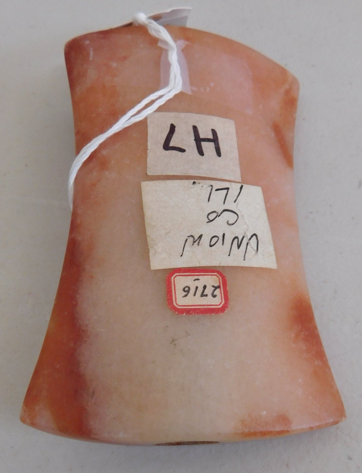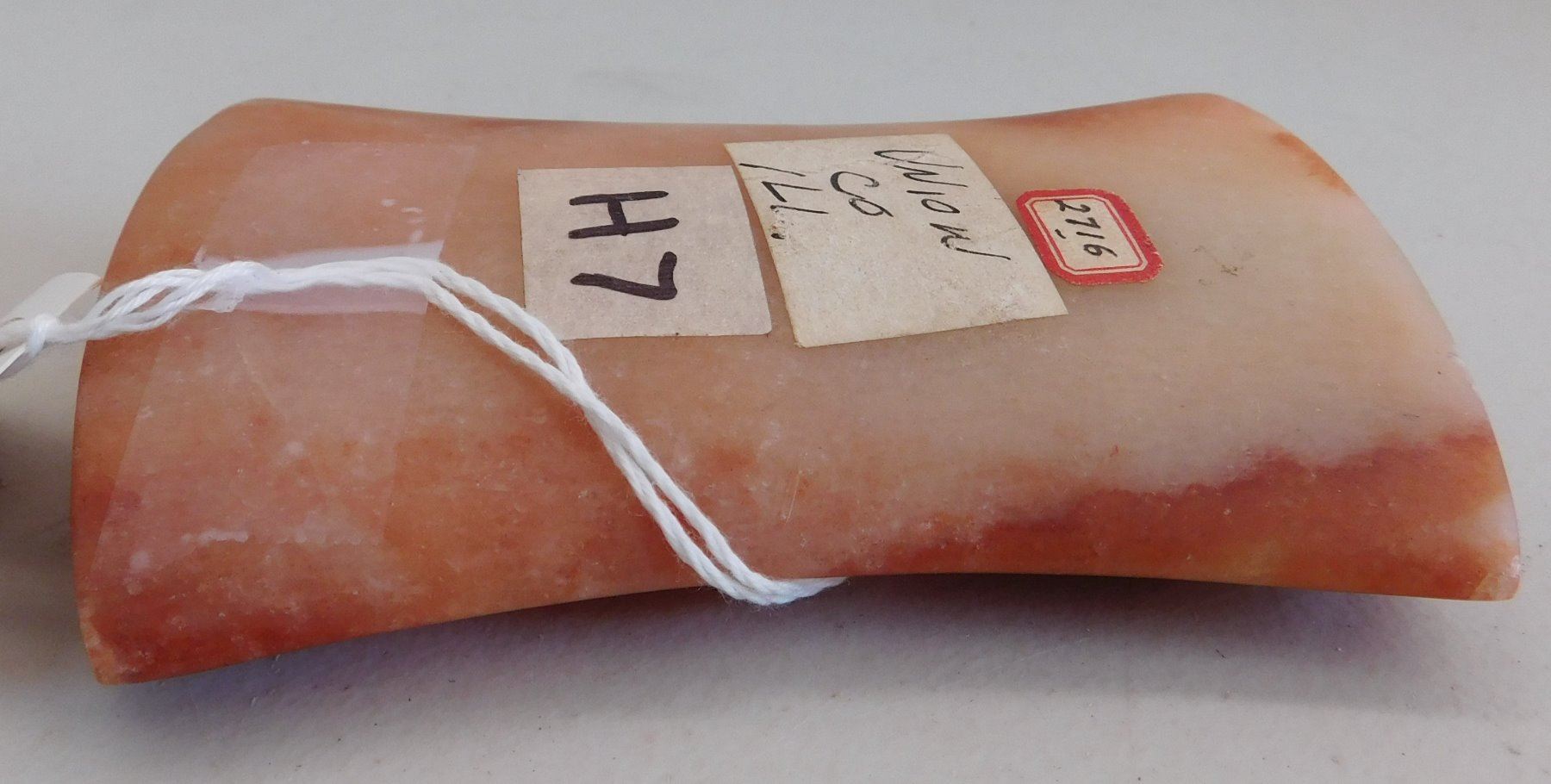 Hourglass Bannerstone, archaic period. Made of red and white quartz, the item measures 4 1/2" x 3 3/4". Union County, Illinois. Translucent, great color. Condition: Very good, see images. Shipping: $18.50 w/insurance and signature.
