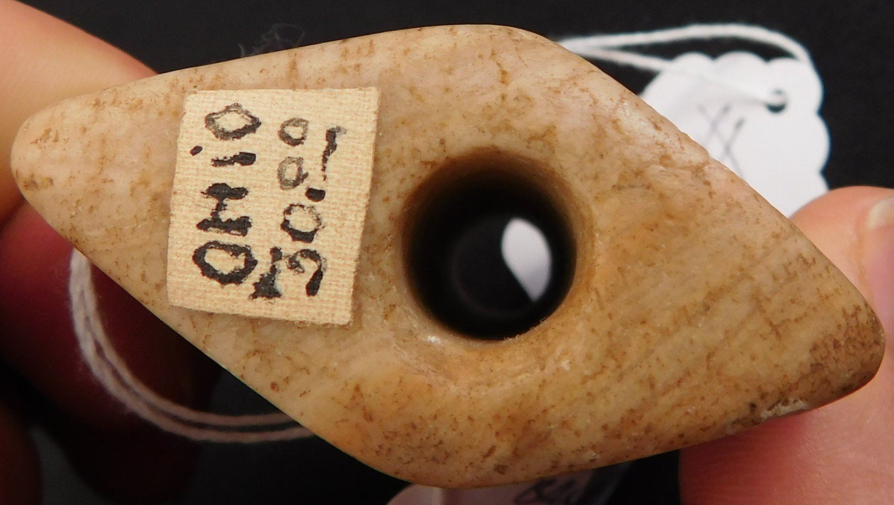 Hourglass Bannerstone, pre-historic item. Made of quartz, the item measures 2" x 1" x 2 1/2". Ohio. Ex-Earl Townsend. Condition: Good, chipped, see images. Shipping: $16.50 w/insurance and signature.