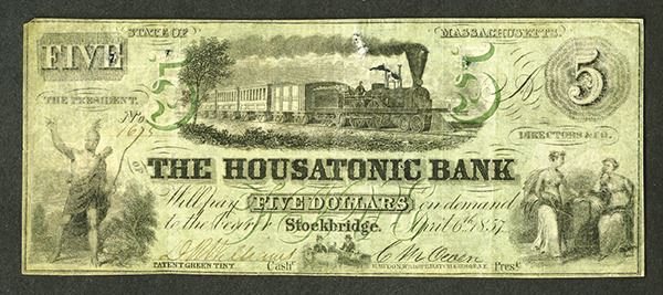 Stockbridge, MA. $5, Issued banknote, Black on light green underprint, Native American at left, locomotive L-R top middle and arms lower right, back blank, 5 small holes in various places with the appearance of Fine, still a very attractive note, RWH&E.