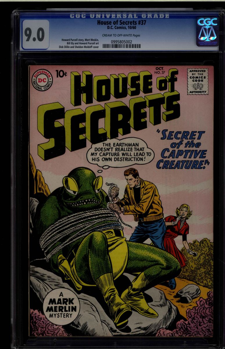 House Of Secrets #37 CGC 9.0 Cream to Off-White. Howard Purcell story Mort Meskin, Bill Ely and Howard Purcell art. Dick Dillin and Sheldon Moldoff cover. Overstreet 2009 VF/NM 9.0 value = $107. CGC census: 1 at 9.0, 1 higher.