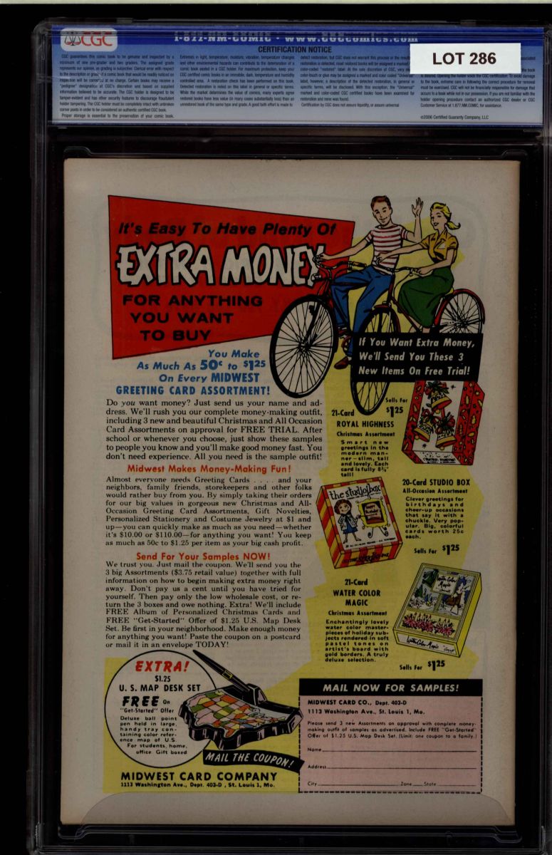 The Auctioneer has reserved the right to reject any and all bids, and to bid at the auction. Auctioneers Auctions are not on approval. Auctioneer does not allow certified material to be returned because of possible differences of opinion with respect to the grade offered by any third party organization, dealer, or service. Absolutely no guarantee of grade is offered for un-certified property sold and subsequently submitted to a third-party grading service. There will be no exceptions to this policy. Under extremely limited circumstances, (e.g. gross cataloging error) a purchaser, who did not bid from the floor, may request Auctioneer to evaluate voiding a sale; such request must be made in writing detailing the alleged gross error, and submission of the lot to the Auctioneer must be pre-approved by the Auctioneer. Bidder must notify Auctioneer in writing of such request within three (3) days of the non-floor bidder receipt of the lot. Any lot that is to be evaluated must be in our offices within 30 days after Auction. Grading does not qualify for this evaluation process nor do such complaints constitute a basis to challenge the authenticity of a lot. AFTER THAT 30-DAY PERIOD, NO LOTS MAY BE RETURNED FOR REASONS OTHER THAN AUTHENTICITY. Lots returned must be housed intact in the original holder. No lots purchased by floor Bidders may be returned (including those Bidders acting as agents for others). Late remittance for purchases may be considered just cause to revoke all return privileges. B: Auctions conducted solely on the Internet have a THREE (3) DAY RETURN POLICY: Lots paid for within seven days of the Auction closing are sold with a three (3) day return privilege. You may return lots under the following conditions: Within three days of receipt of the lot, you must first notify Auctioneer by contacting Client Service by phone (314-680-8599) or e-mail (moundcityauctions@gmail.com), and immediately mail the lot(s) fully insured to the attention of Returns, Mound City Auctions 1081 Teson Rd. Hazelwood, MO. 63042. Lots must be housed intact in their original holder and in their original condition. You are responsible for the insured, safe delivery of any lots. Auctioneer will not be responsible for lots returned in non-registered mail or lots returned without prior authorization per section B. A non-negotiable return fee of 5% of the purchase price ($10 per lot minimum) will be deducted from the refund for each returned lot or billed directly. Postage and handling fees are not refunded. After the three-day period (from receipt), no items may be returned for any reason. Late remittance for purchases revokes all Return-Restock privileges. C: Bidders who have inspected the lots prior to the auction will not be granted any return privileges. D: Comic books sold referencing a third-party grading service are sold “as is” without any express or implied warranty. Certain warranties may be available from the grading services and the Bidder is referred to them for further details: Certified Guaranty Company, LLC. (CGC), P.O. Box 4738, Sarasota, FL 34230. E: Bidders who intend to challenge authenticity or provenance of a lot must notify Auctioneer in writing within thirty (30) days of the Auctions conclusion. In the event Auctioneer cannot deliver the lot or subsequently it is established that the lot lacks title, provenance, authenticity, or other transfer or condition issue is claimed, Auctioneer's liability shall be limited to rescission of sale and refund of purchase price; in no case shall Auctioneer's maximum liability exceed the high bid on that lot, which bid shall be deemed for all purposes the value of the lot. After one year has elapsed, Auctioneer's maximum liability shall be limited to any commissions and fees Auctioneer earned on that lot. F: All comics are guaranteed genuine, but are not guaranteed as to grade, since grading is a matter of opinion, an art and not a science, and therefore the opinion rendered by the Auctioneer or any third party grading service may not agree with the opinion of others (including trained experts), and the same expert may not grade the same item with the same grade at two different times. G: Since we cannot examine encapsulated comics, they are sold “as is”without our grading opinion, and may not be returned for any reason. Auctioneer shall not be liable for any patent or latent defect or controversy pertaining to or arising from any encapsulated collectible. In any such instance, purchaser's remedy, if any, shall be solely against the service certifying the collectible. H: Due to changing grading standards over time, differing interpretations, and to possible mishandling of items by subsequent owners, Auctioneer reserves the right to grade items differently than shown on certificates from any grading service that accompany the items. Auctioneer also reserves the right to grade items differently than the grades shown in the prior catalog should such items be reconsigned to any future auction. I: Although consensus grading is employed by most grading services, it should be noted as aforesaid that grading is not an exact science. In fact, it is entirely possible that if a lot is broken out of a plastic holder and resubmitted to another grading service or even to the same service, the lot could come back with a different grade assigned. J: Certification does not guarantee protection against the normal risks associated with potentially volatile markets. The degree of liquidity for certified collectibles will vary according to general market conditions and the particular lot involved. For some lots there may be no active market at all at certain points in time."
