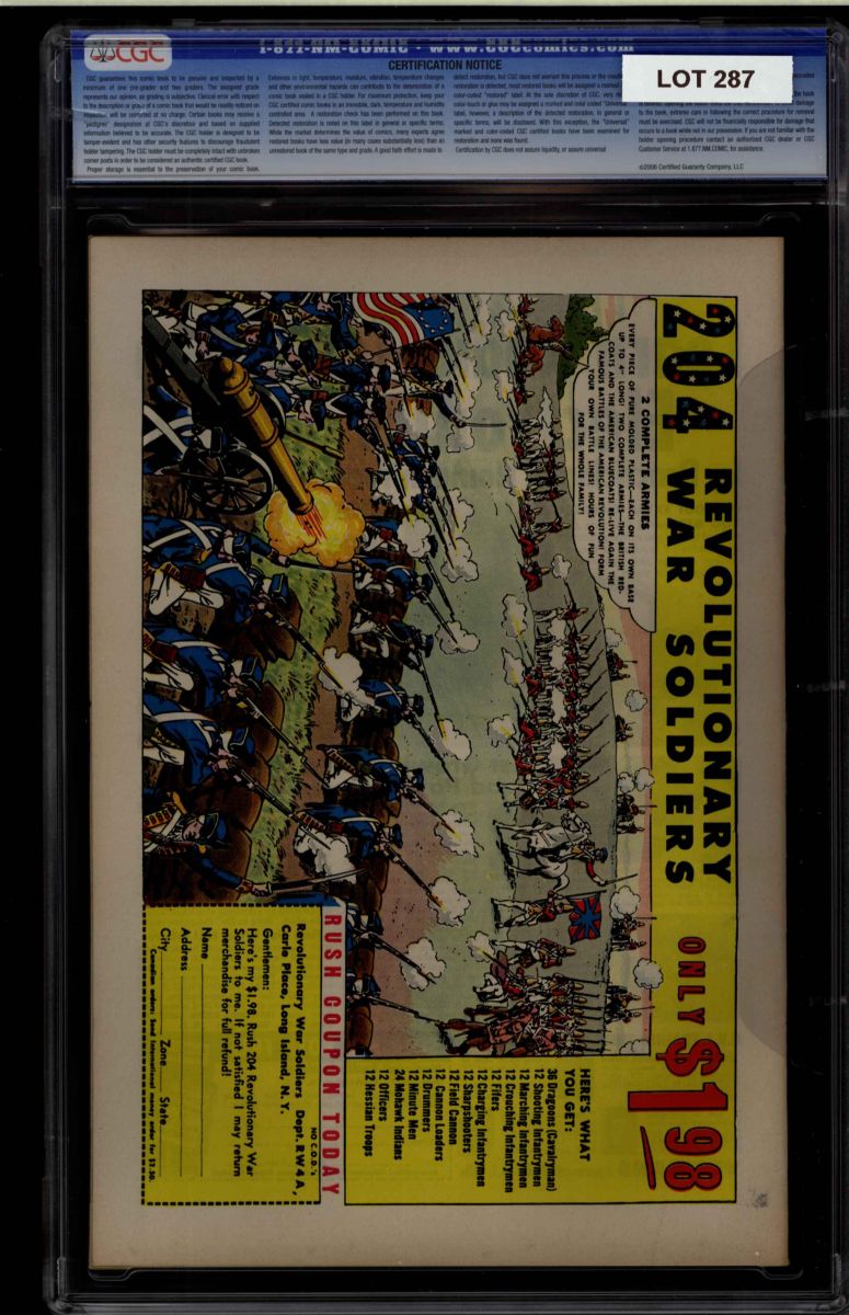 The Auctioneer has reserved the right to reject any and all bids, and to bid at the auction. Auctioneers Auctions are not on approval. Auctioneer does not allow certified material to be returned because of possible differences of opinion with respect to the grade offered by any third party organization, dealer, or service. Absolutely no guarantee of grade is offered for un-certified property sold and subsequently submitted to a third-party grading service. There will be no exceptions to this policy. Under extremely limited circumstances, (e.g. gross cataloging error) a purchaser, who did not bid from the floor, may request Auctioneer to evaluate voiding a sale; such request must be made in writing detailing the alleged gross error, and submission of the lot to the Auctioneer must be pre-approved by the Auctioneer. Bidder must notify Auctioneer in writing of such request within three (3) days of the non-floor bidder receipt of the lot. Any lot that is to be evaluated must be in our offices within 30 days after Auction. Grading does not qualify for this evaluation process nor do such complaints constitute a basis to challenge the authenticity of a lot. AFTER THAT 30-DAY PERIOD, NO LOTS MAY BE RETURNED FOR REASONS OTHER THAN AUTHENTICITY. Lots returned must be housed intact in the original holder. No lots purchased by floor Bidders may be returned (including those Bidders acting as agents for others). Late remittance for purchases may be considered just cause to revoke all return privileges. B: Auctions conducted solely on the Internet have a THREE (3) DAY RETURN POLICY: Lots paid for within seven days of the Auction closing are sold with a three (3) day return privilege. You may return lots under the following conditions: Within three days of receipt of the lot, you must first notify Auctioneer by contacting Client Service by phone (314-680-8599) or e-mail (moundcityauctions@gmail.com), and immediately mail the lot(s) fully insured to the attention of Returns, Mound City Auctions 1081 Teson Rd. Hazelwood, MO. 63042. Lots must be housed intact in their original holder and in their original condition. You are responsible for the insured, safe delivery of any lots. Auctioneer will not be responsible for lots returned in non-registered mail or lots returned without prior authorization per section B. A non-negotiable return fee of 5% of the purchase price ($10 per lot minimum) will be deducted from the refund for each returned lot or billed directly. Postage and handling fees are not refunded. After the three-day period (from receipt), no items may be returned for any reason. Late remittance for purchases revokes all Return-Restock privileges. C: Bidders who have inspected the lots prior to the auction will not be granted any return privileges. D: Comic books sold referencing a third-party grading service are sold “as is” without any express or implied warranty. Certain warranties may be available from the grading services and the Bidder is referred to them for further details: Certified Guaranty Company, LLC. (CGC), P.O. Box 4738, Sarasota, FL 34230. E: Bidders who intend to challenge authenticity or provenance of a lot must notify Auctioneer in writing within thirty (30) days of the Auctions conclusion. In the event Auctioneer cannot deliver the lot or subsequently it is established that the lot lacks title, provenance, authenticity, or other transfer or condition issue is claimed, Auctioneer's liability shall be limited to rescission of sale and refund of purchase price; in no case shall Auctioneer's maximum liability exceed the high bid on that lot, which bid shall be deemed for all purposes the value of the lot. After one year has elapsed, Auctioneer's maximum liability shall be limited to any commissions and fees Auctioneer earned on that lot. F: All comics are guaranteed genuine, but are not guaranteed as to grade, since grading is a matter of opinion, an art and not a science, and therefore the opinion rendered by the Auctioneer or any third party grading service may not agree with the opinion of others (including trained experts), and the same expert may not grade the same item with the same grade at two different times. G: Since we cannot examine encapsulated comics, they are sold “as is”without our grading opinion, and may not be returned for any reason. Auctioneer shall not be liable for any patent or latent defect or controversy pertaining to or arising from any encapsulated collectible. In any such instance, purchaser's remedy, if any, shall be solely against the service certifying the collectible. H: Due to changing grading standards over time, differing interpretations, and to possible mishandling of items by subsequent owners, Auctioneer reserves the right to grade items differently than shown on certificates from any grading service that accompany the items. Auctioneer also reserves the right to grade items differently than the grades shown in the prior catalog should such items be reconsigned to any future auction. I: Although consensus grading is employed by most grading services, it should be noted as aforesaid that grading is not an exact science. In fact, it is entirely possible that if a lot is broken out of a plastic holder and resubmitted to another grading service or even to the same service, the lot could come back with a different grade assigned. J: Certification does not guarantee protection against the normal risks associated with potentially volatile markets. The degree of liquidity for certified collectibles will vary according to general market conditions and the particular lot involved. For some lots there may be no active market at all at certain points in time."