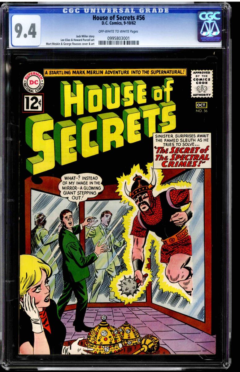 House Of Secrets #56 CGC 9.4 off-white to white pages. Jack Miller story, Lee Elias & Howard Purcell art, Mort Meskin & George Roussos cover & art. Overstreet 2009 NM 9.2 value = $120. CGC census: 1 at 9.4, none higher!