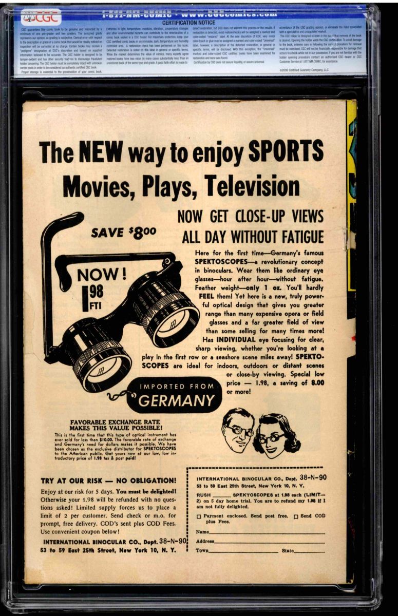The Auctioneer has reserved the right to reject any and all bids, and to bid at the auction. Auctioneers Auctions are not on approval. Auctioneer does not allow certified material to be returned because of possible differences of opinion with respect to the grade offered by any third party organization, dealer, or service. Absolutely no guarantee of grade is offered for un-certified property sold and subsequently submitted to a third-party grading service. There will be no exceptions to this policy. Under extremely limited circumstances, (e.g. gross cataloging error) a purchaser, who did not bid from the floor, may request Auctioneer to evaluate voiding a sale; such request must be made in writing detailing the alleged gross error, and submission of the lot to the Auctioneer must be pre-approved by the Auctioneer. Bidder must notify Auctioneer in writing of such request within three (3) days of the non-floor bidder receipt of the lot. Any lot that is to be evaluated must be in our offices within 30 days after Auction. Grading does not qualify for this evaluation process nor do such complaints constitute a basis to challenge the authenticity of a lot. AFTER THAT 30-DAY PERIOD, NO LOTS MAY BE RETURNED FOR REASONS OTHER THAN AUTHENTICITY. Lots returned must be housed intact in the original holder. No lots purchased by floor Bidders may be returned (including those Bidders acting as agents for others). Late remittance for purchases may be considered just cause to revoke all return privileges. B: Auctions conducted solely on the Internet have a THREE (3) DAY RETURN POLICY: Lots paid for within seven days of the Auction closing are sold with a three (3) day return privilege. You may return lots under the following conditions: Within three days of receipt of the lot, you must first notify Auctioneer by contacting Client Service by phone (314-680-8599) or e-mail (moundcityauctions@gmail.com), and immediately mail the lot(s) fully insured to the attention of Returns, Mound City Auctions 1081 Teson Rd. Hazelwood, MO. 63042. Lots must be housed intact in their original holder and in their original condition. You are responsible for the insured, safe delivery of any lots. Auctioneer will not be responsible for lots returned in non-registered mail or lots returned without prior authorization per section B. A non-negotiable return fee of 5% of the purchase price ($10 per lot minimum) will be deducted from the refund for each returned lot or billed directly. Postage and handling fees are not refunded. After the three-day period (from receipt), no items may be returned for any reason. Late remittance for purchases revokes all Return-Restock privileges. C: Bidders who have inspected the lots prior to the auction will not be granted any return privileges. D: Comic books sold referencing a third-party grading service are sold “as is” without any express or implied warranty. Certain warranties may be available from the grading services and the Bidder is referred to them for further details: Certified Guaranty Company, LLC. (CGC), P.O. Box 4738, Sarasota, FL 34230. E: Bidders who intend to challenge authenticity or provenance of a lot must notify Auctioneer in writing within thirty (30) days of the Auctions conclusion. In the event Auctioneer cannot deliver the lot or subsequently it is established that the lot lacks title, provenance, authenticity, or other transfer or condition issue is claimed, Auctioneer's liability shall be limited to rescission of sale and refund of purchase price; in no case shall Auctioneer's maximum liability exceed the high bid on that lot, which bid shall be deemed for all purposes the value of the lot. After one year has elapsed, Auctioneer's maximum liability shall be limited to any commissions and fees Auctioneer earned on that lot. F: All comics are guaranteed genuine, but are not guaranteed as to grade, since grading is a matter of opinion, an art and not a science, and therefore the opinion rendered by the Auctioneer or any third party grading service may not agree with the opinion of others (including trained experts), and the same expert may not grade the same item with the same grade at two different times. G: Since we cannot examine encapsulated comics, they are sold “as is”without our grading opinion, and may not be returned for any reason. Auctioneer shall not be liable for any patent or latent defect or controversy pertaining to or arising from any encapsulated collectible. In any such instance, purchaser's remedy, if any, shall be solely against the service certifying the collectible. H: Due to changing grading standards over time, differing interpretations, and to possible mishandling of items by subsequent owners, Auctioneer reserves the right to grade items differently than shown on certificates from any grading service that accompany the items. Auctioneer also reserves the right to grade items differently than the grades shown in the prior catalog should such items be reconsigned to any future auction. I: Although consensus grading is employed by most grading services, it should be noted as aforesaid that grading is not an exact science. In fact, it is entirely possible that if a lot is broken out of a plastic holder and resubmitted to another grading service or even to the same service, the lot could come back with a different grade assigned. J: Certification does not guarantee protection against the normal risks associated with potentially volatile markets. The degree of liquidity for certified collectibles will vary according to general market conditions and the particular lot involved. For some lots there may be no active market at all at certain points in time."