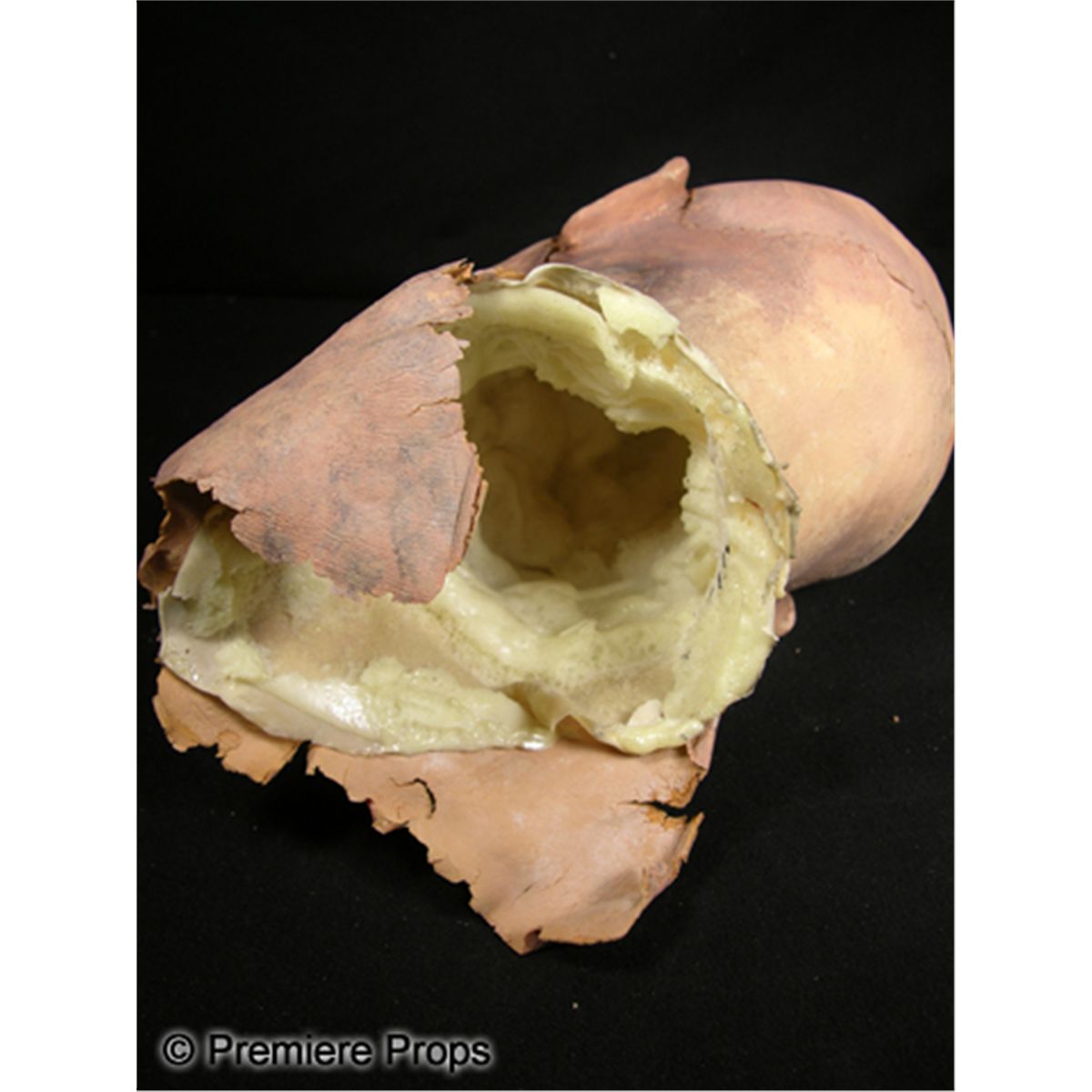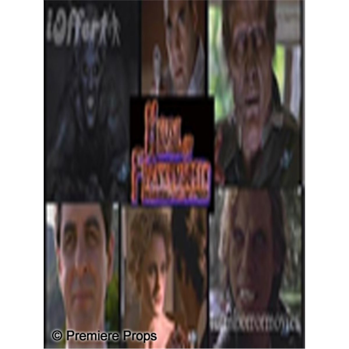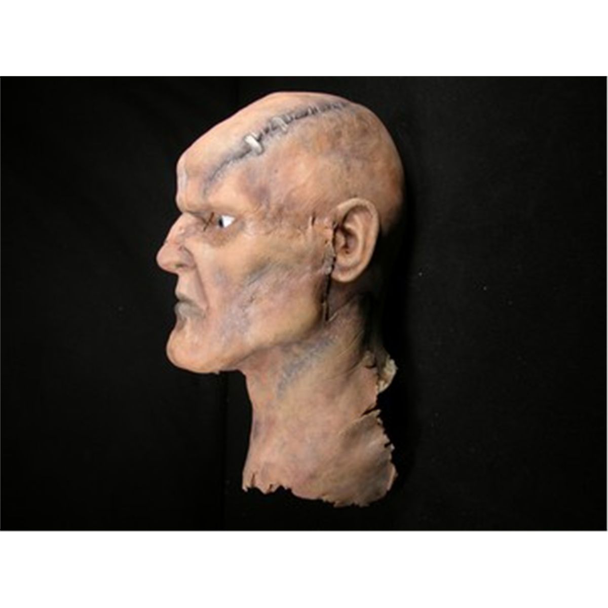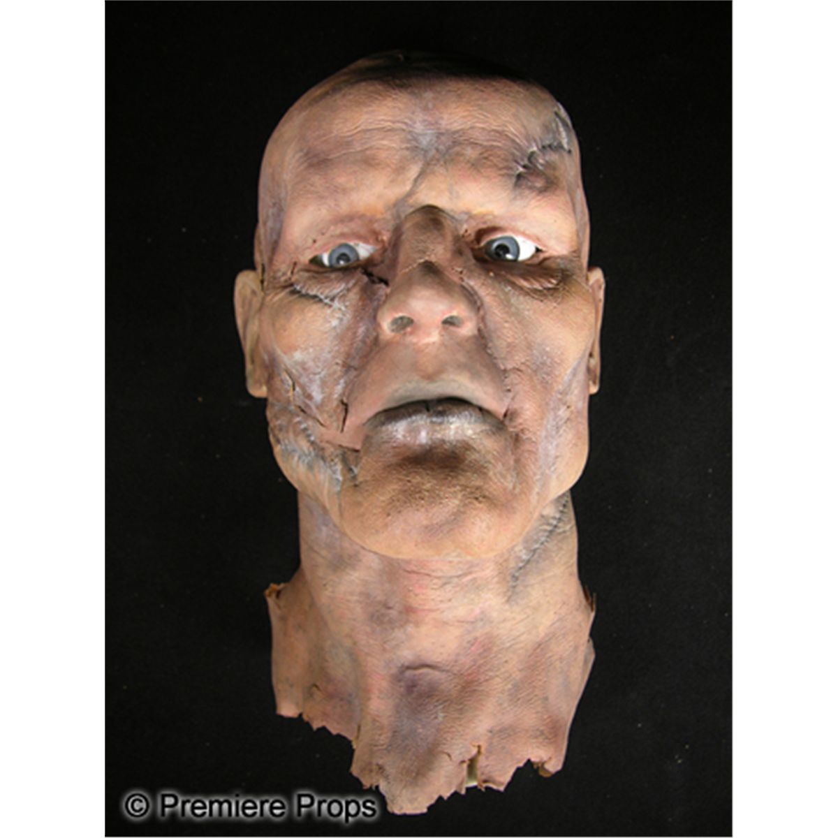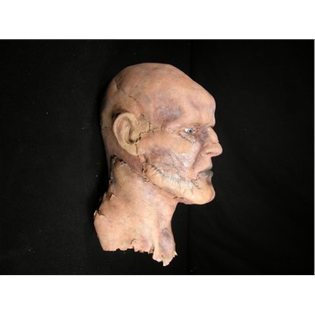 Facial makeup mounted to a bust, once worn by Peter Crombie as the Frankenstein Monster in the TV mini-series House of Frankenstein 1997. This was a Halloween special for NBC in that year and attempted to update the Universal monsters to the present day. Scars and stitches characteristic to the Monster are apparent. Oversized item. Additional postage required. (15x9x7)