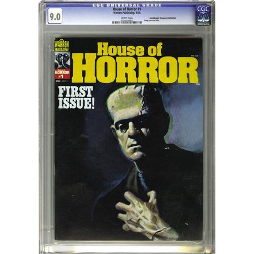 <B>House of Horror #1 (Warren, 1978) CGC VF/NM 9.0 White pages.</B></I> This is an ashcan for all intents and purposes, and it's one of the rarest Warren items. In fact, Jerry Weist called it "similar in its scarcity to <B>Eerie</B></I> #1". This mag was printed in a limited run of 400 copies, and produced strictly to secure copyright for the title. The impetus was that Publisher Jim Warren found out that British publisher Top Sellers was about to release a mag called <B>Hammer's House of Horror</B></I> in the USA, so he quickly rushed out this ashcan to beat them to the punch. According to <B>The Warren Companion</B></I>, Warren was peeved at Top Sellers anyway, because he thought their monster mags copied Warren's format in the first place! By the way, you're not missing anything by buying a slabbed copy, as the content consists of reprinted <B>Famous Monsters of Filmland</B></I> articles. And if the cover looks familiar, it's because the image (by an unknown artist) was later used for <B>Famous Monsters</B></I> #180. Weist's <B>Comic Art Price Guide</B></I> lists values of $300 in Fine and $500 in Mint condition. Not listed in Overstreet. CGC census 3/06: 1 in 9.0, 1 higher. <I>From the Don and Maggie Thompson Collection.</B></I>