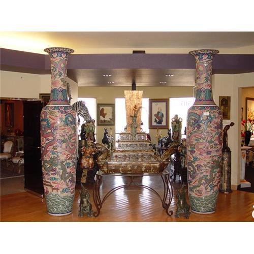 The Beauty and size of this vase is a wonder to all. The 9 Dragons bless "The House Of JOy" truly an entry way to the home conversation piece. The vibrant colors of pink, lavender, and teal dragons. The Vase is thick porcelain, is not as fragile as you might think (weighs 800 lbs) 10 feet tall. Each sold seperately.