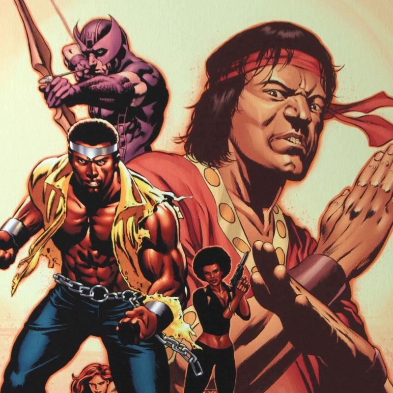 A piece of comic book history, this limited edition, from original art by Mike Perkins, depicts the characters Hawkeye, Luke Cage, and Shang Chi. Beginning with Marvel UK, Mike Perkins now regularly creates art for Spider-Man, Fantastic Four, X-Men, and Captain America. "House of M: Avengers #2" is a limited edition numbered giclee on stretched canvas by Mike Perkins presented by Marvel Comics. This piece comes gallery wrapped and ready to hang. Includes Certificate of Authenticity! Measure approx. 18" x 27" (image); 1.5" (depth).