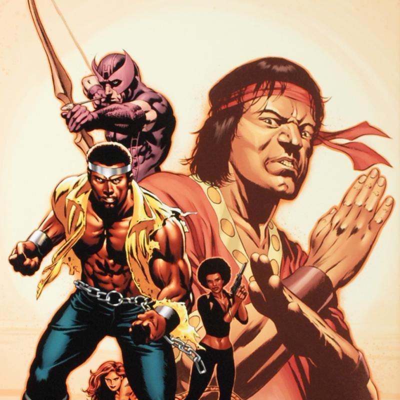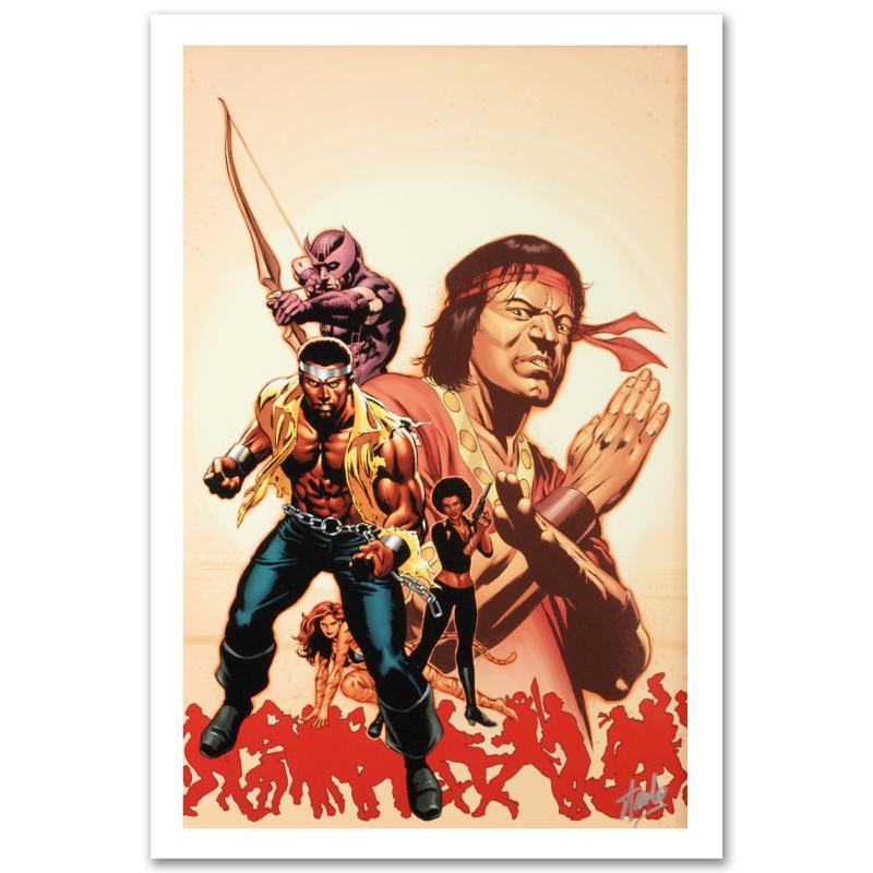 A piece of comic book history, this limited edition, from original art by Mike Perkins, depicts the characters Hawkeye, Luke Cage, and Shang Chi. Beginning with Marvel UK, Mike Perkins now regularly creates art for Spider-Man, Fantastic Four, X-Men, and Captain America. "House of M: Avengers #2" is a numbered limited edition giclee on canvas by Mike Perkins presented by Marvel Comics, hand signed by the great Stan Lee! Includes Certificate of Authenticity! Measures approx. 18" x 27" (image).