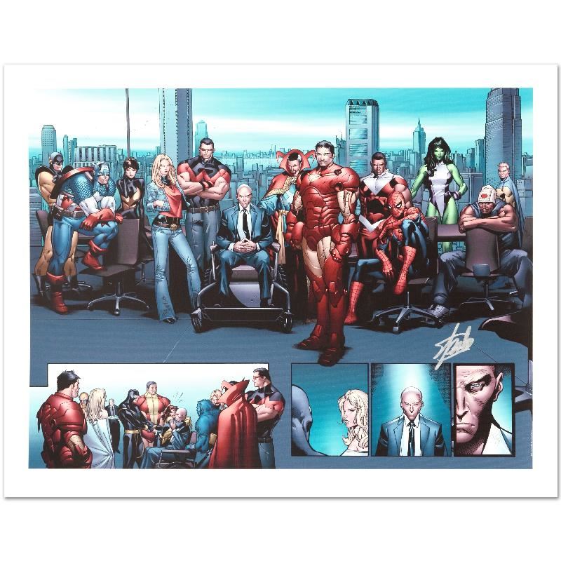 A piece of comic book history, this limited edition, from original art by Oliver Coipel, depicts Captain America, Carol Danvers, Wonder Man, Professor X, Iron Man, Spider-Man, Falcon and She Hulk. Olivier Coipel is a French comic book artist, known for his work on books such as House of M, Legion of Super-Heroes and Thor. Coipel signed an exclusive contract with Marvel Comics in January 2005. He was named in August 2005 as one of Marvel's "Young Guns," a group of artists that that included Jim Cheung, David Finch, Trevor Hairsine, Adi Granov, and Steve McNiven, which according to Marvel Editor-in-Chief Joe Quesada, exhibited the qualities that make "a future superstar penciler." "House of M MGC #1" is a limited edition giclee on canvas by Oliver Coipel presented by Marvel Comics, numbered and hand signed by the great Stan Lee! Includes Certificate of Authenticity! Measures approx. 24" x 18" (image).