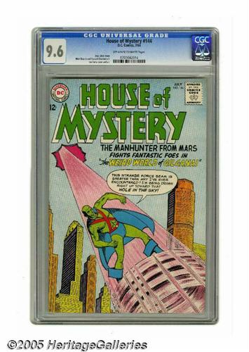 <B>House of Mystery #144 (DC, 1964) CGC NM+ 9.6 Off-white to white pages.</B></I> If you're a collector who keeps up with the J'onzzes, don't hesitate to grab the highest-graded copy CGC has certified to date of this Manhunter from Mars issue. The man who would soon be renamed the Martian Manhunter was drawn both on the cover and inside the book by Joe Certa. The issue's other two stories have art by Mort Meskin and Howard Sherman. Overstreet 2005 NM- 9.2 value = $130. CGC census 2/05: 1 in 9.6, none higher.