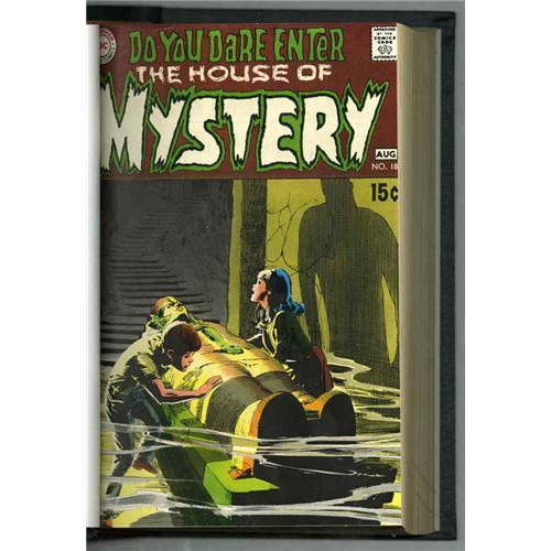 <B>House of Mystery #181-200 Bound Volume (DC, 1969-72).</B></I> Twenty great issues of DC's best in horror are featured in this superb privately bound volume. Artists include Neal Adams, Bernie Wrightson, Wally Wood, Jack Kirby, Alex Toth, Nick Cardy, Jim Aparo, and many others. Highlights include a Swamp Thing prototype story by Wrightson in #195, and many covers by Adams. Most issues appear to be in FN; however, all copies were trimmed in the binding process. The titles and issue numbers are embossed in gold on the spine, and the name of the former owner is embossed on the green leather-like cover. Overstreet 2005 VG 4.0 value for group = $186.